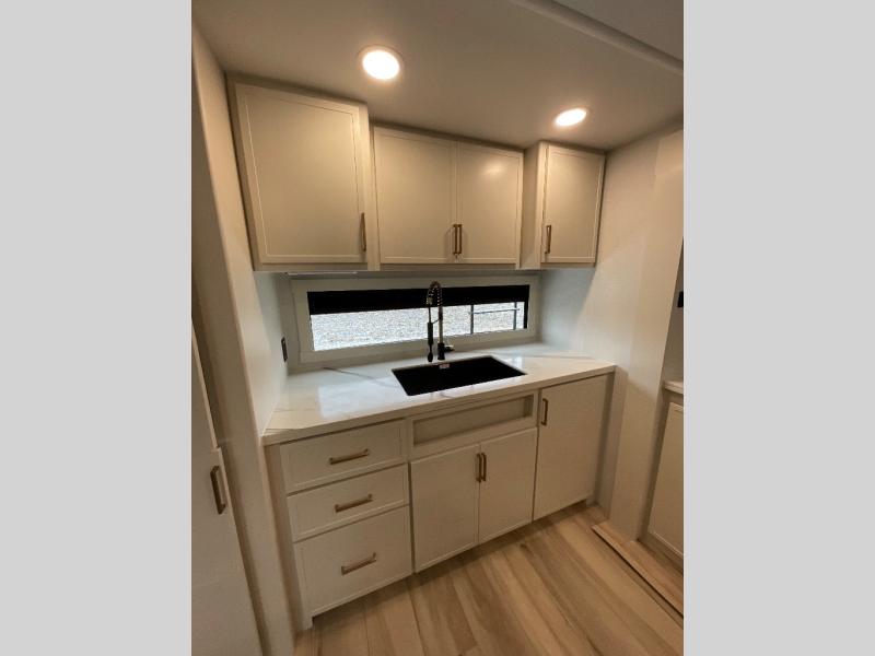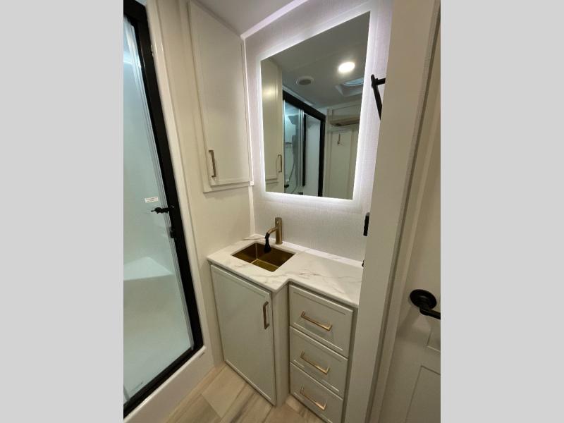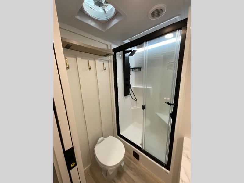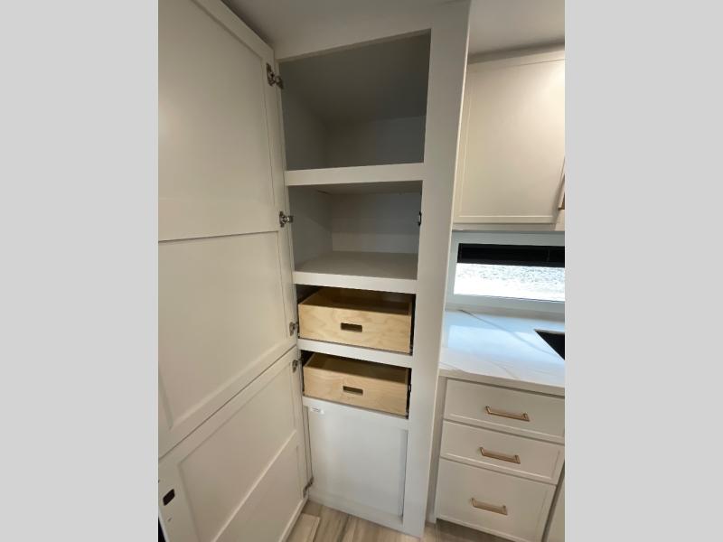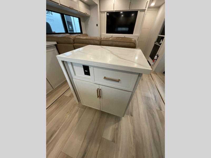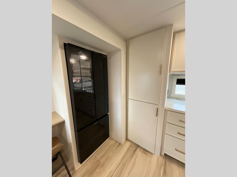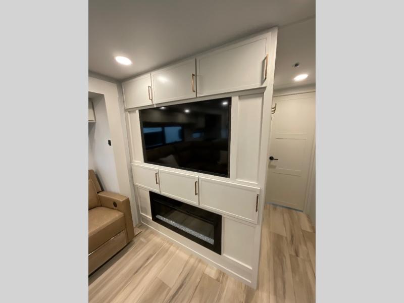 Savor the joy of cooking and sharing meals with loved ones in this beautifully appointed kitchen! This rear kitchen features a spacious pantry with drawers and outlets, a 30" convection microwave, a flip-up counter, and a 12V refrigerator. The convertible dining table and L-desk create a refined space for meals, work, and relaxation. The adjacent L-sofa forms a cozy sanctuary for reading, socializing, or enjoying the entertainment center and fireplace. There is a full bathroom with everything you need to keep your personal hygiene on the road. Plus, the front bedroom’s peaceful haven features a plush king bed, nightstands with storage, and a MaxSpace split-level wardrobe. Additionally, the two exterior awnings create a spacious outdoor living area, ideal for relaxing, entertaining, or enjoying the great outdoors.