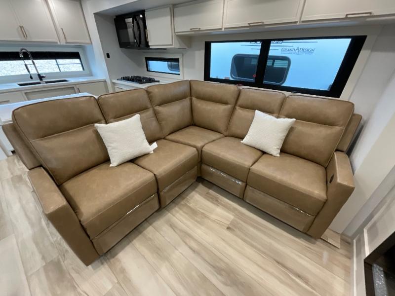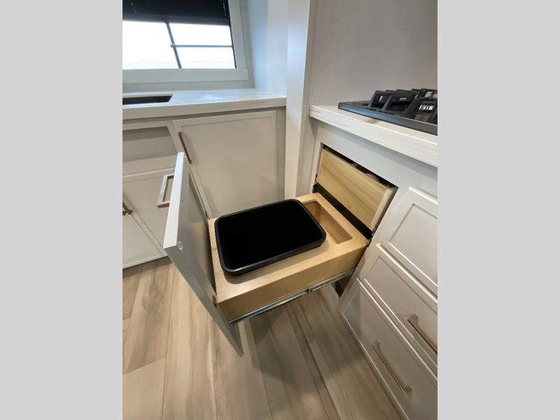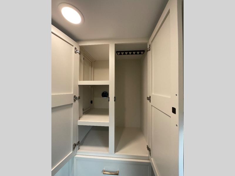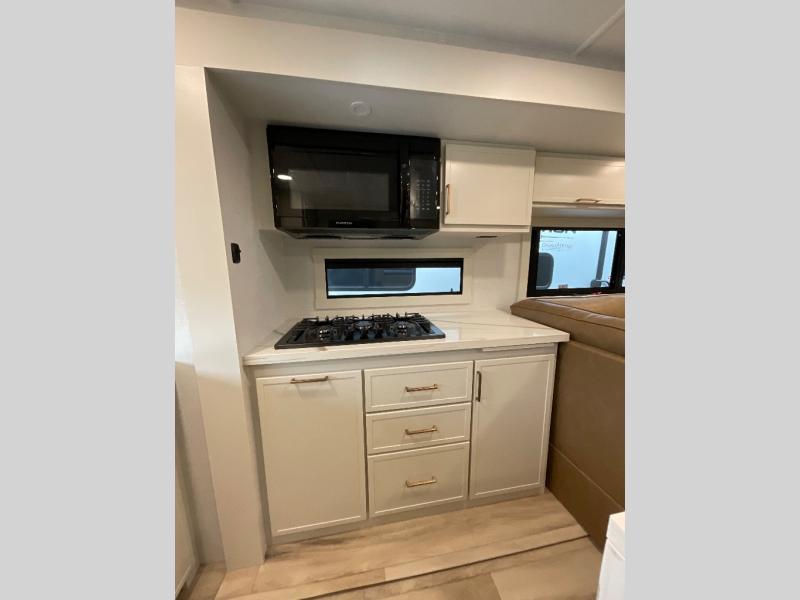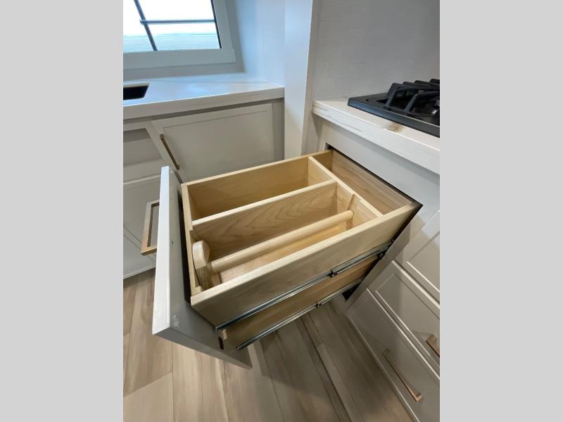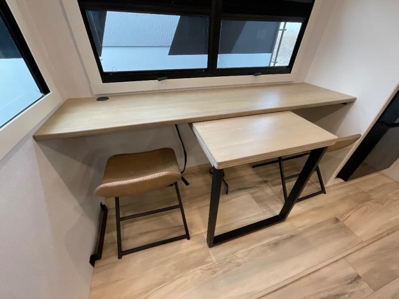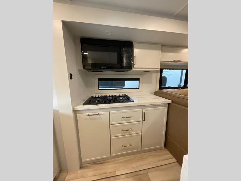 Savor the joy of cooking and sharing meals with loved ones in this beautifully appointed kitchen! This rear kitchen features a spacious pantry with drawers and outlets, a 30" convection microwave, a flip-up counter, and a 12V refrigerator. The convertible dining table and L-desk create a refined space for meals, work, and relaxation. The adjacent L-sofa forms a cozy sanctuary for reading, socializing, or enjoying the entertainment center and fireplace. There is a full bathroom with everything you need to keep your personal hygiene on the road. Plus, the front bedroom’s peaceful haven features a plush king bed, nightstands with storage, and a MaxSpace split-level wardrobe. Additionally, the two exterior awnings create a spacious outdoor living area, ideal for relaxing, entertaining, or enjoying the great outdoors.