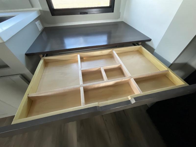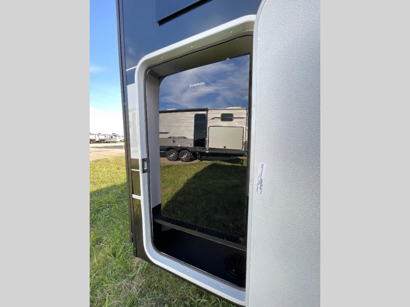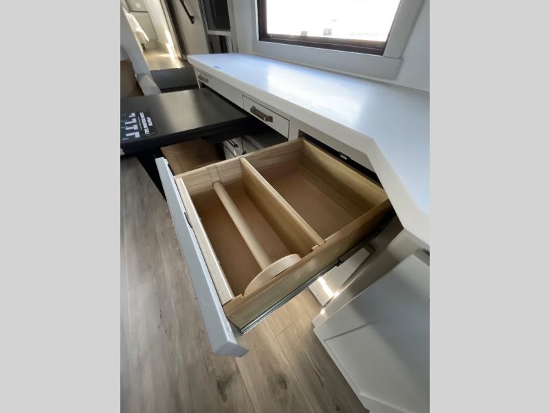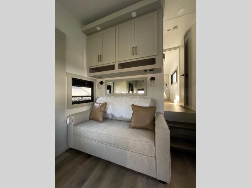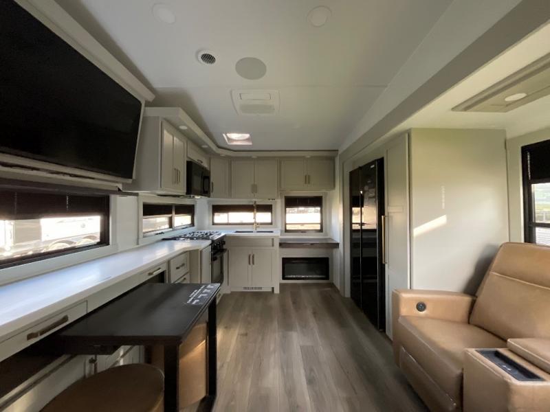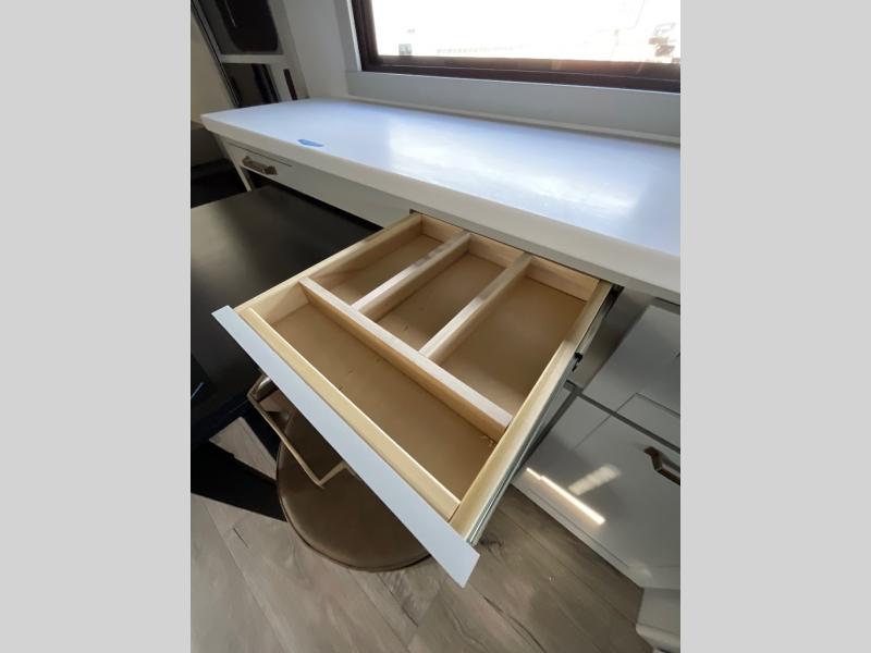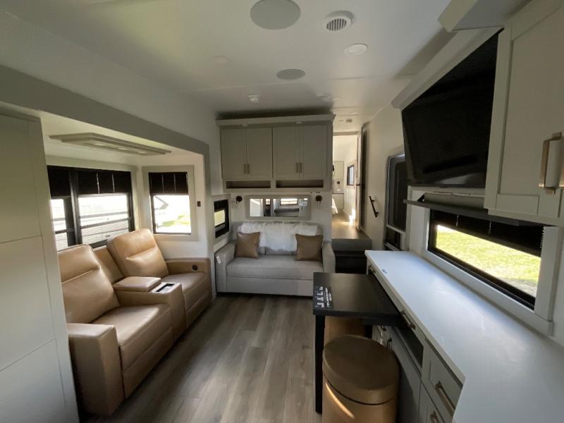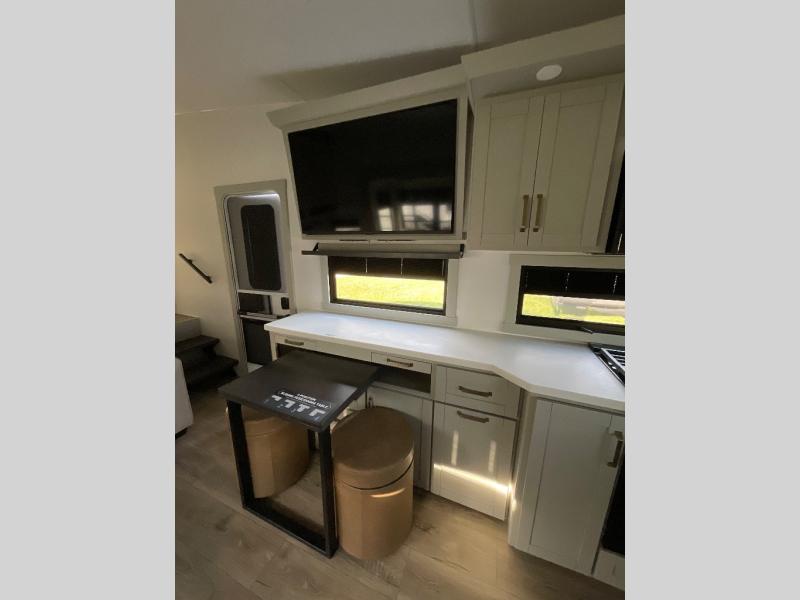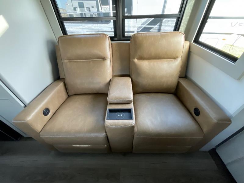 You'll love every minute spent in this spacious fifth wheel that can sleep four each night. There is a front private bedroom with a queen bed and 4x under-bed drawers to keep your space tidy. Your guests can sleep on the tri-fold sofa that extends to a 54" x 70" bed at night. The theater seating sits directly across from the 50" articulating TV for movie nights, and the pantry with drawers is right next to the theater seating for quick access to snacks! The chef of your group is sure to love the kitchen with its ample counter space, 30" residential microwave, and a sliding dining table with a drawer for even more storage. The desk in the back will allow you to get some work done if needed, or you can just spend your days outdoors under the two power awnings. There is also an exterior 12V refrigerator and storage, exterior speakers and controls, and a pass-thru storage for camp gear!