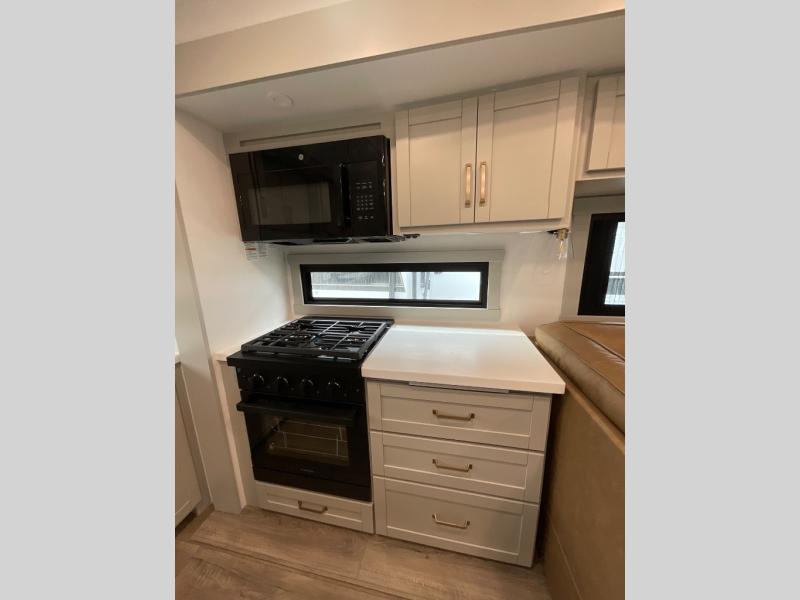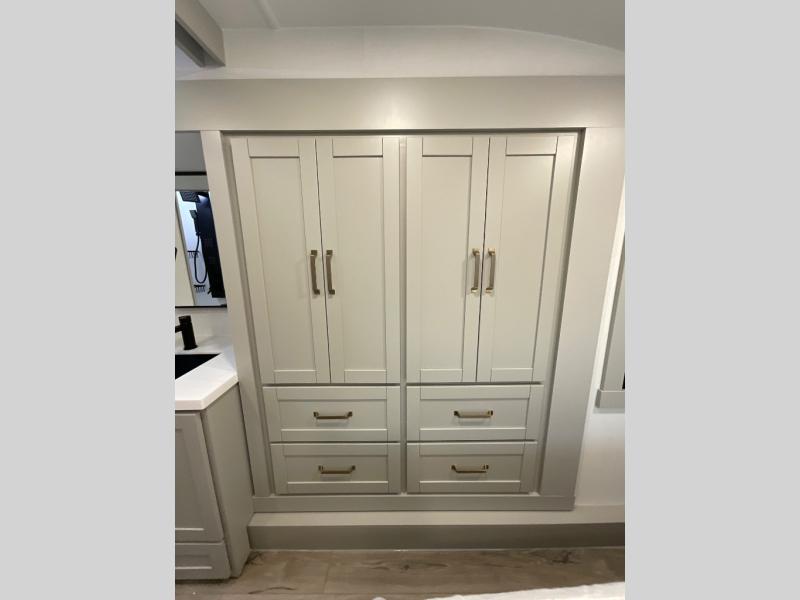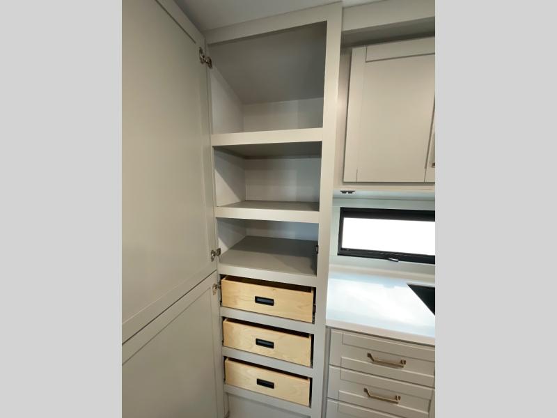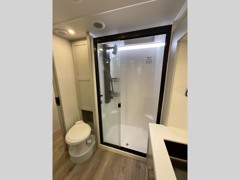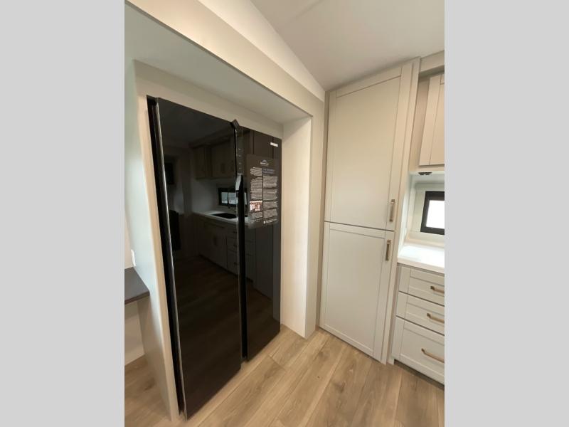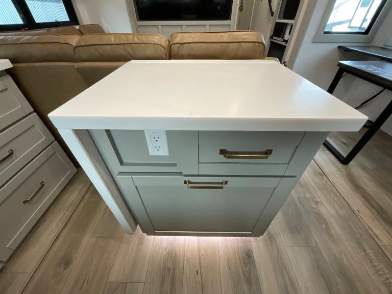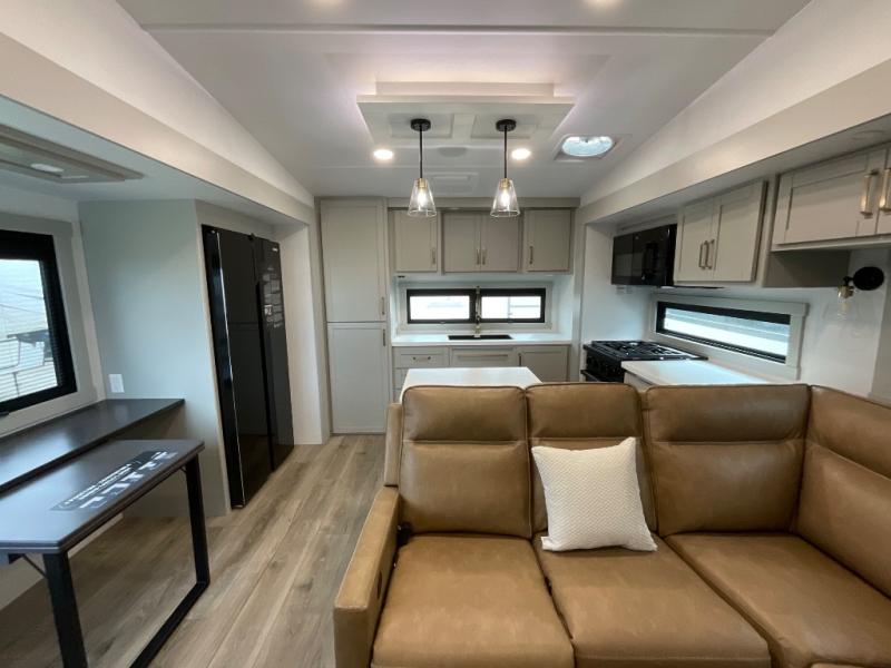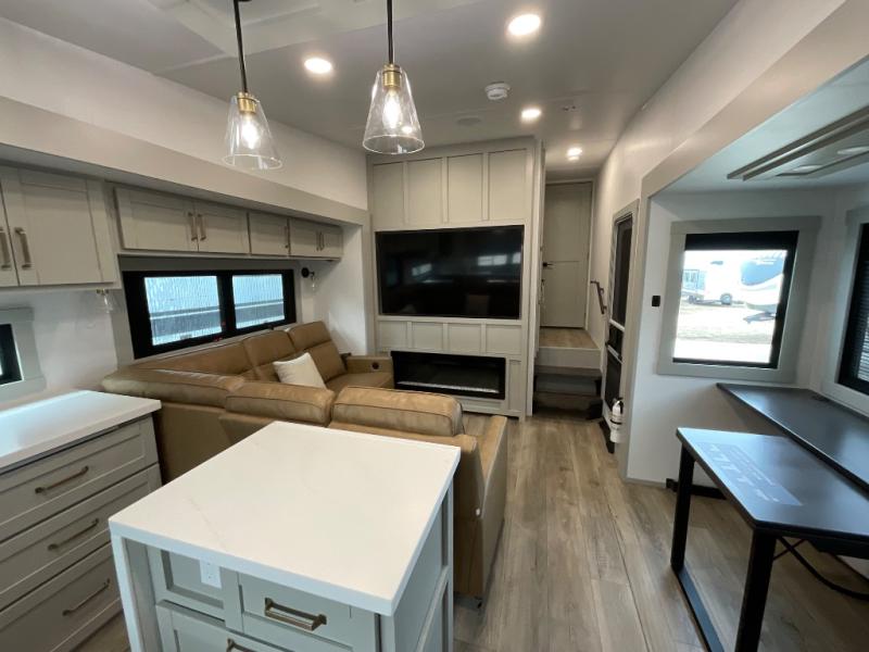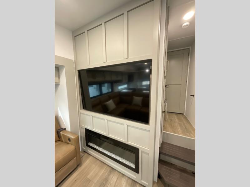 Featuring a spacious L-sofa with four recliners and a 65” articulating TV for endless entertainment, this fifth wheel is a great option to get on the road! The convertible dining table/L desk seats up to four people, making it perfect for meals, work, or play. You can cozy up by the fireplace and enjoy quality time with loved ones. Plus, ample shoe storage keeps your gear organized. The kitchen is equipped with solid surface countertops, dishwasher prep, a residential microwave, and a three-burner cooktop. Also, the large pantry with pull-out drawers provides ample storage for your favorite ingredients and cooking essentials. The one-piece fiberglass shower is a highlight of the bathroom, offering a convenient space to get ready, and additional storage is provided by the linen closet. And you will love the front main bedroom featuring a residential queen memory foam mattress with nightstands, outlets, and USB & USB-C ports for convenient charging.