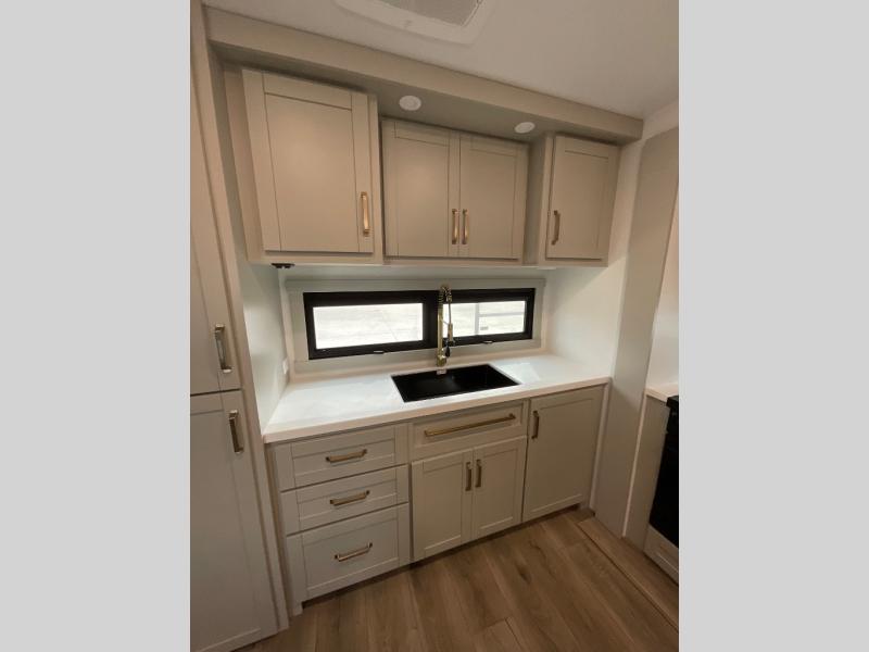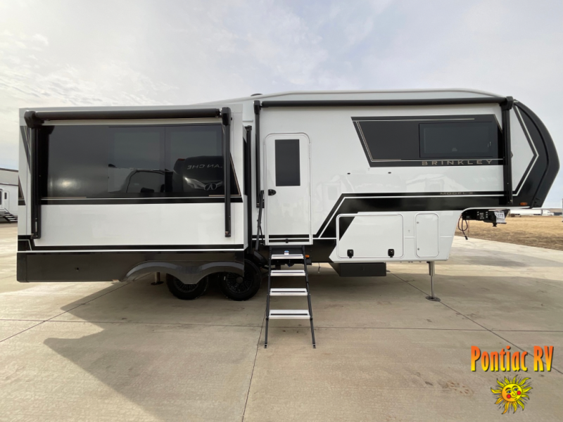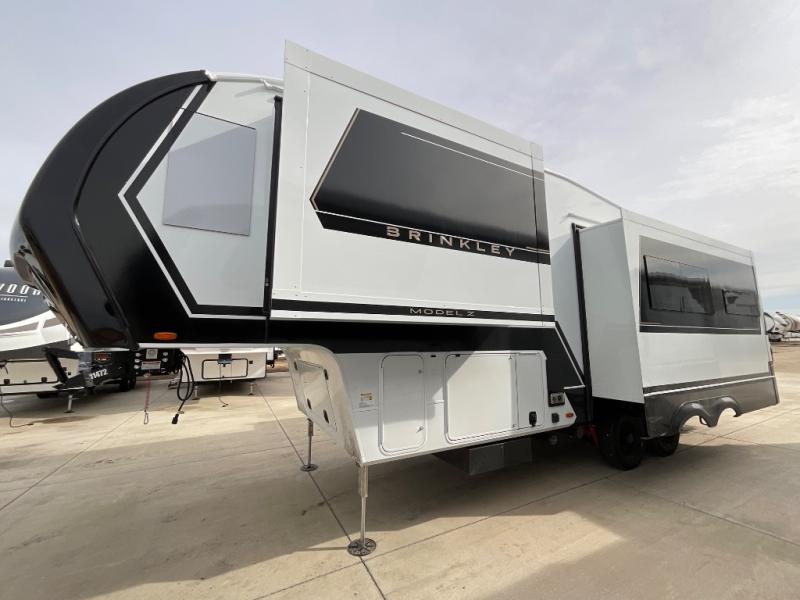 The Brinkley mid-profile Model Z fifth wheels bring you clean lines and an upscale look with plenty of style and exciting new features like the industry first brass plumbing connections. These units also feature an automotive grade front cap, plenty of exterior storage, exterior hot and cold showers, and wide stance leveling jacks for easy set up. Residential frameless windows provide a clean look and beautiful views, and ample electrical outlets and 6 USB/USB-C outlets allow all of your electronics and appliances to easily be used and charged.