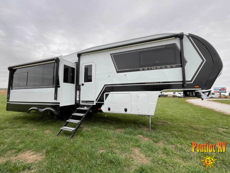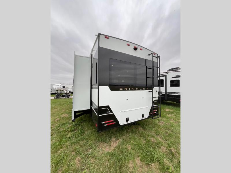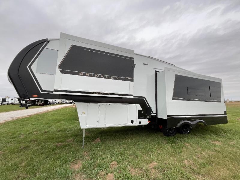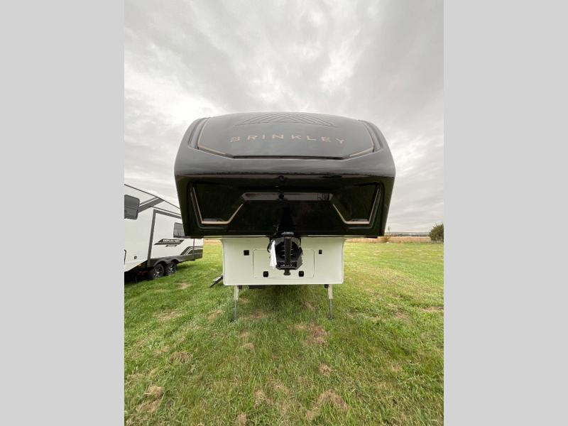 The Brinkley mid-profile Model Z fifth wheels bring you clean lines and an upscale look with plenty of style and exciting new features like the industry first brass plumbing connections. These units also feature an automotive grade front cap, plenty of exterior storage, dual exterior hot and cold showers, and wide stance leveling jacks for easy set up. Residential frameless windows provide a clean look and beautiful views, and ample electrical outlets and USB/USB-C outlets allow all of your electronics and appliances to easily be used and charged.