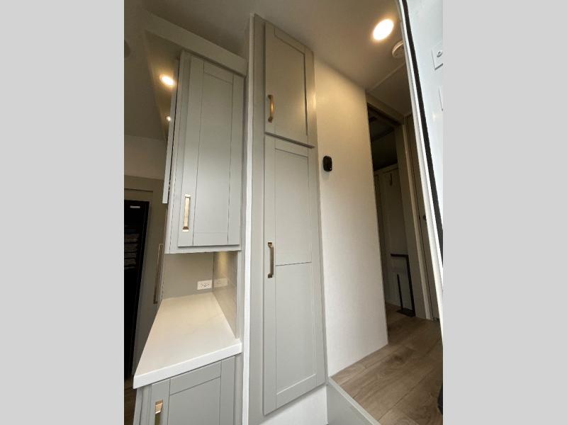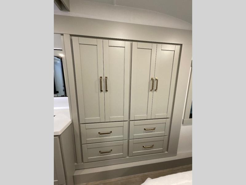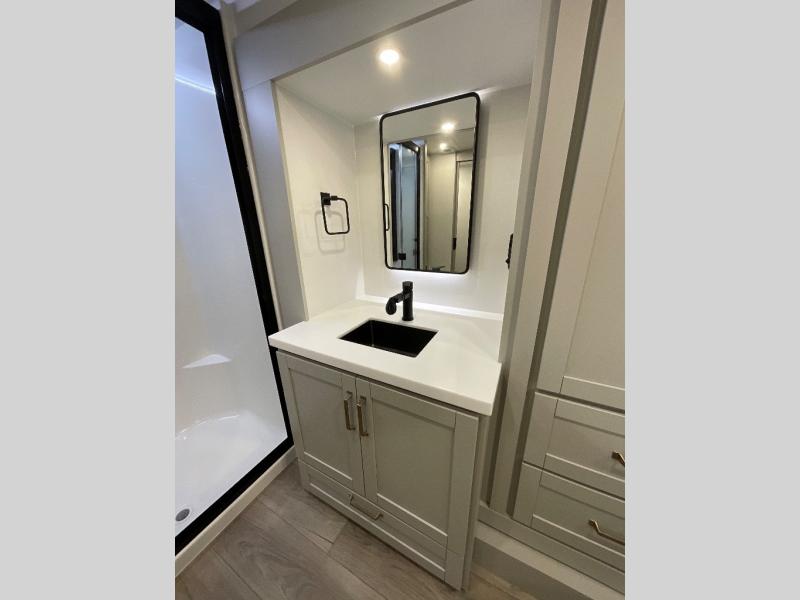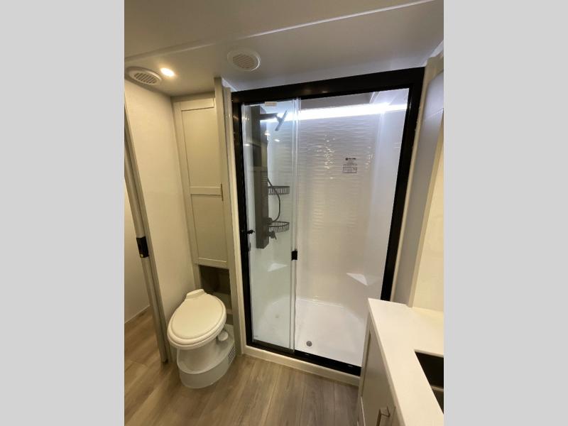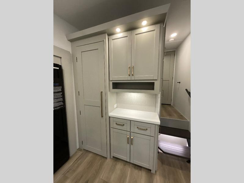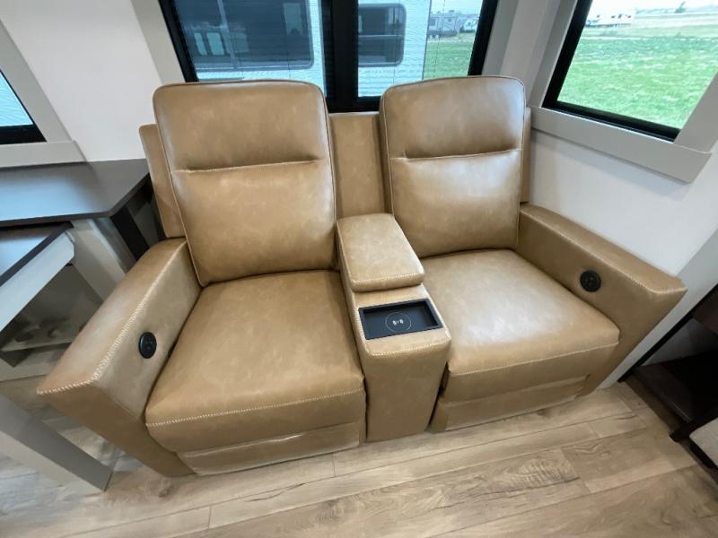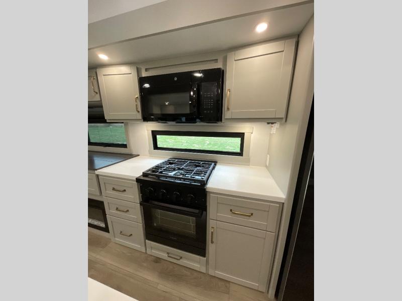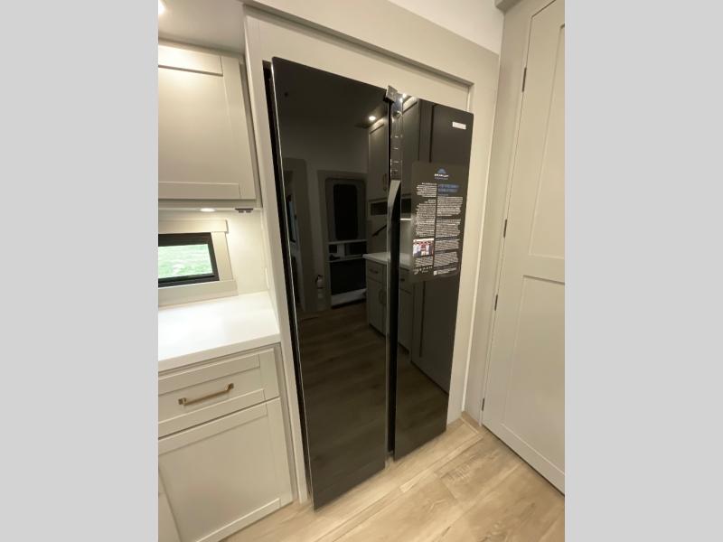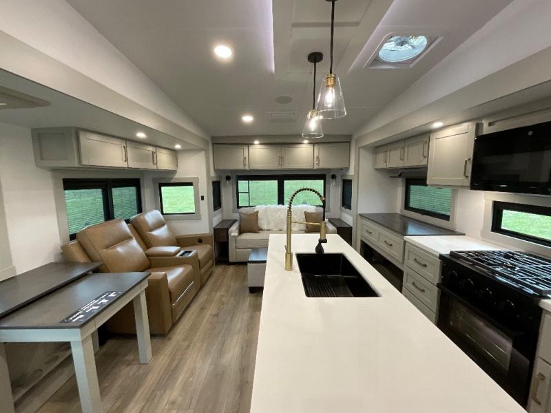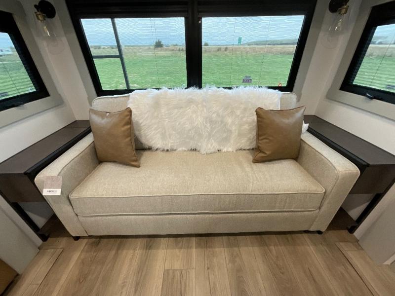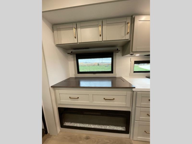You're going to love every minute spent in this spacious fifth wheel that can sleep four. There is an inviting rear living area with a 72" tri-fold sofa and theater seating across from the televator and fireplace. The chef of your group can whip up dinner on the three burner cooktop or in the 30" residential microwave, and there is a 16 cu. ft. refrigerator that even opens when with the slide out is in. You will also enjoy the kitchen island with a farmhouse sink and roller cover, dual trash bins with a Stow N' Go paper towel holder, plus convenient dog bowls for your furry friends. You can store all your paper goods and snacks in the 84" pantry with adjustable shelving, and there is a hutch for nice dishes plus shoe storage in this model as well. Head to the front master bedroom where you'll find a queen bed with a TV, a large slide out with a wardrobe with drawers, plus a spacious bath.