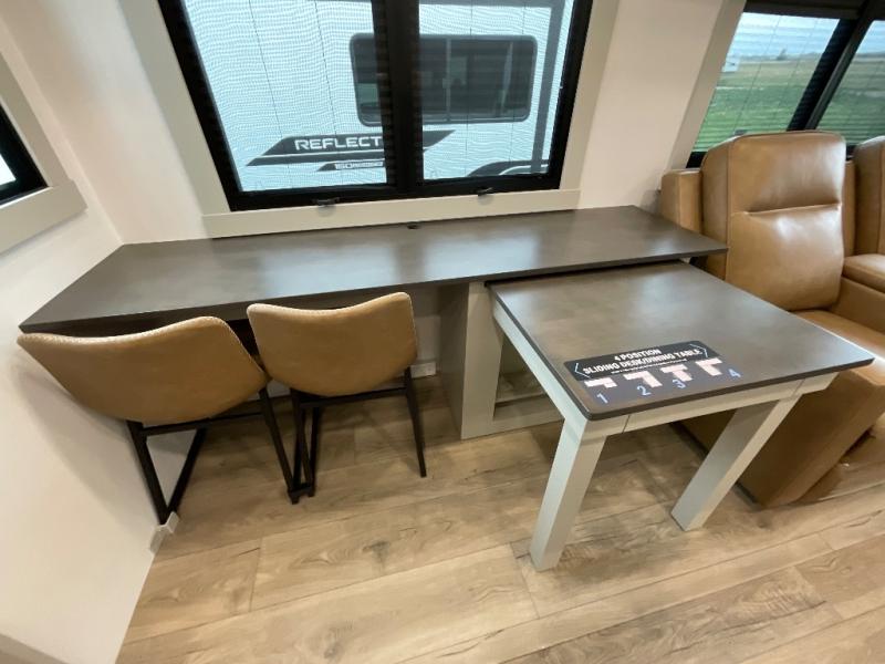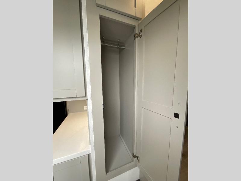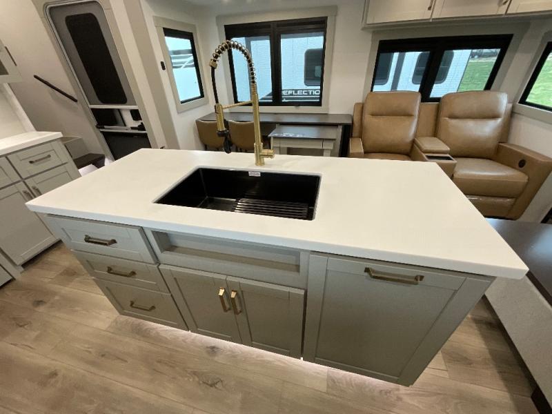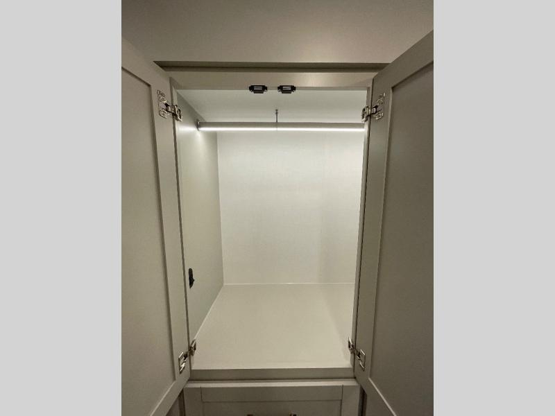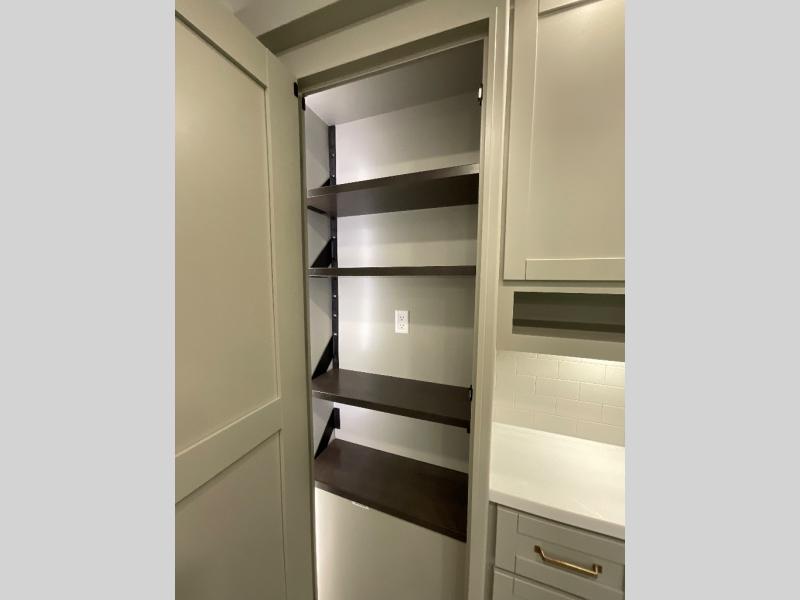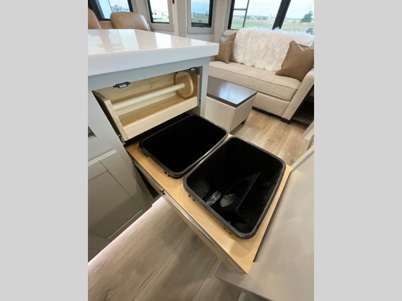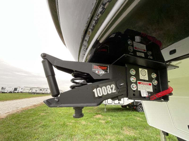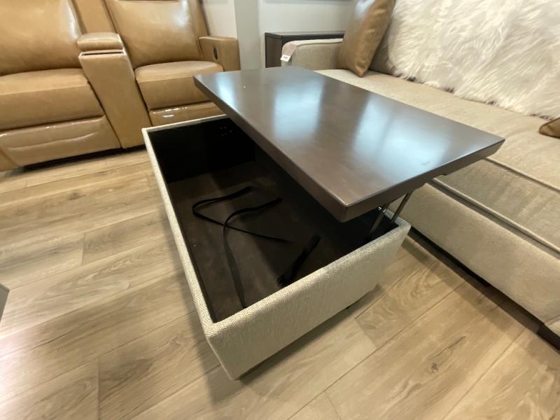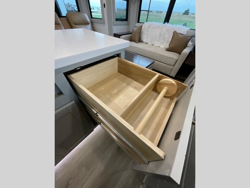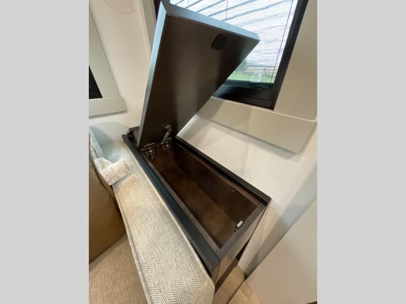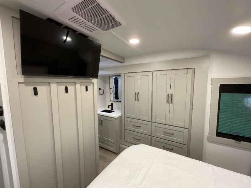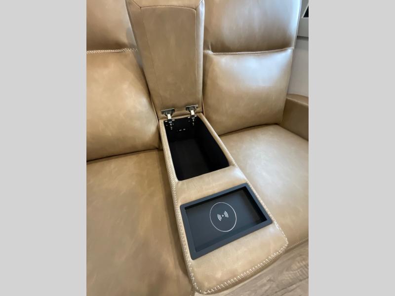 You're going to love every minute spent in this spacious fifth wheel that can sleep four. There is an inviting rear living area with a 72" tri-fold sofa and theater seating across from the televator and fireplace. The chef of your group can whip up dinner on the three burner cooktop or in the 30" residential microwave, and there is a 16 cu. ft. refrigerator that even opens when with the slide out is in. You will also enjoy the kitchen island with a farmhouse sink and roller cover, dual trash bins with a Stow N' Go paper towel holder, plus convenient dog bowls for your furry friends. You can store all your paper goods and snacks in the 84" pantry with adjustable shelving, and there is a hutch for nice dishes plus shoe storage in this model as well. Head to the front master bedroom where you'll find a queen bed with a TV, a large slide out with a wardrobe with drawers, plus a spacious bath.