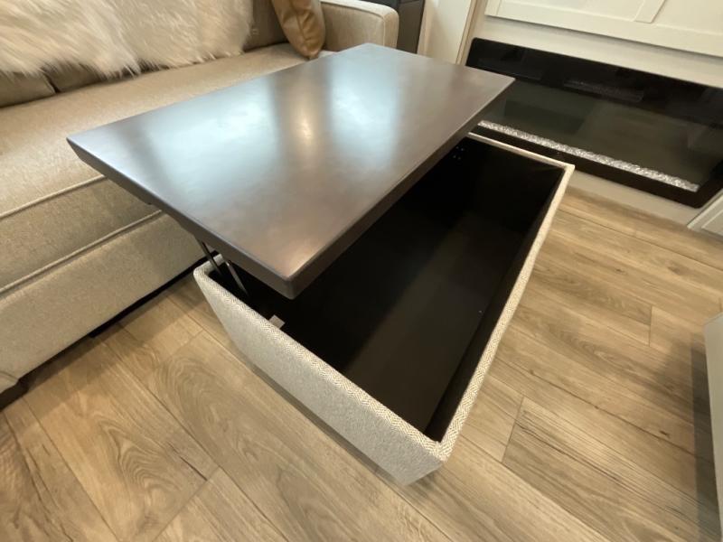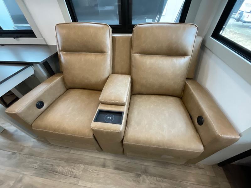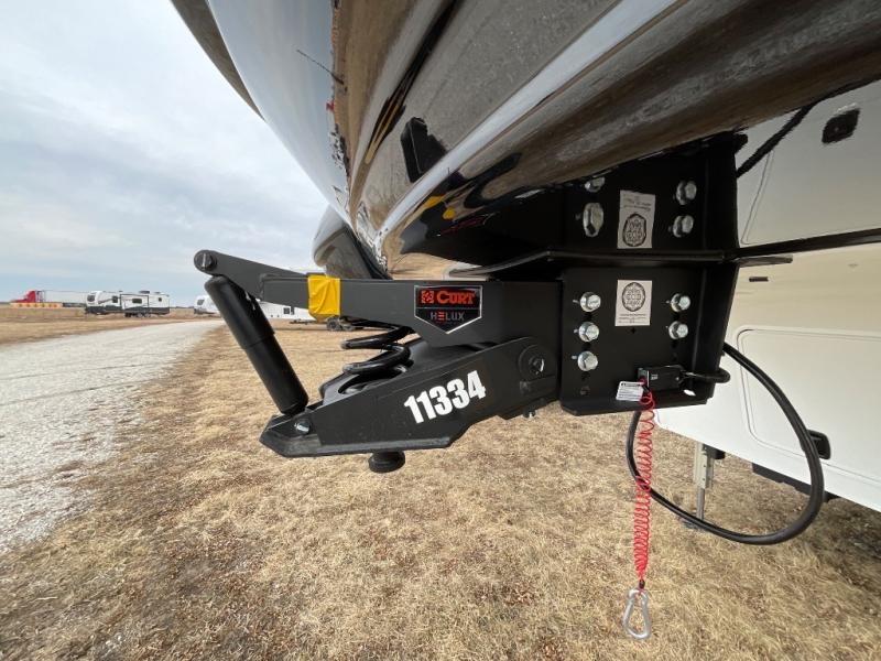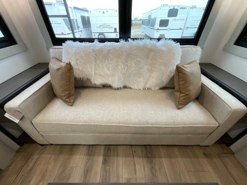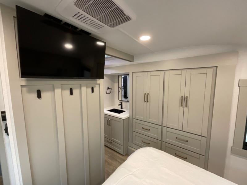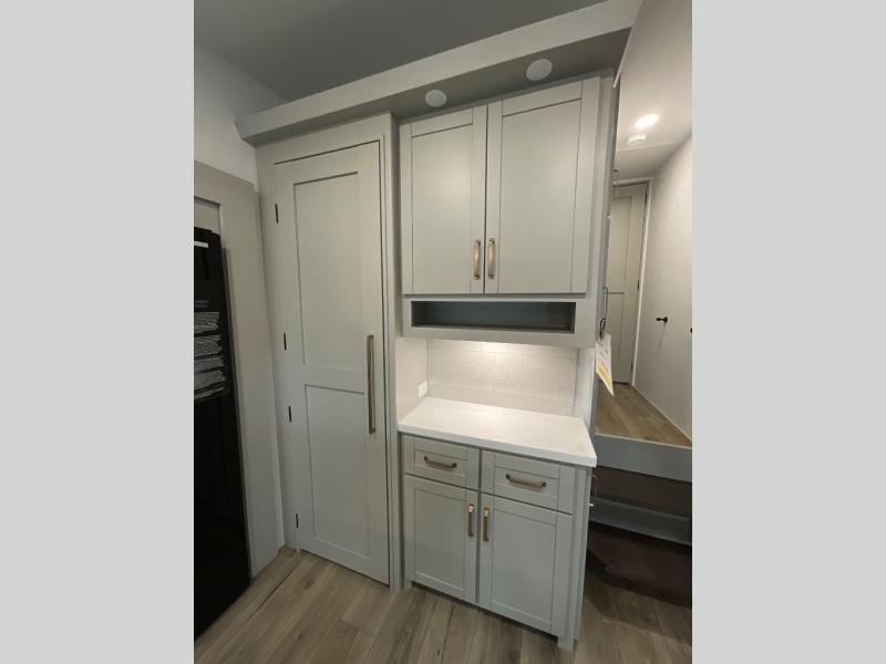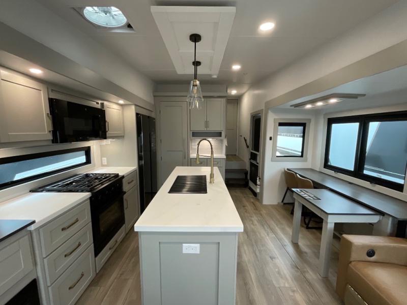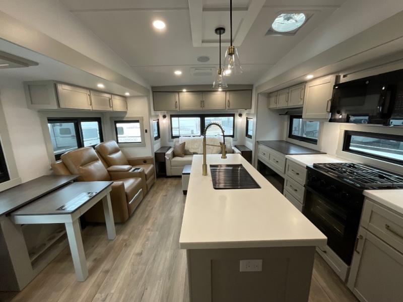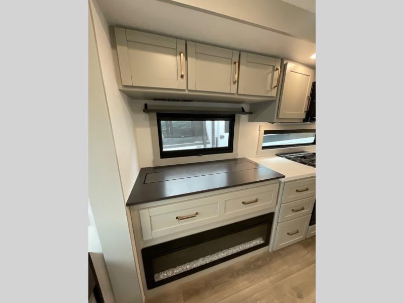 You're going to love every minute spent in this spacious fifth wheel that can sleep four. There is an inviting rear living area with a 72" tri-fold sofa and theater seating across from the televator and fireplace. The chef of your group can whip up dinner on the three burner cooktop or in the 30" residential microwave, and there is a 16 cu. ft. refrigerator that even opens when with the slide out is in. You will also enjoy the kitchen island with a farmhouse sink and roller cover, dual trash bins with a Stow N' Go paper towel holder, plus convenient dog bowls for your furry friends. You can store all your paper goods and snacks in the 84" pantry with adjustable shelving, and there is a hutch for nice dishes plus shoe storage in this model as well. Head to the front master bedroom where you'll find a queen bed with a TV, a large slide out with a wardrobe with drawers, plus a spacious bath.