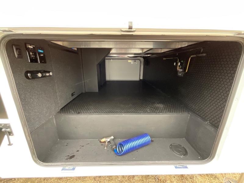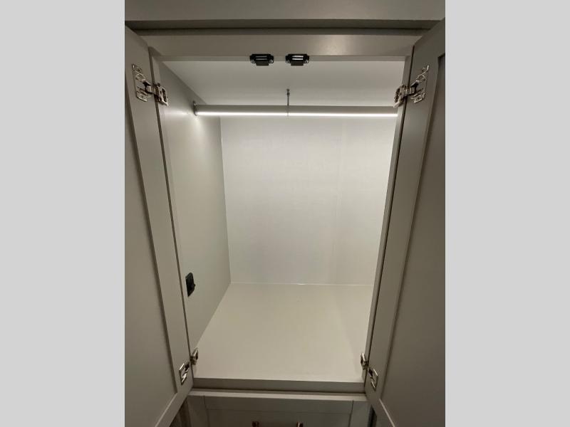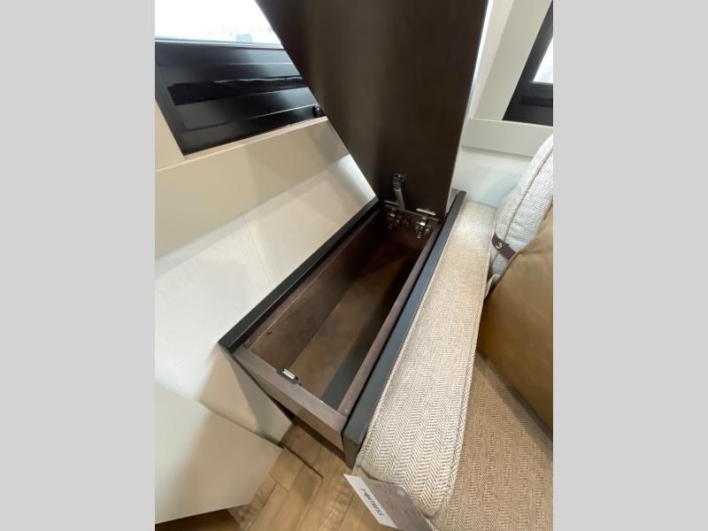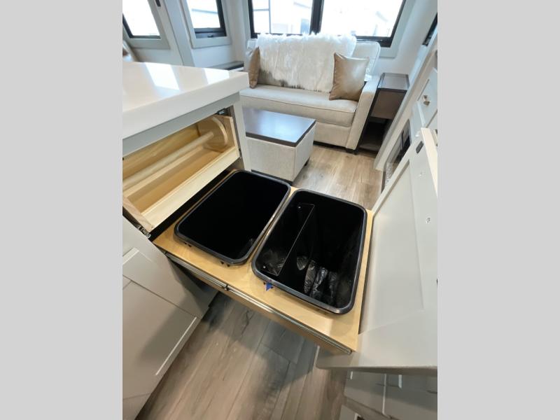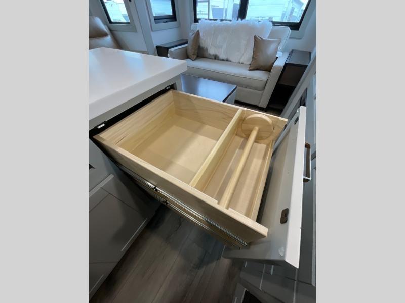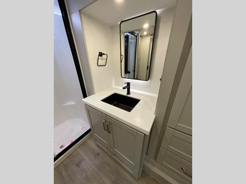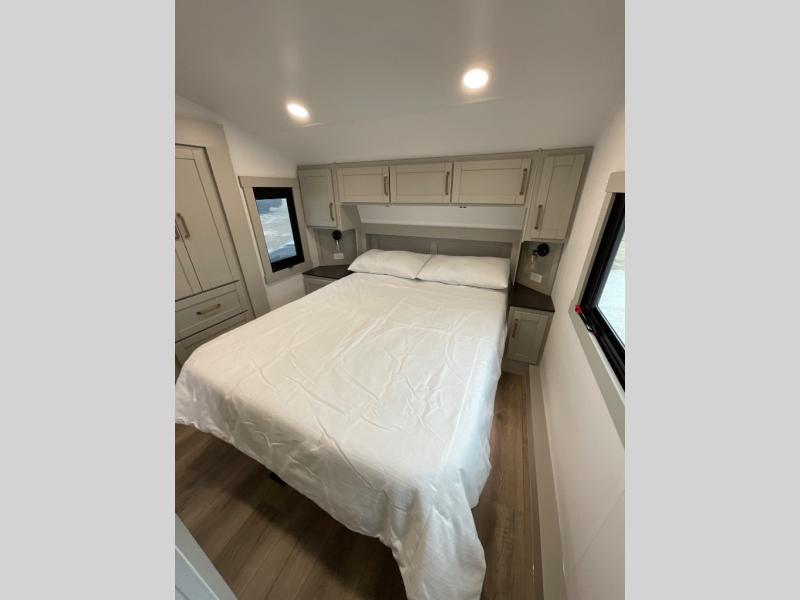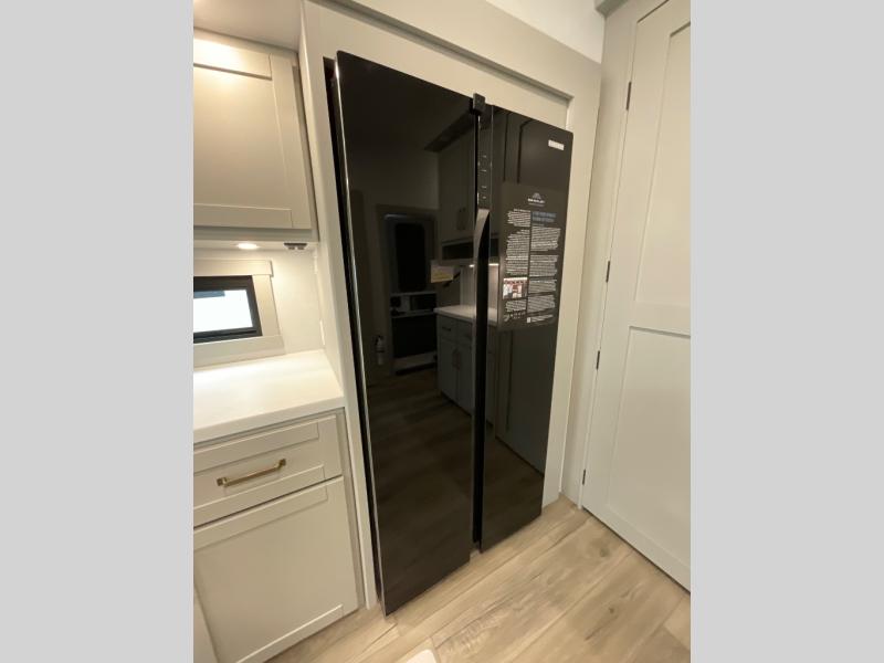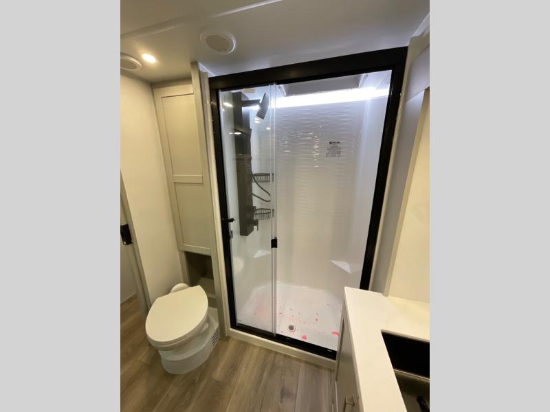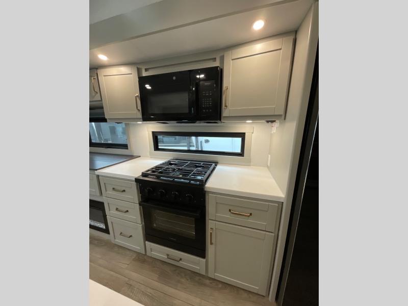 You're going to love every minute spent in this spacious fifth wheel that can sleep four. There is an inviting rear living area with a 72" tri-fold sofa and theater seating across from the televator and fireplace. The chef of your group can whip up dinner on the three burner cooktop or in the 30" residential microwave, and there is a 16 cu. ft. refrigerator that even opens when with the slide out is in. You will also enjoy the kitchen island with a farmhouse sink and roller cover, dual trash bins with a Stow N' Go paper towel holder, plus convenient dog bowls for your furry friends. You can store all your paper goods and snacks in the 84" pantry with adjustable shelving, and there is a hutch for nice dishes plus shoe storage in this model as well. Head to the front master bedroom where you'll find a queen bed with a TV, a large slide out with a wardrobe with drawers, plus a spacious bath.