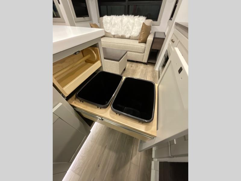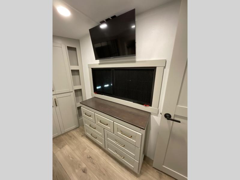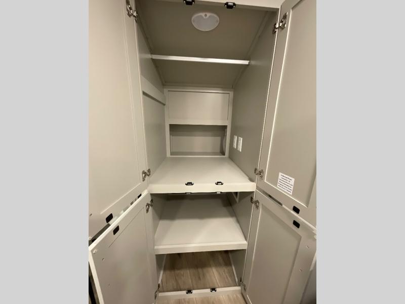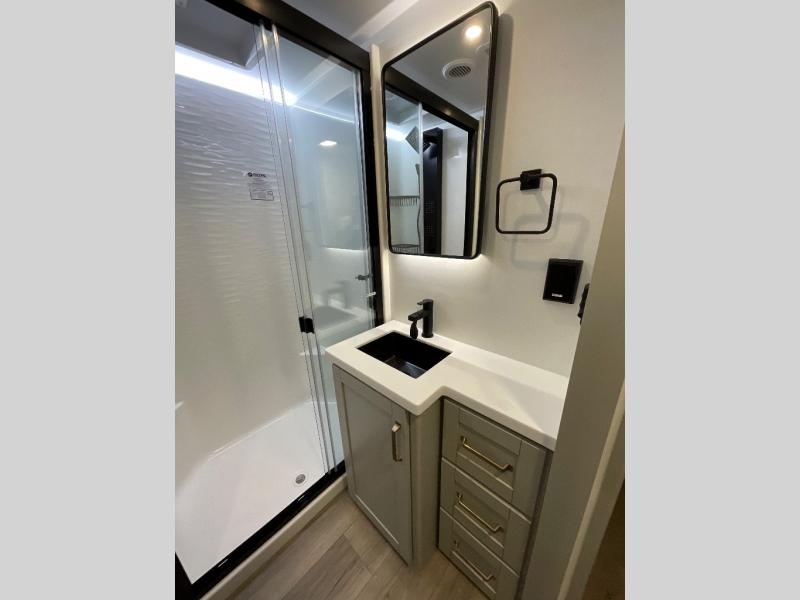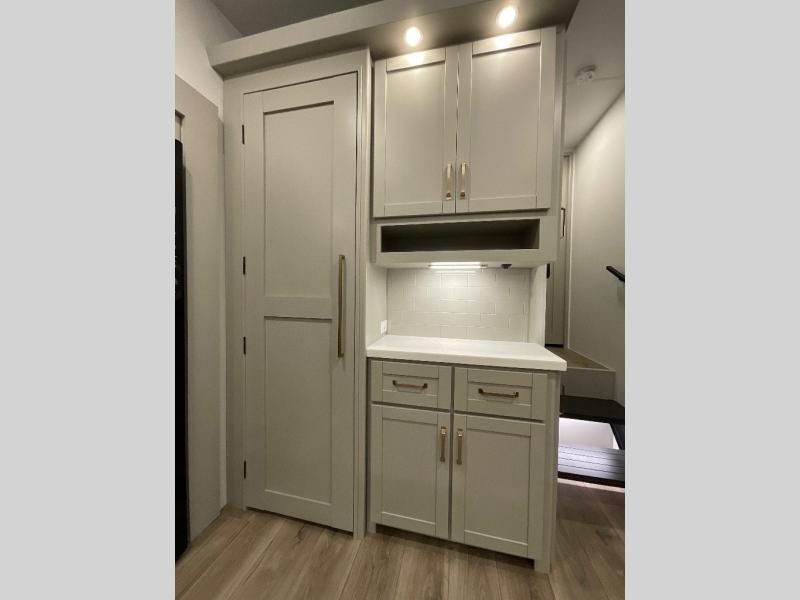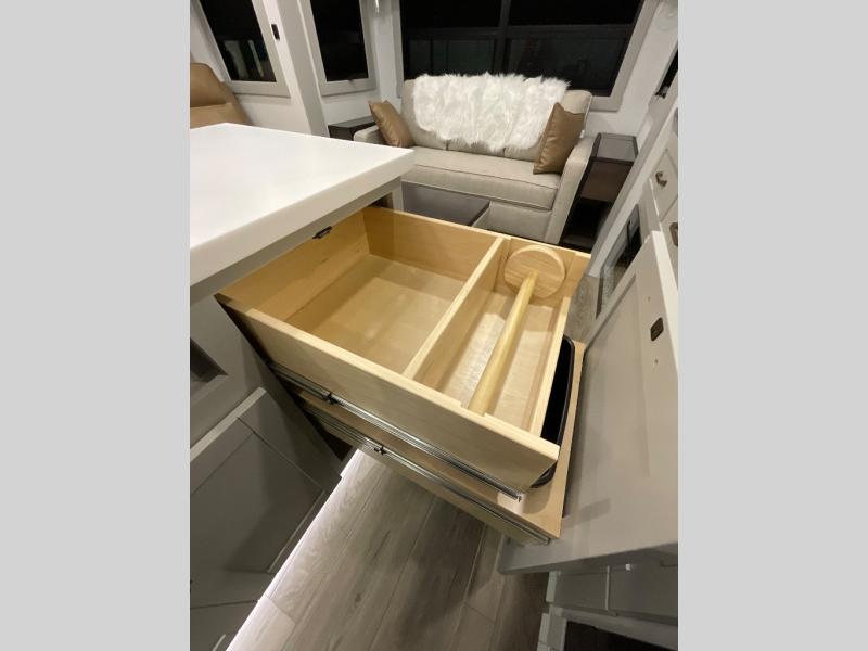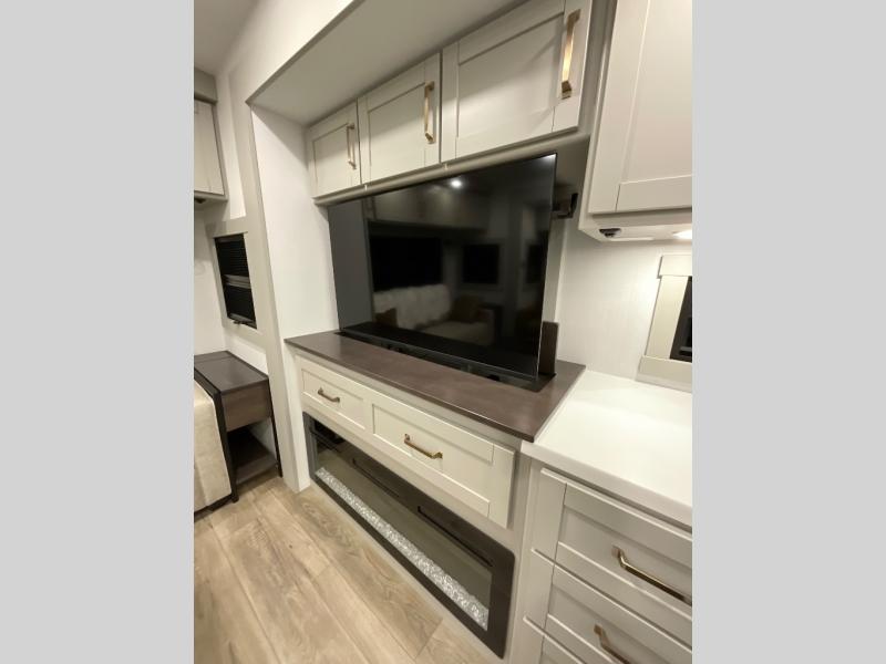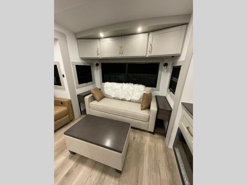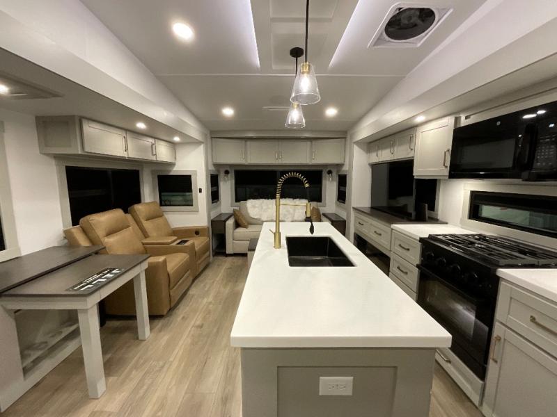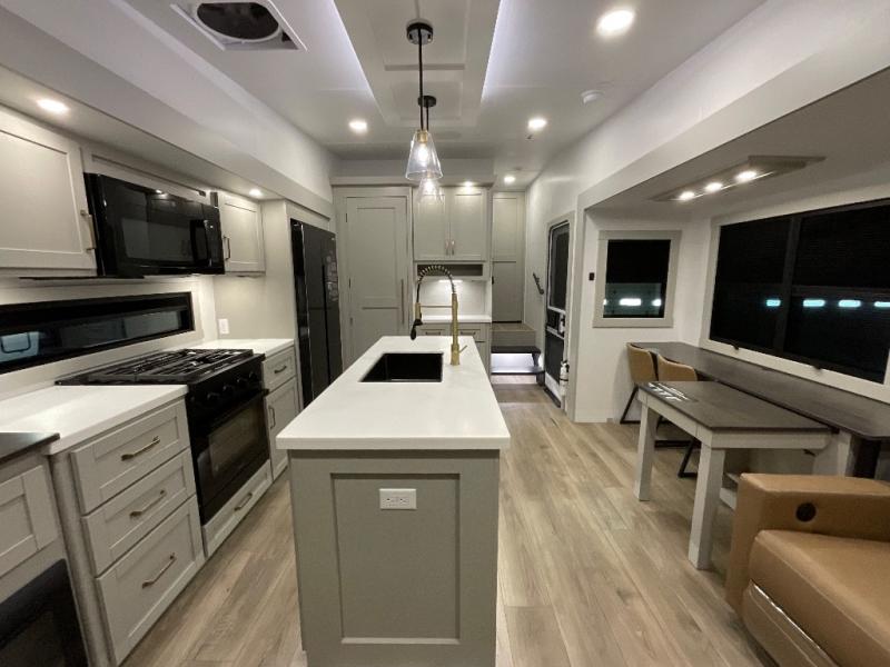 This Model Z luxury fifth wheel is bright and modern on the inside, with loads of amenities that will have you dreaming of your next trip! Enter and find a spacious combined living/kitchen space thanks to dual opposing slides. There is ample seating with a sliding desk/dining table, 62" theater seating, and a 72" tri-fold sofa along the rear wall. You can easily relax and enjoy the 50" Smart telescoping TV with a cozy fireplace below. The kitchen offers all that you need to prepare and cook meals just like home with a 16 cu. ft. refrigerator for your perishables, a 30" microwave oven, and three burner range top and oven. You will love the integrated spice rack, and the kitchen island all outfitted with dog bowls and double pull out trash bins with an integrated Stow 'N Go paper towel holder. There is also an 84" pantry with adjustable shelves for all of your canned and dry goods. Head up the steps to a private master suite with king bed slide. You can opt for the queen bed if you like. A sliding dresser top features hidden storage which is perfect for jewelry and other personal belongings. The front wardrobe features mirrored doors and the corner closet has been prepped for a stackable washer and dryer if you choose to add that option. Relax and enjoy a large bath featuring a linen cabinet, a 30" x 42" shower, and vanity with sink, plus medicine cabinet.