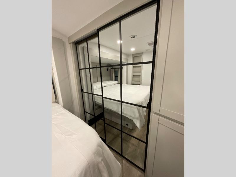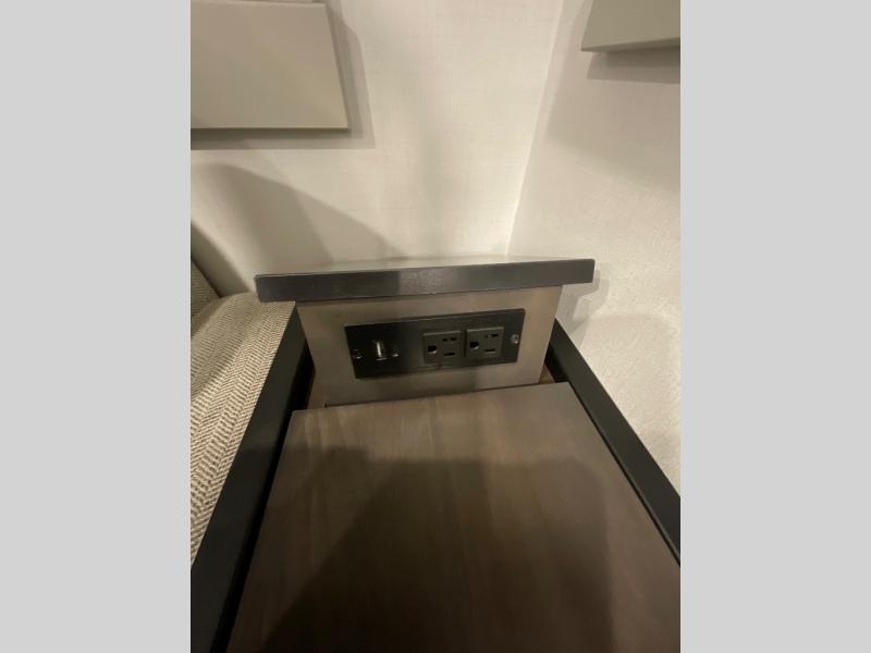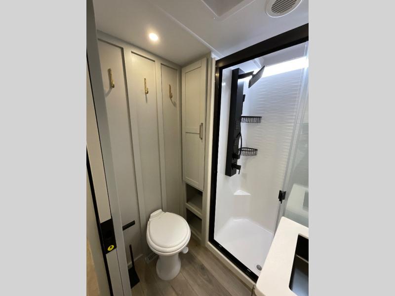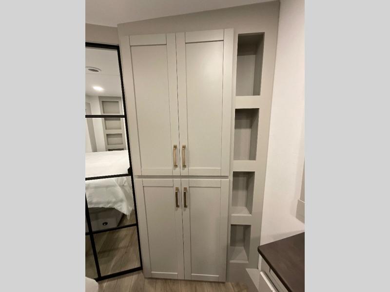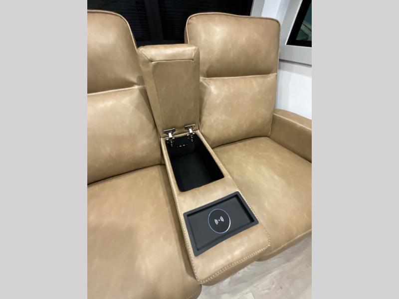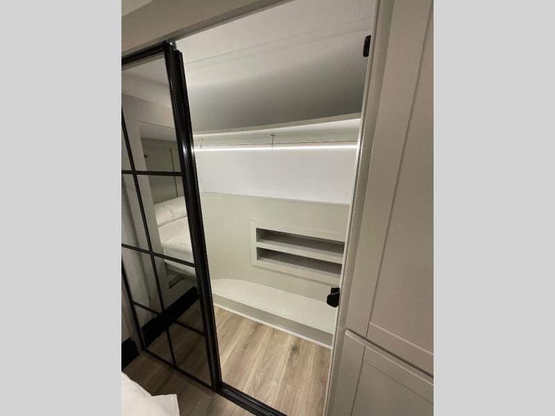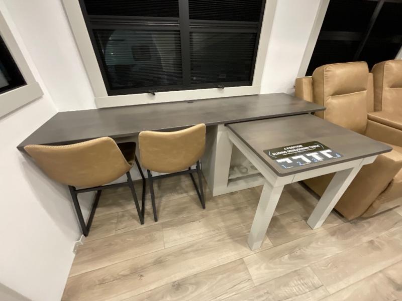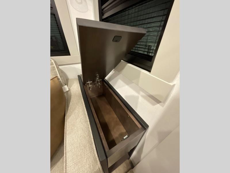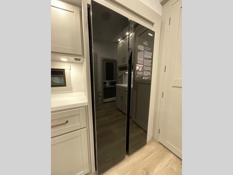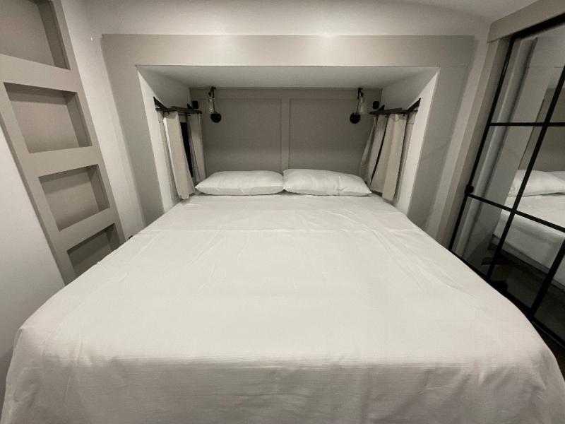 This Model Z luxury fifth wheel is bright and modern on the inside, with loads of amenities that will have you dreaming of your next trip! Enter and find a spacious combined living/kitchen space thanks to dual opposing slides. There is ample seating with a sliding desk/dining table, 62" theater seating, and a 72" tri-fold sofa along the rear wall. You can easily relax and enjoy the 50" Smart telescoping TV with a cozy fireplace below. The kitchen offers all that you need to prepare and cook meals just like home with a 16 cu. ft. refrigerator for your perishables, a 30" microwave oven, and three burner range top and oven. You will love the integrated spice rack, and the kitchen island all outfitted with dog bowls and double pull out trash bins with an integrated Stow 'N Go paper towel holder. There is also an 84" pantry with adjustable shelves for all of your canned and dry goods. Head up the steps to a private master suite with king bed slide. You can opt for the queen bed if you like. A sliding dresser top features hidden storage which is perfect for jewelry and other personal belongings. The front wardrobe features mirrored doors and the corner closet has been prepped for a stackable washer and dryer if you choose to add that option. Relax and enjoy a large bath featuring a linen cabinet, a 30" x 42" shower, and vanity with sink, plus medicine cabinet.