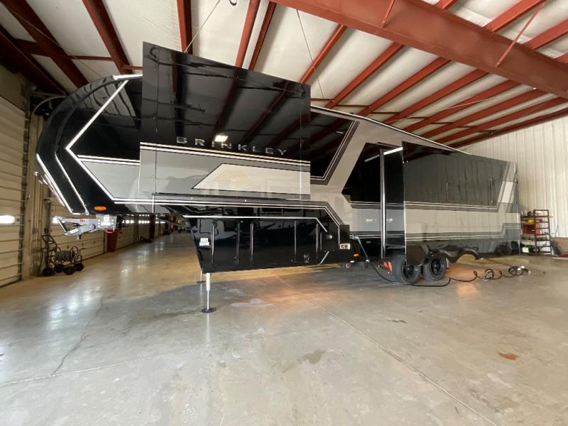 The Brinkley mid-profile Model Z fifth wheels bring you clean lines and an upscale look with plenty of style and exciting new features like the industry first brass plumbing connections. These units also feature an automotive grade front cap, plenty of exterior storage, dual exterior hot and cold showers, and wide stance leveling jacks for easy set up. Residential frameless windows provide a clean look and beautiful views, and ample electrical outlets and 6 USB/USB-C outlets allow all of your electronics and appliances to easily be used and charged.