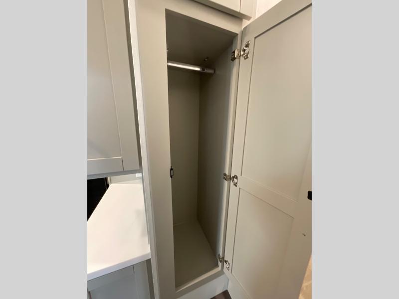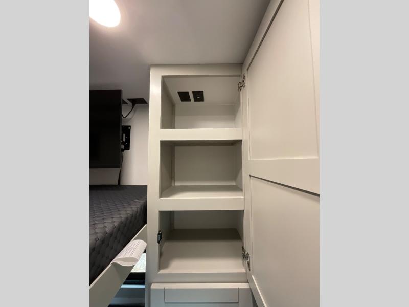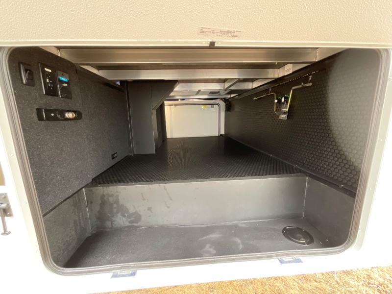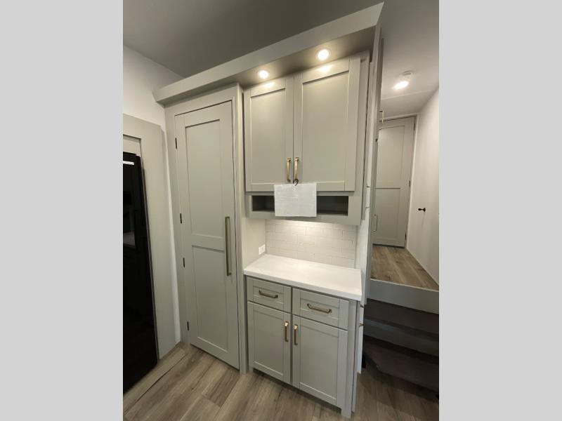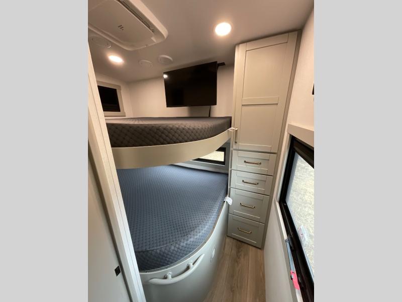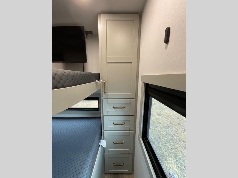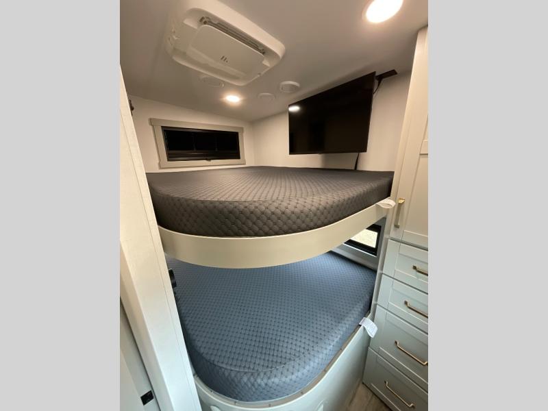 The perfect unit for your larger family, this Model Z can sleep eight! Step inside and find a wide open combined kitchen and living room. There is a large slide out theater seat with two recliners and seating for four, plus a 60" tri-fold sofa, and a televator and fireplace in the appliance slide along the roadside. The center island features dual trash bins and stow & go paper towel holder, a large sink, and even dog bowls for your favorite furry friend. A 16 cu. ft. refrigerator will house all of your perishables, and you will also have an 84" pantry with adjustable shelves for all of your dry goods and snacks. Head up the steps to your right, just inside the entry, to find a private master bedroom and bath at the end of the hall. Here you will find a queen bed, slide out wardrobe with a dresser, and the bathroom vanity. A large 30" x 42" shower will welcome you each morning or night to keep clean and refreshed. At the very back of the unit, guests will enjoy a private bunkhouse with 54" x 74" bunk beds, a TV, and wardrobe with drawers beneath. The outside features over 160 cu. ft. of exterior storage with mid-coach pass-through and exterior storage access, plus two awnings for added outdoor living.