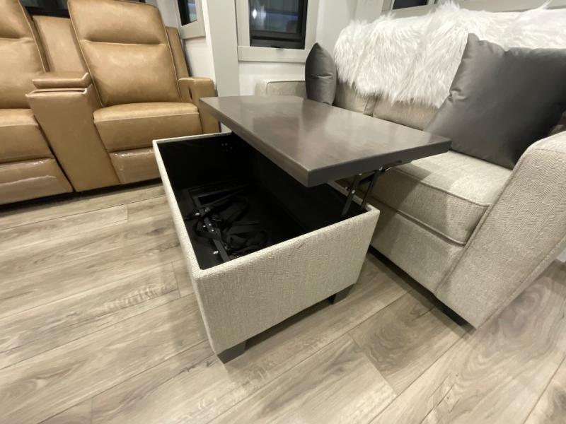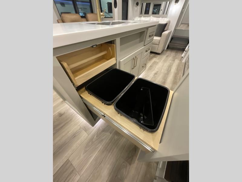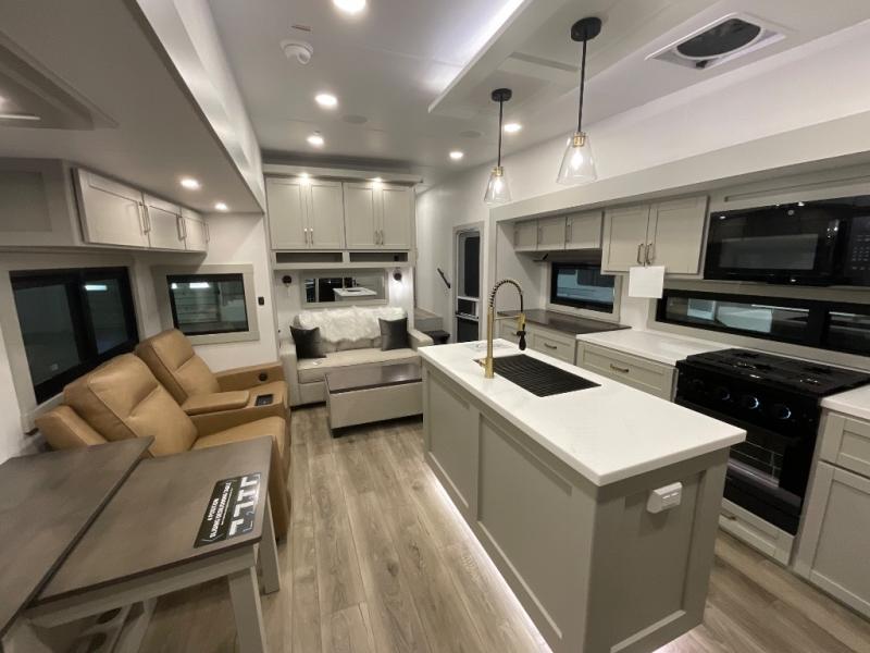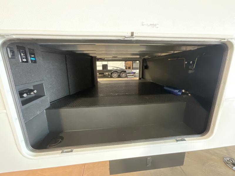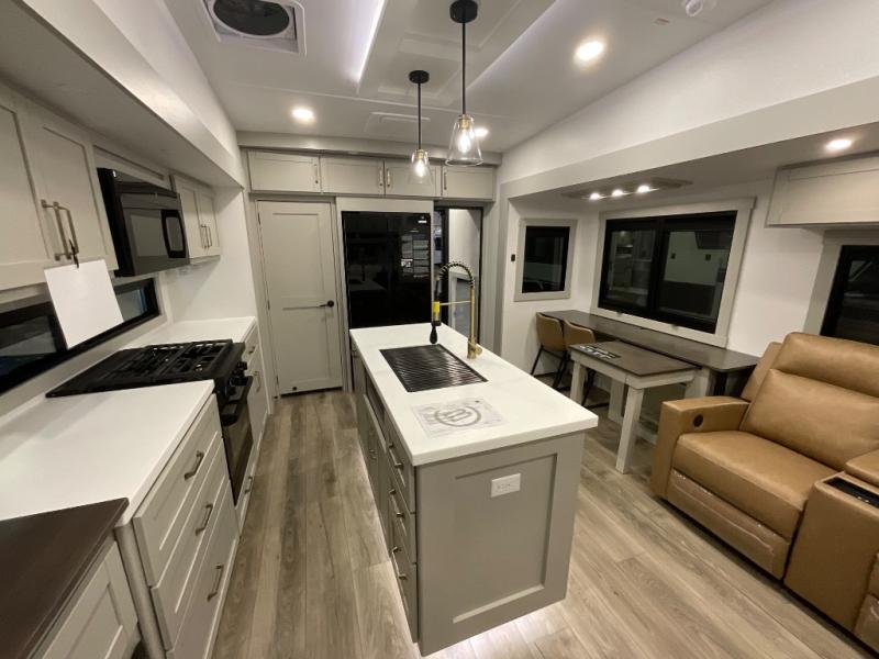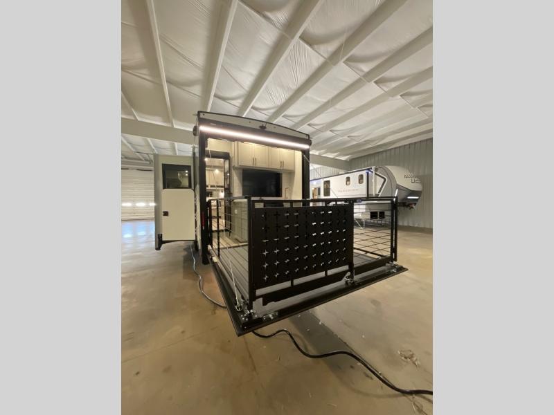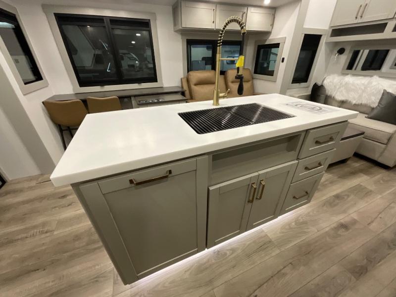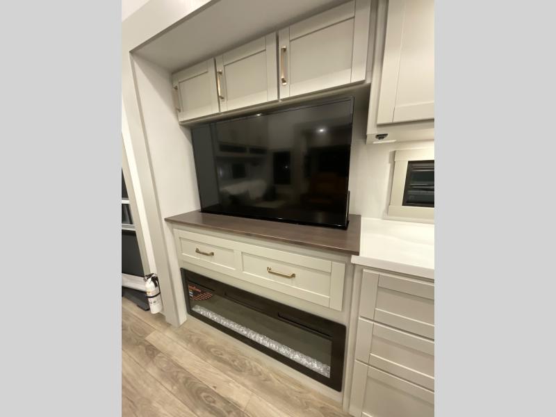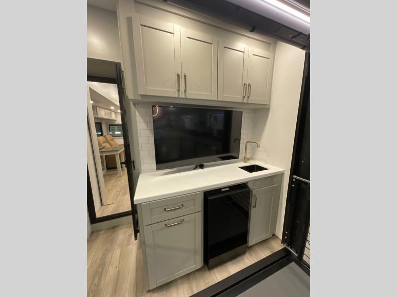 You're going to love every minute spent in this triple slide out fifth wheel! Once you arrive at the campground, you can put out the two side awnings, set up the rear patio and awning, then make lunch on the outdoor kitchen! There is also an outdoor TV here, a bar sink, and a refrigerator to keep drinks close by! Inside, the chef will find everything they need if the weather isn't cooperating, including a 30" residential microwave, 16 cu. ft. refrigerator, plus a large kitchen island, complete with dual trash bins and dog bowls at the foot. Your crew can get cozy on the tri-fold sofa that extends to a 54" x 70" bed for guests, and there is theater seating across from the televator and fireplace for easy viewing! You will find the front private bedroom ultra accommodating with its king bed slide out, sliding dresser top with hidden storage, your own TV, and a front wardrobe with shelves and a shoe rack. There is even washer and dryer prep if you want the option to make laundry day that much easier!
