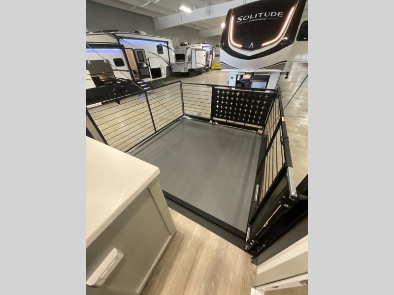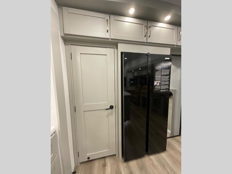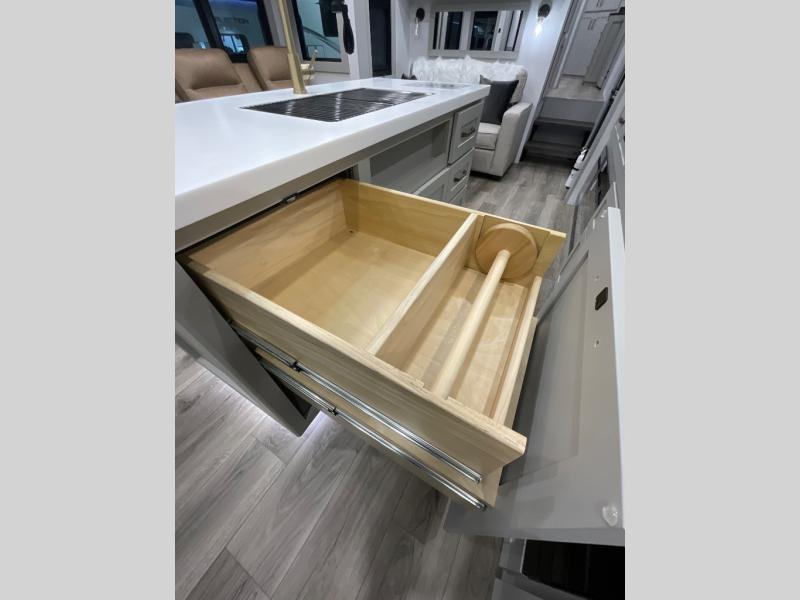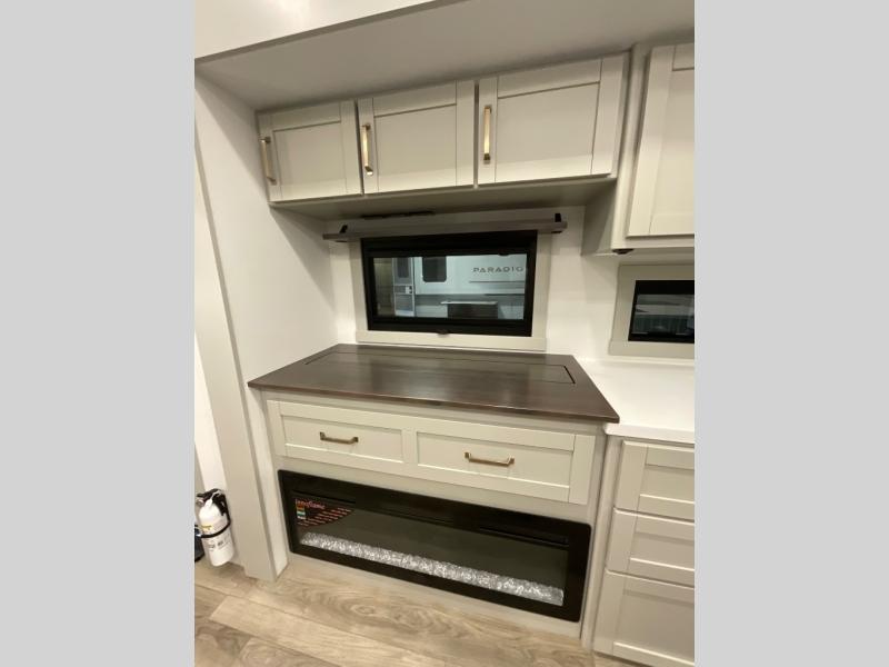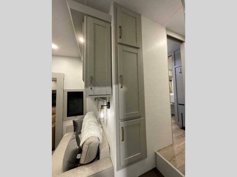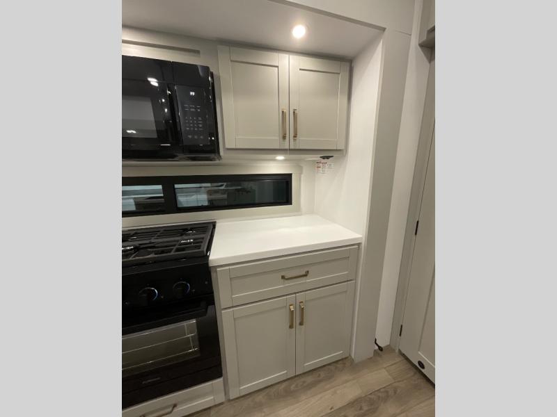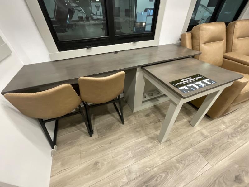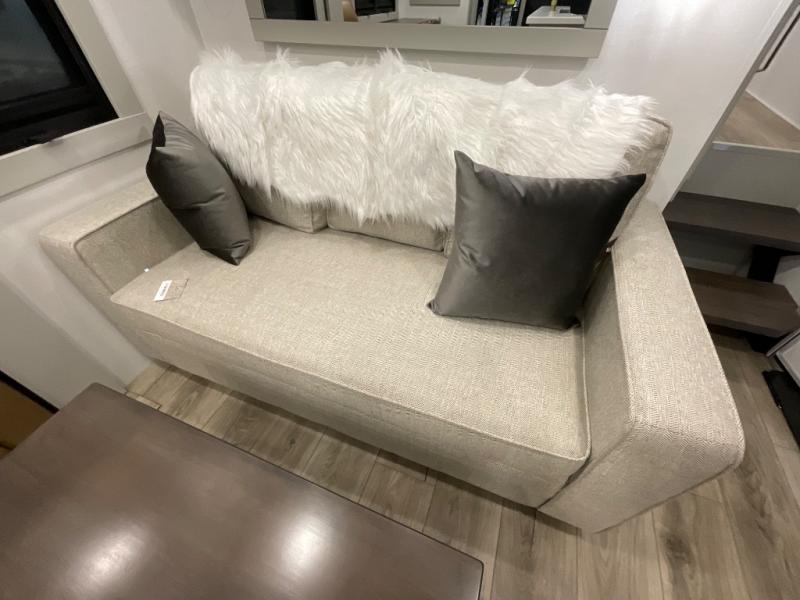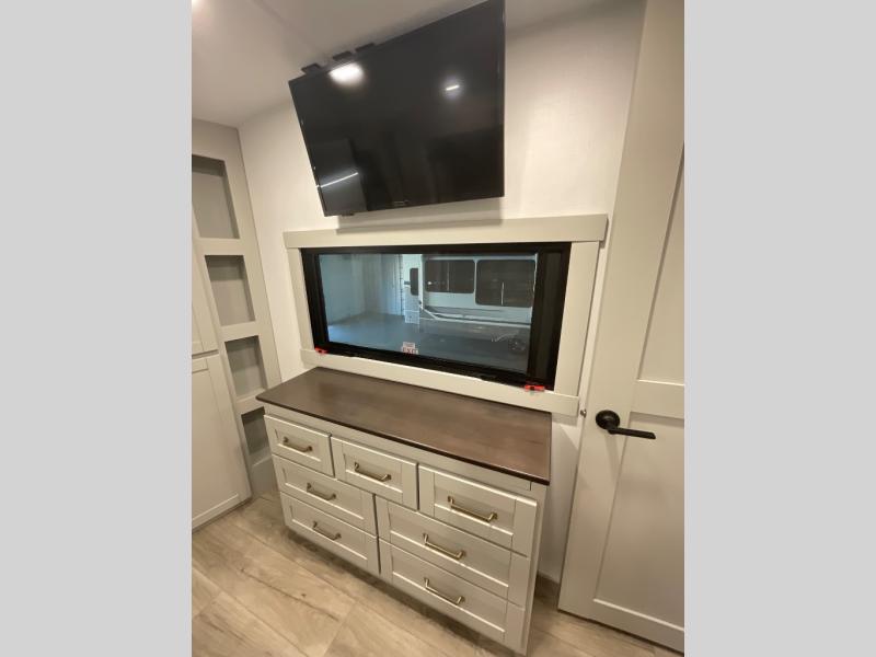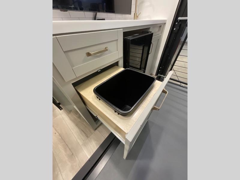 You're going to love every minute spent in this triple slide out fifth wheel! Once you arrive at the campground, you can put out the two side awnings, set up the rear patio and awning, then make lunch on the outdoor kitchen! There is also an outdoor TV here, a bar sink, and a refrigerator to keep drinks close by! Inside, the chef will find everything they need if the weather isn't cooperating, including a 30" residential microwave, 16 cu. ft. refrigerator, plus a large kitchen island, complete with dual trash bins and dog bowls at the foot. Your crew can get cozy on the tri-fold sofa that extends to a 54" x 70" bed for guests, and there is theater seating across from the televator and fireplace for easy viewing! You will find the front private bedroom ultra accommodating with its king bed slide out, sliding dresser top with hidden storage, your own TV, and a front wardrobe with shelves and a shoe rack. There is even washer and dryer prep if you want the option to make laundry day that much easier!