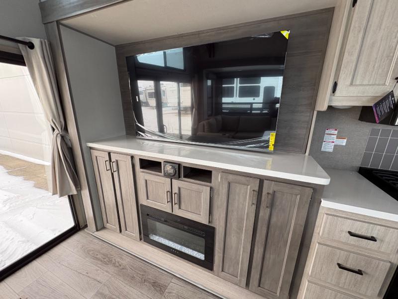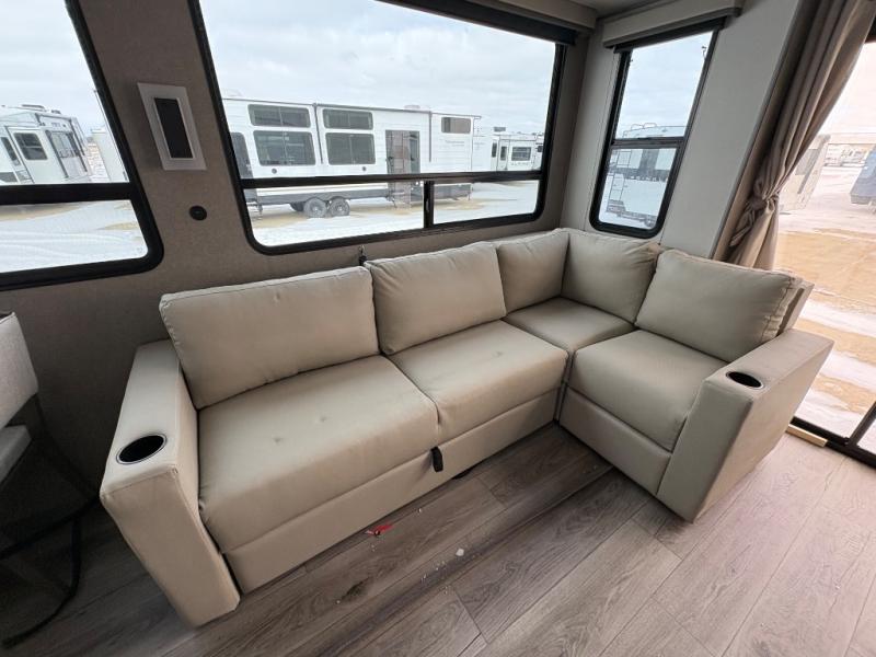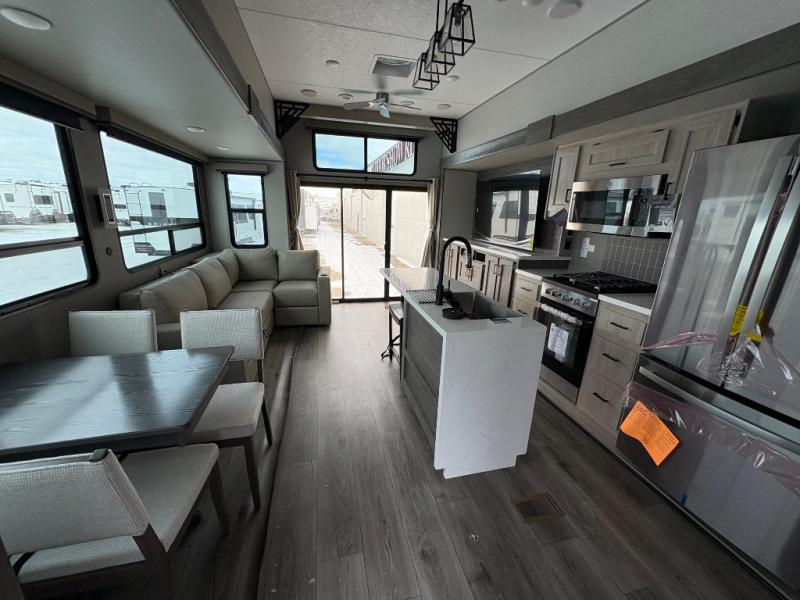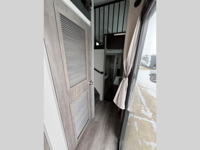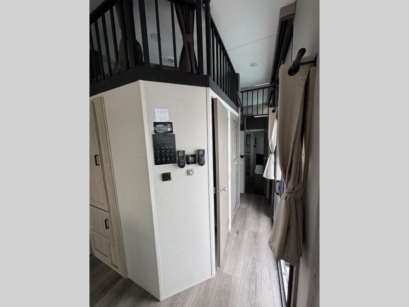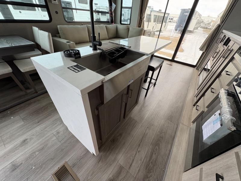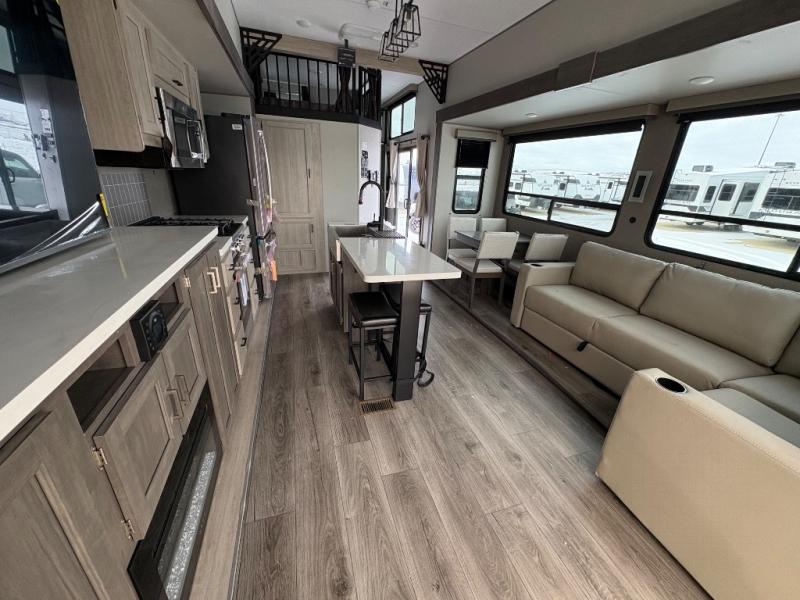 There is much to love about this destination trailer! Starting with the loft that has two queen beds, a wardrobe/storage, and a custom 58" x 71" bed. Downstairs there's a private bedroom with a king bed slide, a fireplace, and its very own private full bathroom complete with a dual sink vanity. The main living area has a huge bi-fold sleeper sectional sofa so you can fit even more guests, or just relax and watch the TV on the power lift in the entertainment center. The kitchen is well-equipped with a french door refrigerator, microwave, and pantry. The centerpiece here is a kitchen island with a deep basin farm-style sink and bar stool seating so your group can gather together and make new memories. The second full bath has a roomy 36" x 30" shower with glass door, and just around the corner find the stackable washer and dryer!