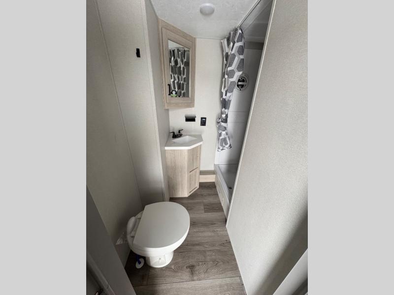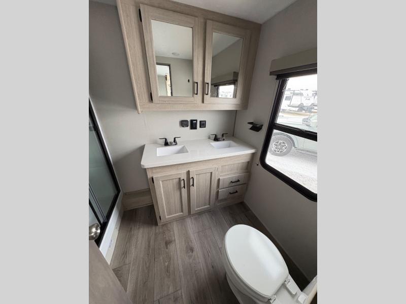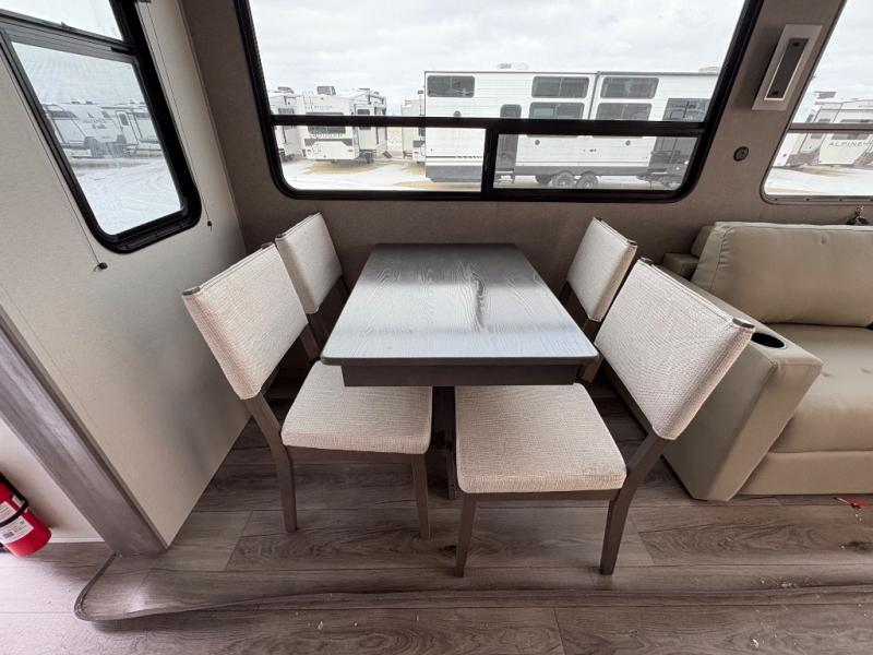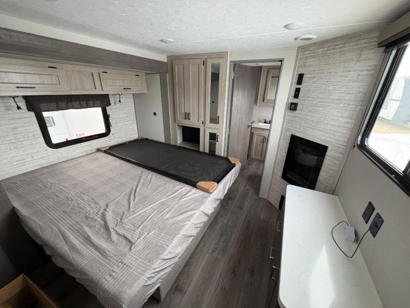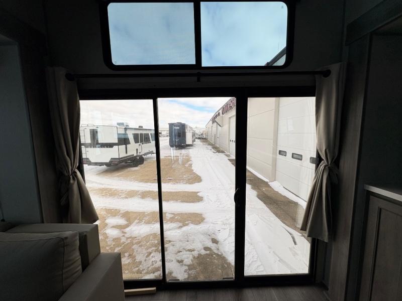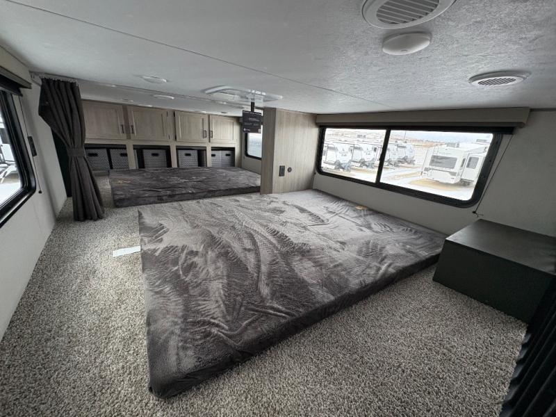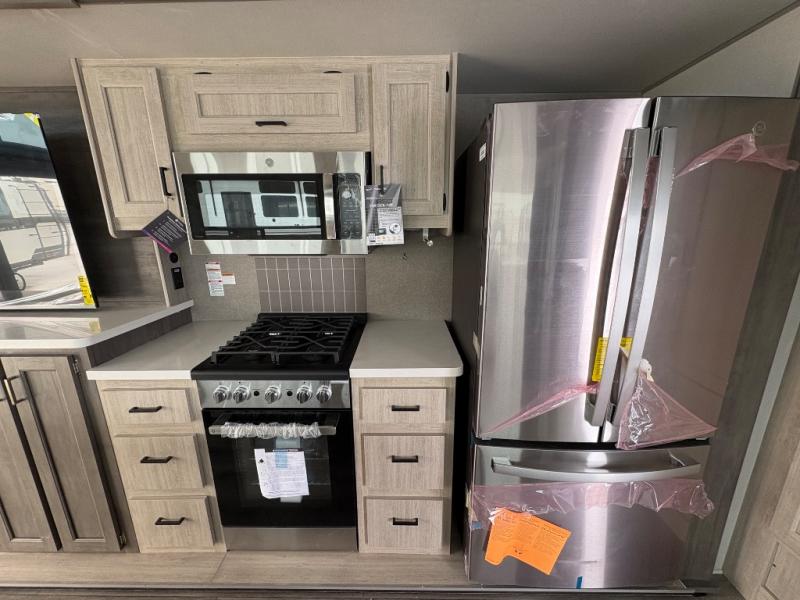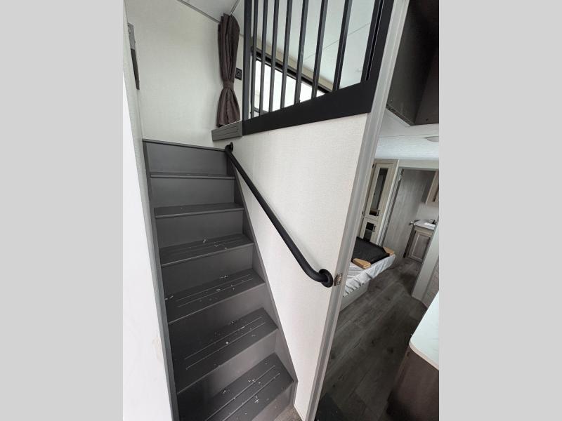 There is much to love about this destination trailer! Starting with the loft that has two queen beds, a wardrobe/storage, and a custom 58" x 71" bed. Downstairs there's a private bedroom with a king bed slide, a fireplace, and its very own private full bathroom complete with a dual sink vanity. The main living area has a huge bi-fold sleeper sectional sofa so you can fit even more guests, or just relax and watch the TV on the power lift in the entertainment center. The kitchen is well-equipped with a french door refrigerator, microwave, and pantry. The centerpiece here is a kitchen island with a deep basin farm-style sink and bar stool seating so your group can gather together and make new memories. The second full bath has a roomy 36" x 30" shower with glass door, and just around the corner find the stackable washer and dryer!