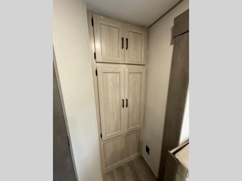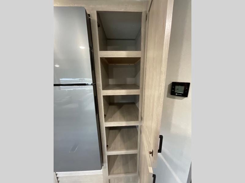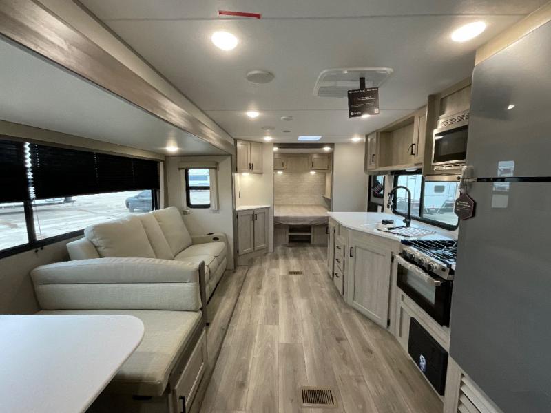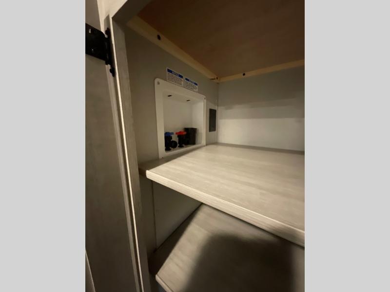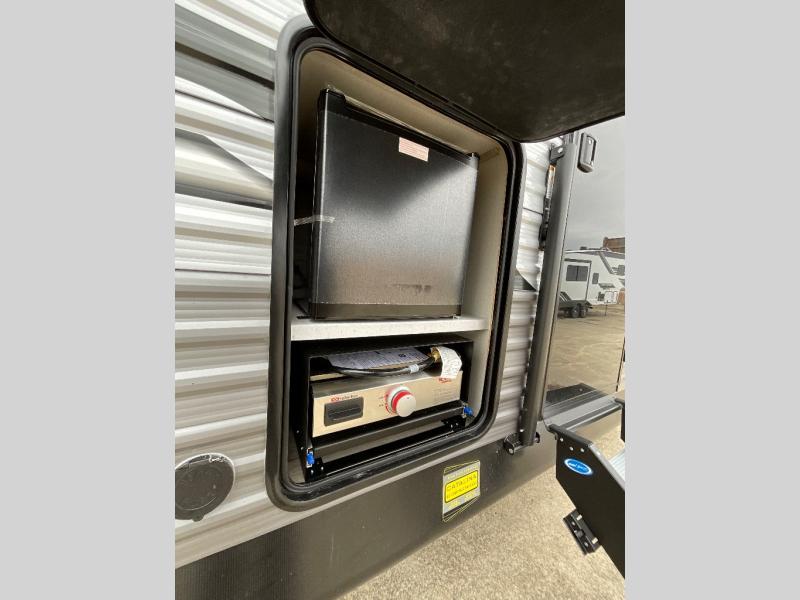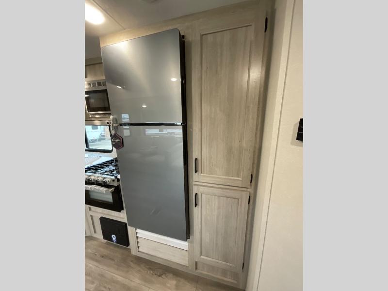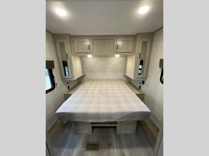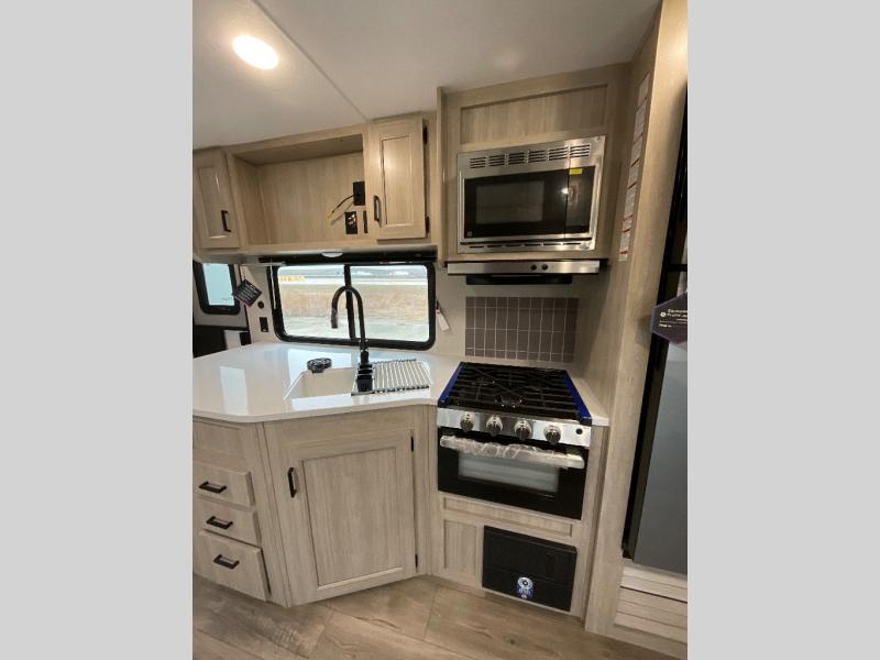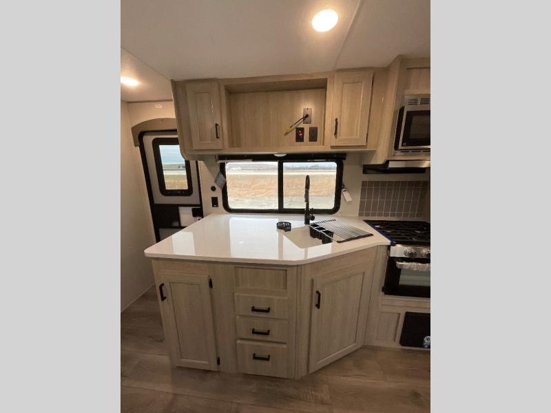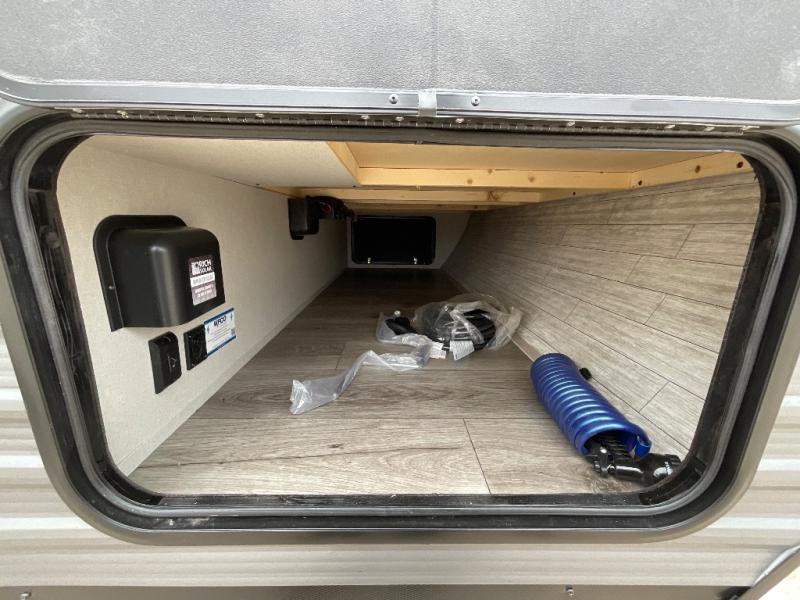 This half-ton friendly trailer is easy to pull and park and is spacious thanks to the large slide out in the main living and kitchen area! You can dine at the booth dinette or choose the free-standing dinette option, and the trundle sofa offers drink holders for your drink when you're relaxing. The rear corner offers a full bathroom and a large wardrobe/pantry for the storage you need. The galley kitchen offers full amenities plus a breakfast bar where you can set out fresh fruit and cereal. And the 15' awning provides protection from the elements plus has the choice of multiple LED colors with the use of the remote.