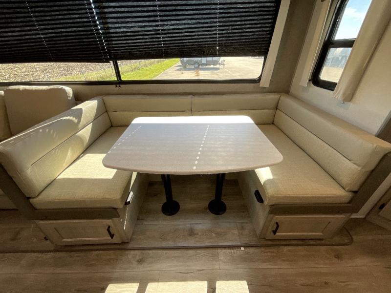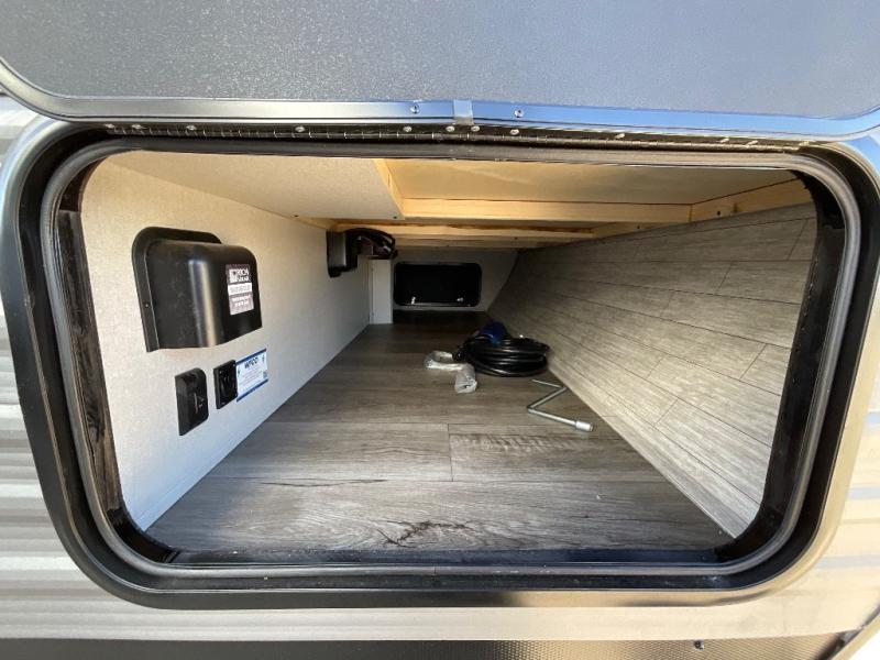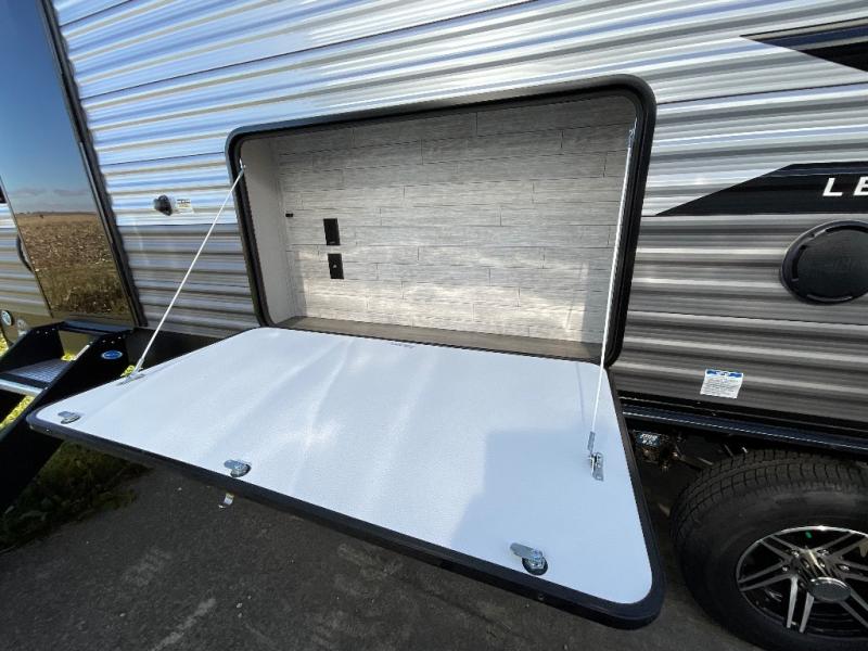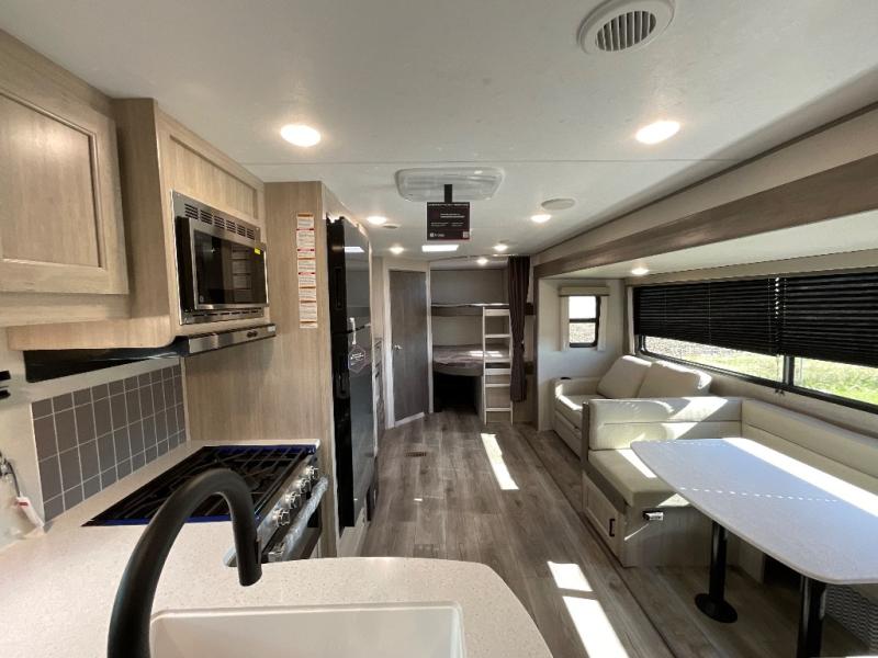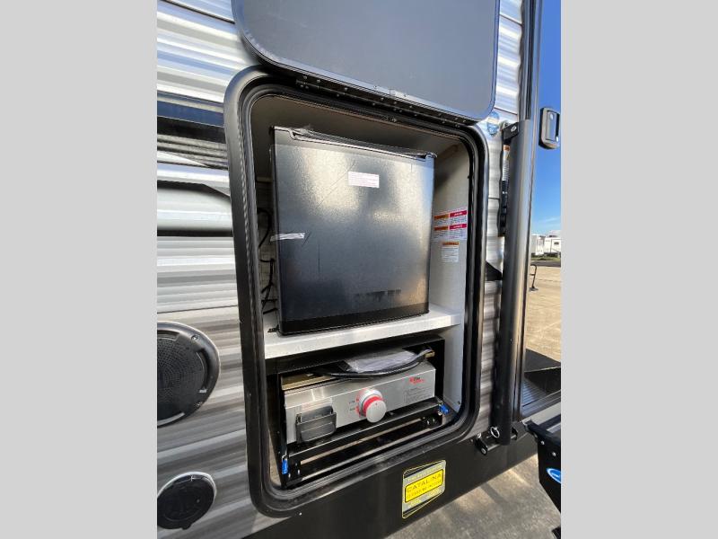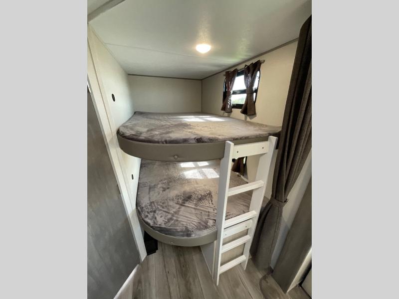 This travel trailer is perfect for your whole crew! Once you arrive at the campground, you can put out the 21' electric awning and start lunch on the exterior camper kitchen with a griddle and mini fridge. There is also a pass-thru storage plus additional exterior storage with a fold-down table and a TV hookup for added convenience. And since there are dual entry doors found on this unit, you can enter in through the full bath in the back, or the main living area towards the front! A large slide provides ample space to move about, and you'll find a trundle sofa and U-shaped dinette here for cozy seating and sleeping space. Speaking of sleeping, there is a front RV queen bed in the bedroom plus double-size bunks in the back for guests!