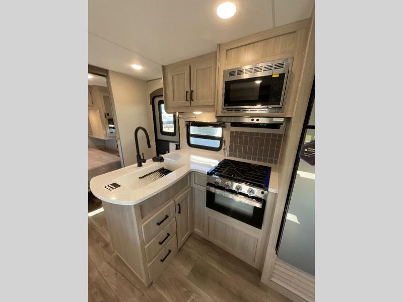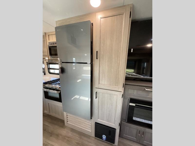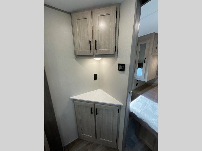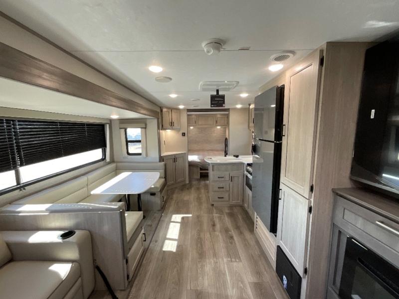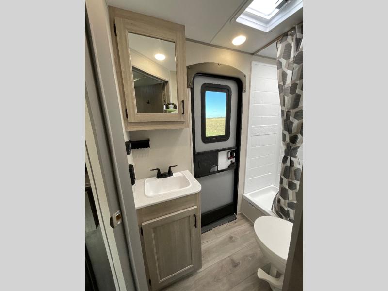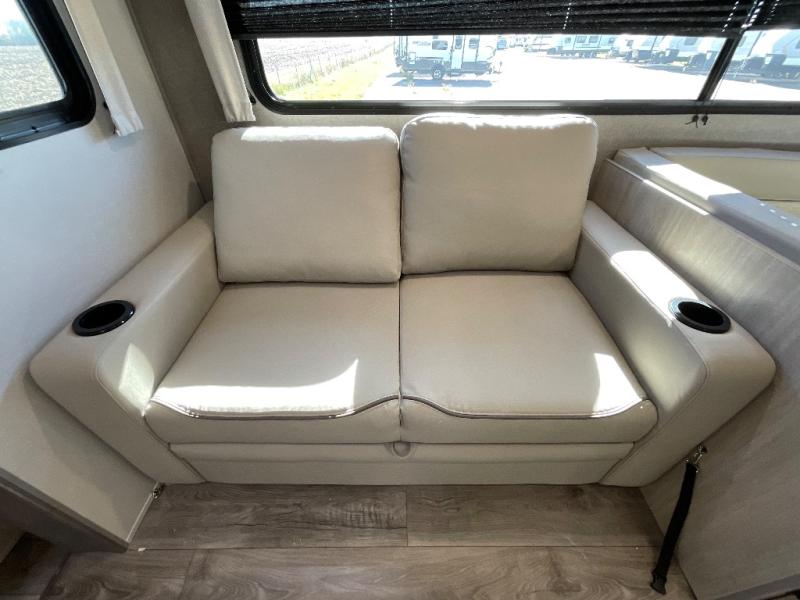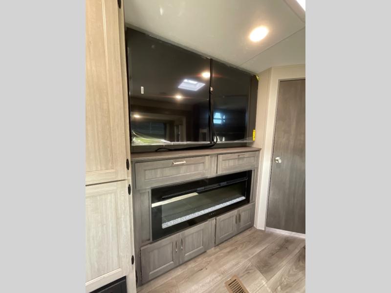 This travel trailer is perfect for your whole crew! Once you arrive at the campground, you can put out the 21' electric awning and start lunch on the exterior camper kitchen with a griddle and mini fridge. There is also a pass-thru storage plus additional exterior storage with a fold-down table and a TV hookup for added convenience. And since there are dual entry doors found on this unit, you can enter in through the full bath in the back, or the main living area towards the front! A large slide provides ample space to move about, and you'll find a trundle sofa and U-shaped dinette here for cozy seating and sleeping space. Speaking of sleeping, there is a front RV queen bed in the bedroom plus double-size bunks in the back for guests!