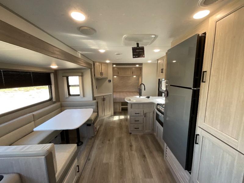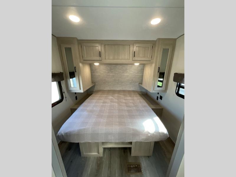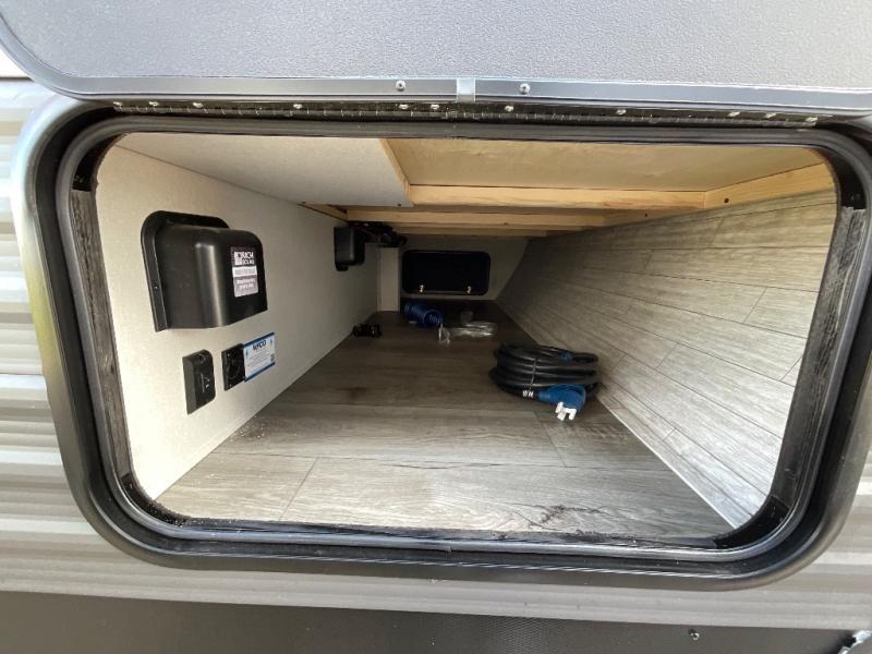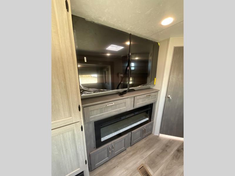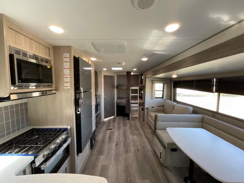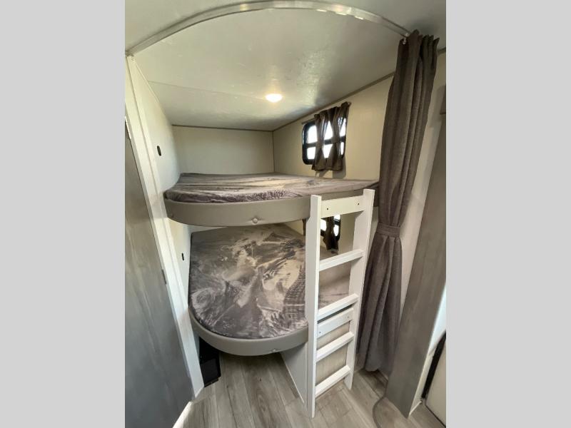 This travel trailer is perfect for your whole crew! Once you arrive at the campground, you can put out the 21' electric awning and start lunch on the exterior camper kitchen with a griddle and mini fridge. There is also a pass-thru storage plus additional exterior storage with a fold-down table and a TV hookup for added convenience. And since there are dual entry doors found on this unit, you can enter in through the full bath in the back, or the main living area towards the front! A large slide provides ample space to move about, and you'll find a trundle sofa and U-shaped dinette here for cozy seating and sleeping space. Speaking of sleeping, there is a front RV queen bed in the bedroom plus double-size bunks in the back for guests!