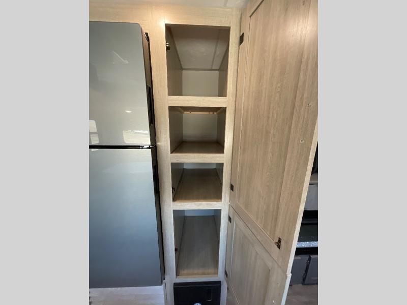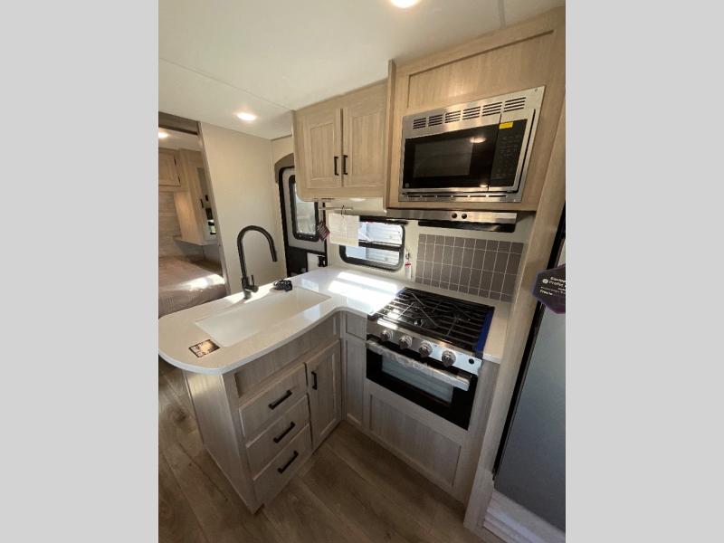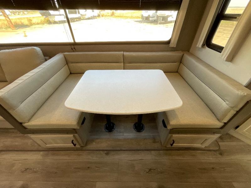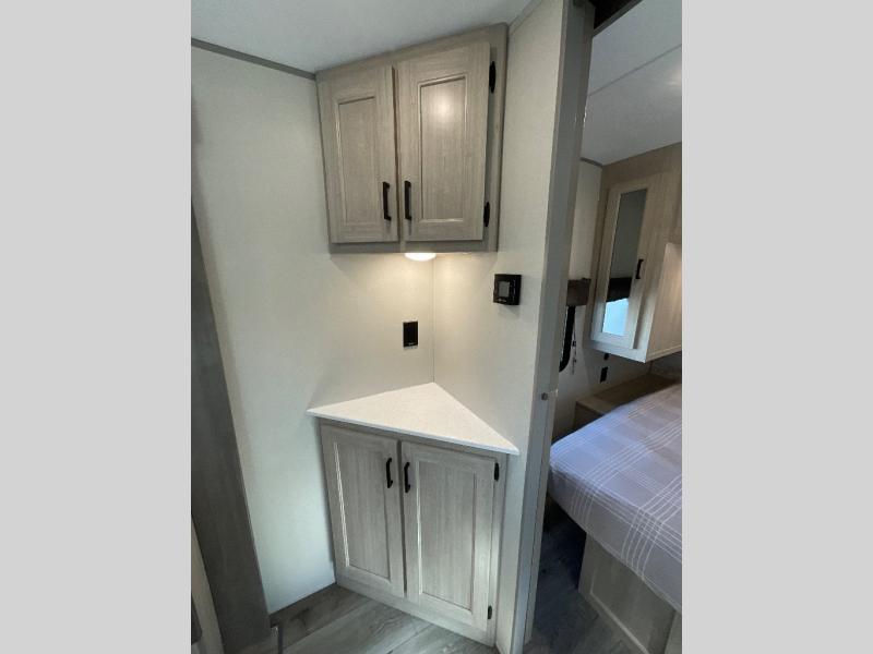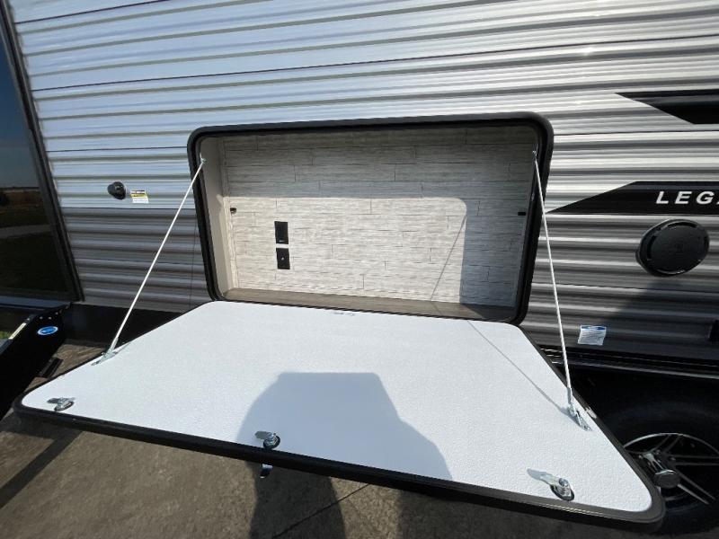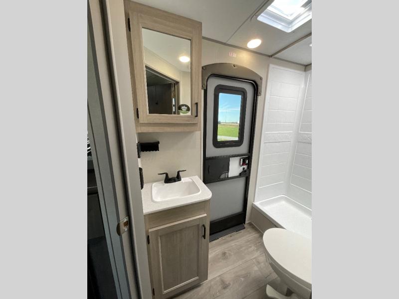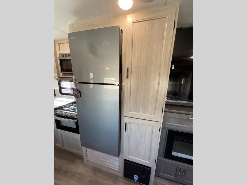 This travel trailer is perfect for your whole crew! Once you arrive at the campground, you can put out the 21' electric awning and start lunch on the exterior camper kitchen with a griddle and mini fridge. There is also a pass-thru storage plus additional exterior storage with a fold-down table and a TV hookup for added convenience. And since there are dual entry doors found on this unit, you can enter in through the full bath in the back, or the main living area towards the front! A large slide provides ample space to move about, and you'll find a trundle sofa and U-shaped dinette here for cozy seating and sleeping space. Speaking of sleeping, there is a front RV queen bed in the bedroom plus double-size bunks in the back for guests!
