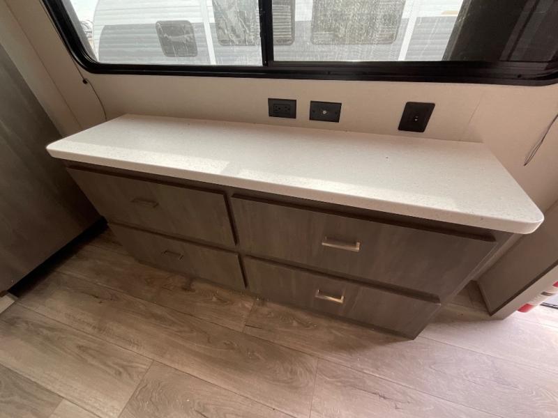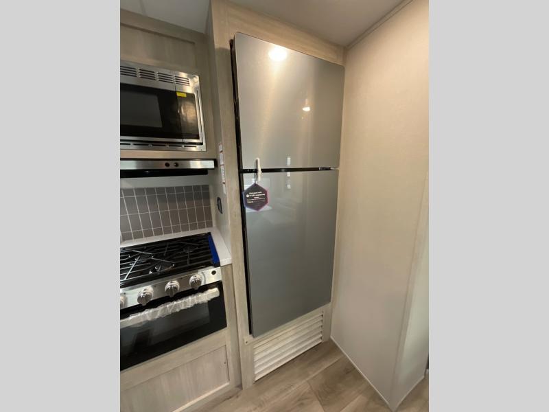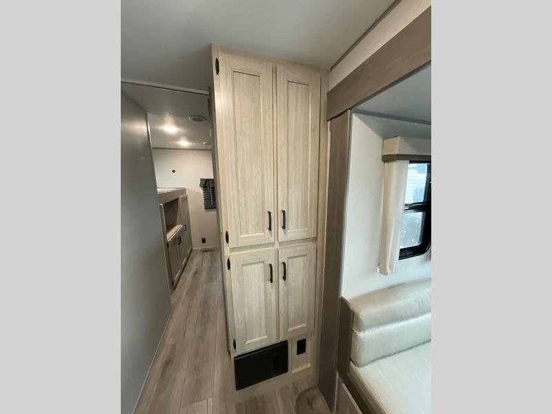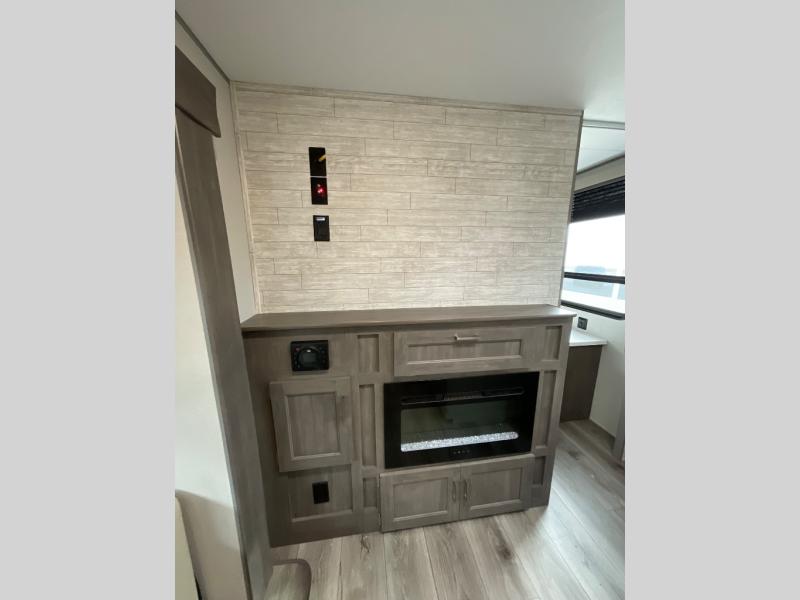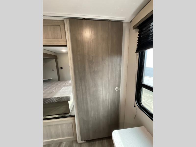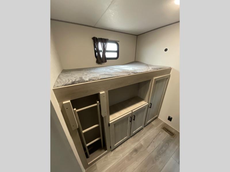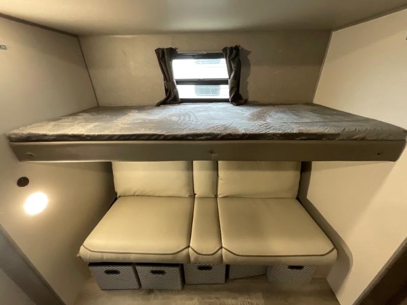 This family-friendly trailer offers lots of floor space thanks to the triple slides throughout! You and your family will love the combined living and kitchen area with a slide out booth dinette and a sofa with drink holders. The L-shaped kitchen counter allows the cook to make meals without moving for anyone trying to get to the full bathroom or the rear bunkhouse. The kids will have their own privacy, two bunk beds, a jack knife sofa with storage totes below plus a TV/wardrobe cabinet. The front private bedroom allows you to sleep like royalty and offers a large closet for your clothing and another closet prepped for a washer/dryer. And don't forget about the full-size camper kitchen and the 21' power awning with multicolor LED lights when you are outside.
