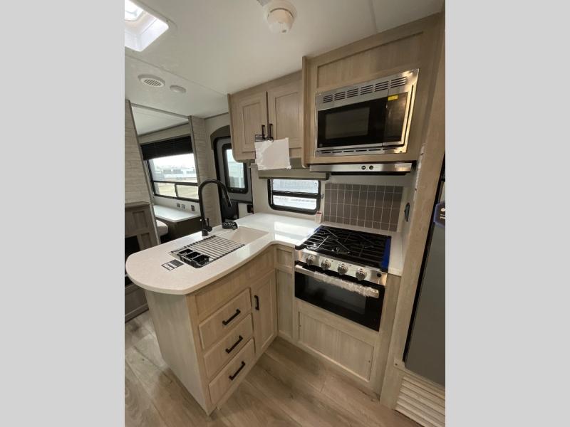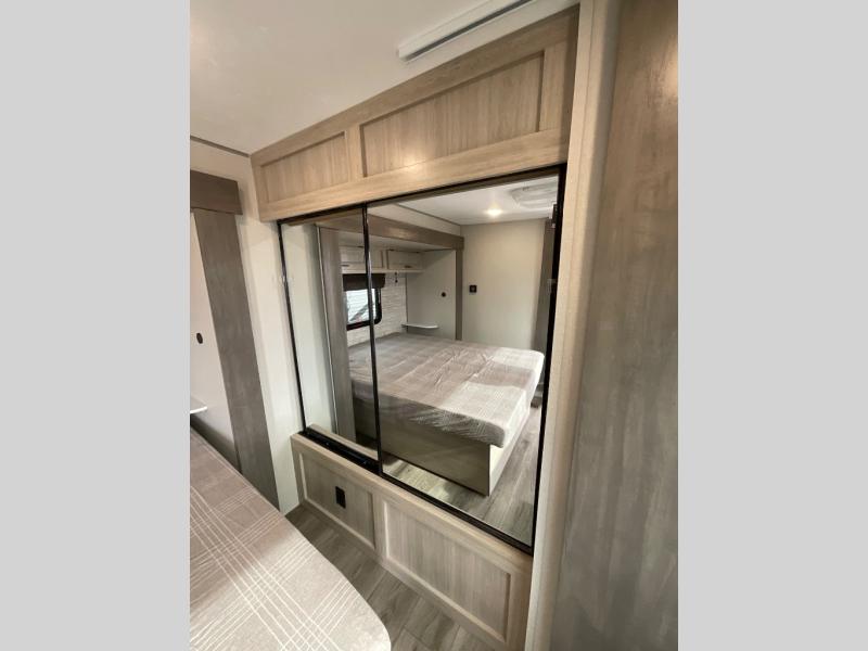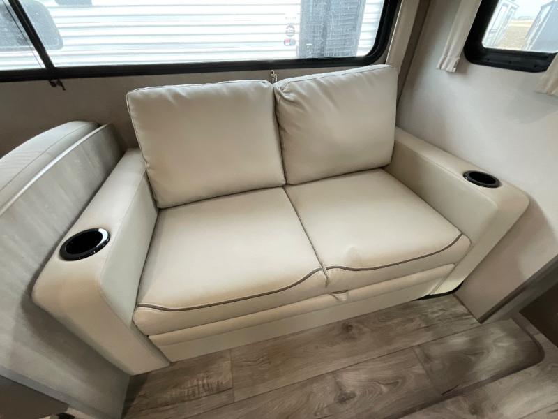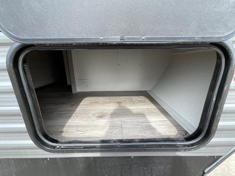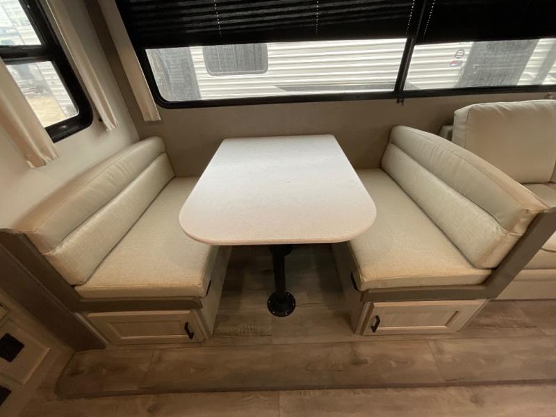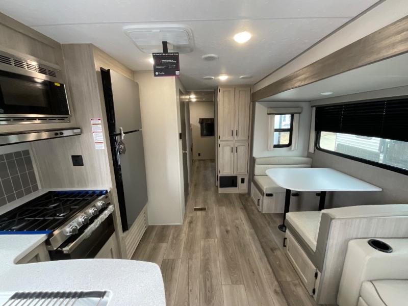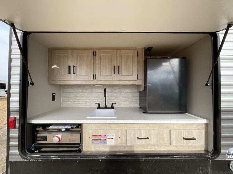 This family-friendly trailer offers lots of floor space thanks to the triple slides throughout! You and your family will love the combined living and kitchen area with a slide out booth dinette and a sofa with drink holders. The L-shaped kitchen counter allows the cook to make meals without moving for anyone trying to get to the full bathroom or the rear bunkhouse. The kids will have their own privacy, two bunk beds, a jack knife sofa with storage totes below plus a TV/wardrobe cabinet. The front private bedroom allows you to sleep like royalty and offers a large closet for your clothing and another closet prepped for a washer/dryer. And don't forget about the full-size camper kitchen and the 21' power awning with multicolor LED lights when you are outside.