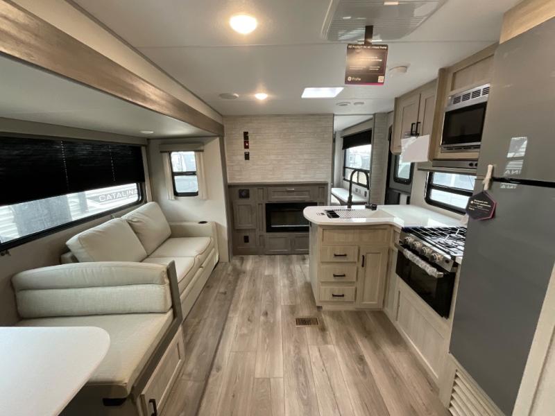 Each Catalina Legacy travel trailer by Coachmen is constructed with a cambered structural steel I-beam frame for added strength and support, plus an enclosed and fully sealed corrugated underbelly to extend your camping season. There is also a seamless Alpha roof membrane, R-7 insulation throughout, full length frame outriggers, plus many more durable construction materials. You will love the 6' 9" interior height, along with Congoleum woodplank linoleum flooring, solid surface kitchen countertops, and hard valance window treatments. Choose a Catalina Legacy today!
