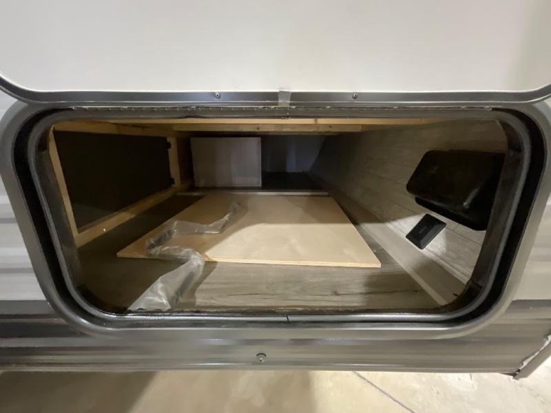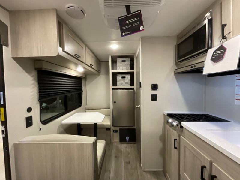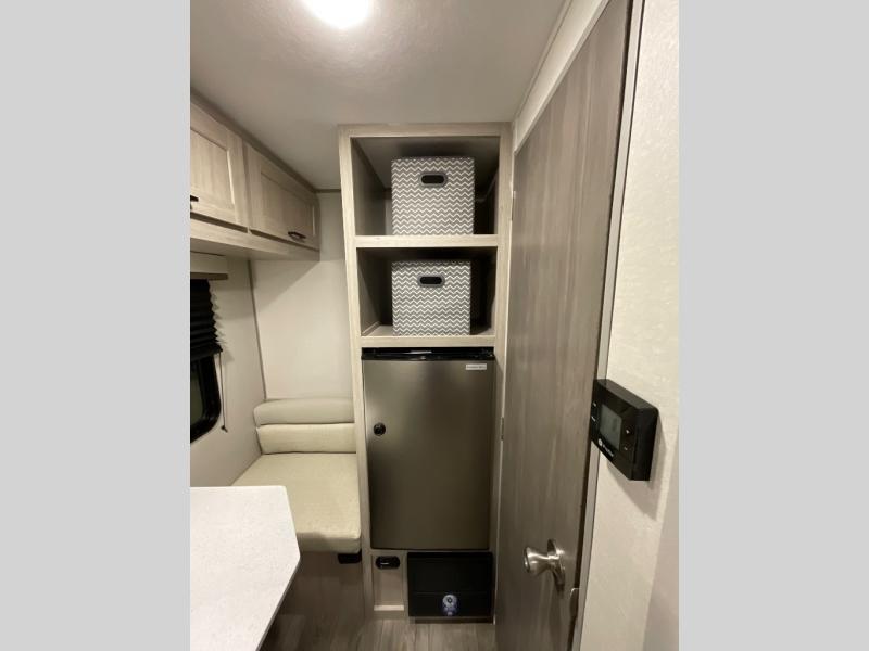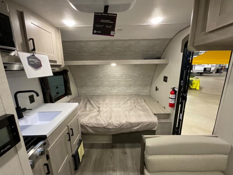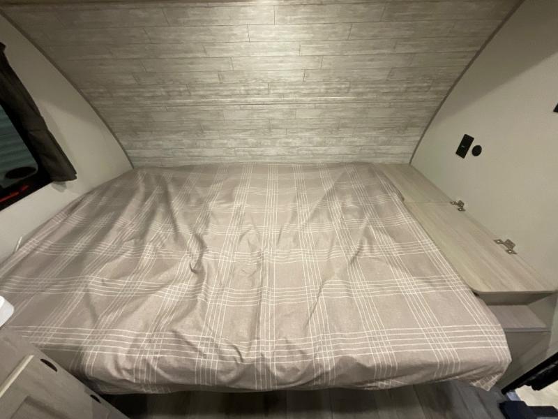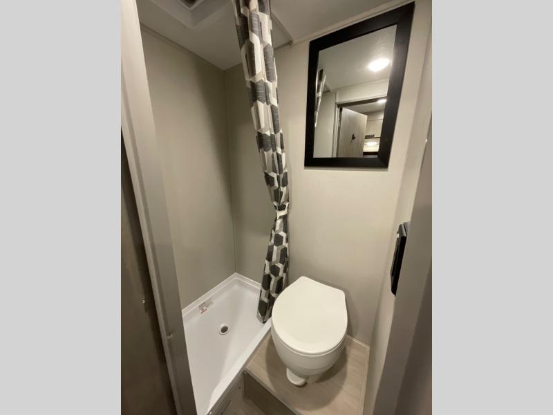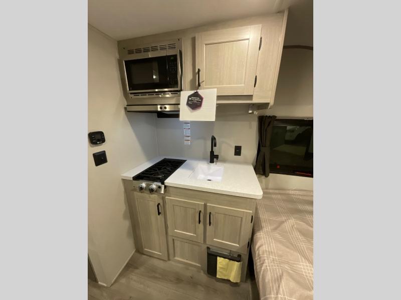Lightweight camping is easier than you think with this travel trailer in tow! The front 54" x 74" queen bed will provide a great night's rest each night, while your overnight guest takes the booth dinette. There is a handy shelf above the front bed for your belongings plus additional bedroom storage. A private bath includes a 24" x 32" shower and a toilet with a mirror behind it so you can freshen up each day. You'll also find a two burner cooktop and microwave oven to make meals each day plus a 3.3 cu. ft. 12V refrigerator for food storage!