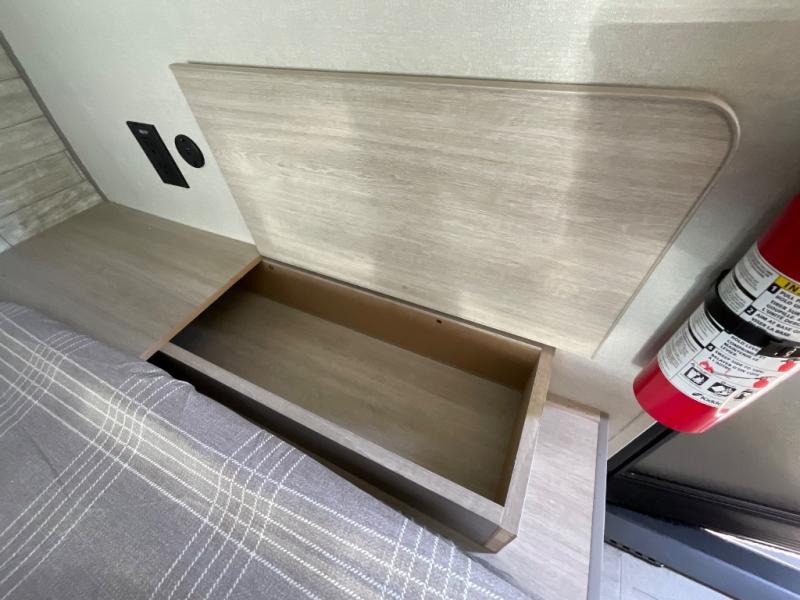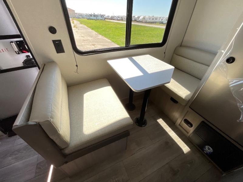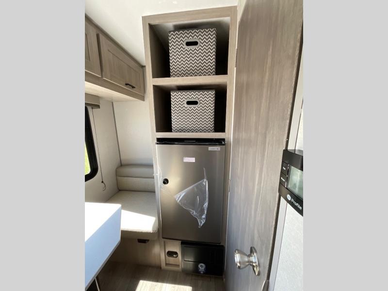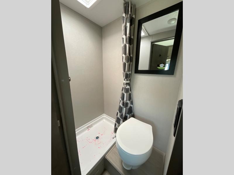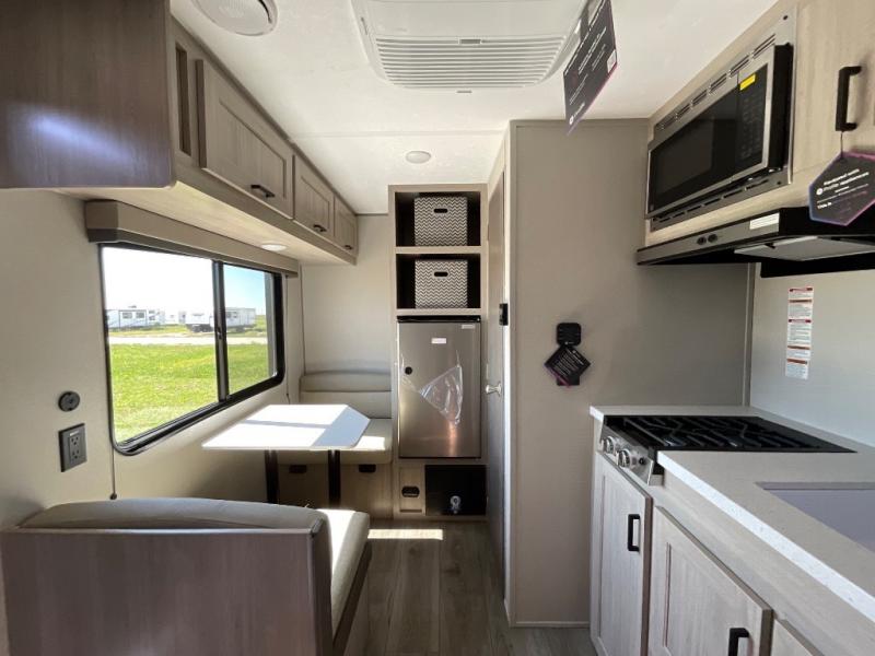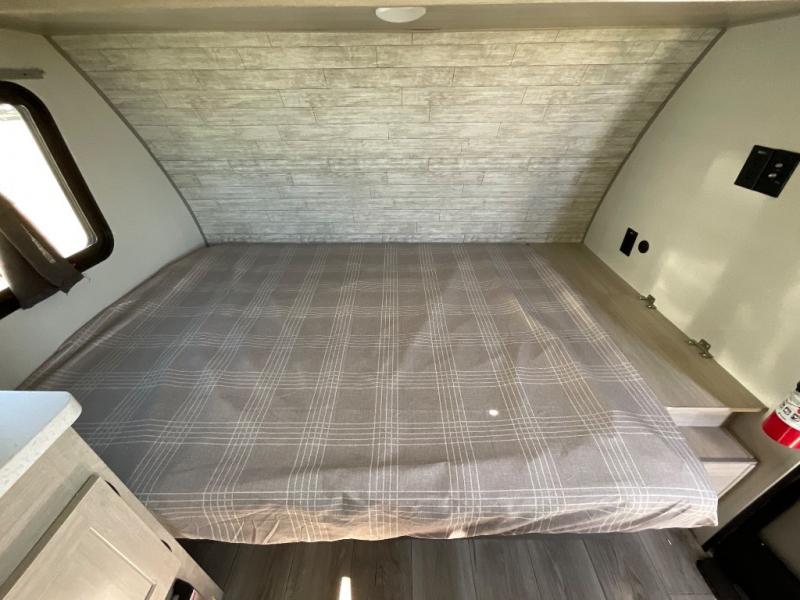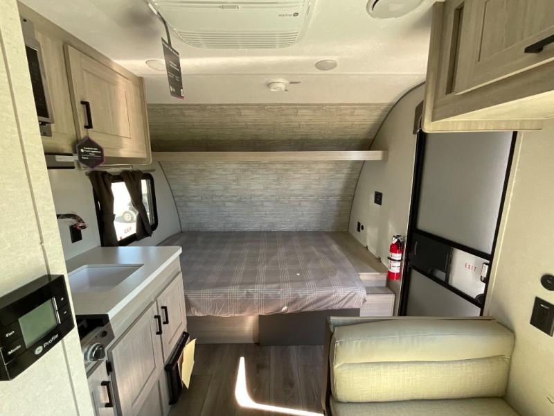Lightweight camping is easier than you think with this travel trailer in tow! The front 54" x 74" queen bed will provide a great night's rest each night, while your overnight guest takes the booth dinette. There is a handy shelf above the front bed for your belongings plus additional bedroom storage. A private bath includes a 24" x 32" shower and a toilet with a mirror behind it so you can freshen up each day. You'll also find a two burner cooktop and microwave oven to make meals each day plus a 3.3 cu. ft. 12V refrigerator for food storage!