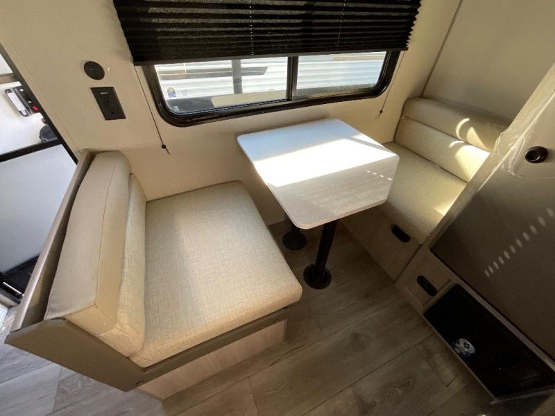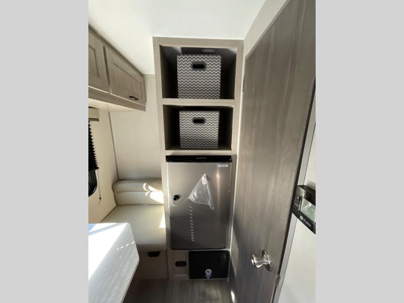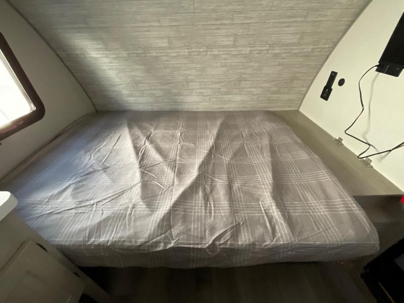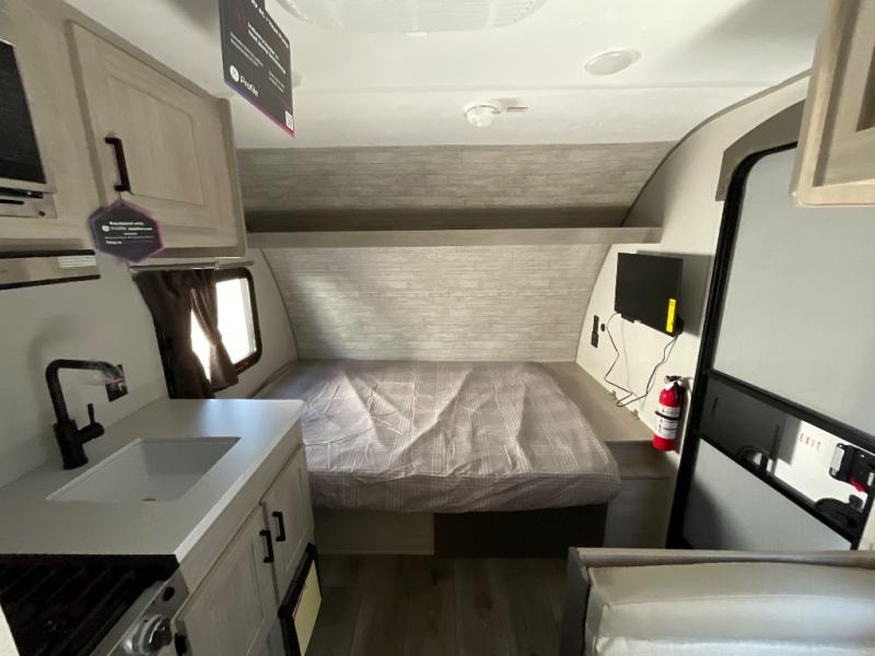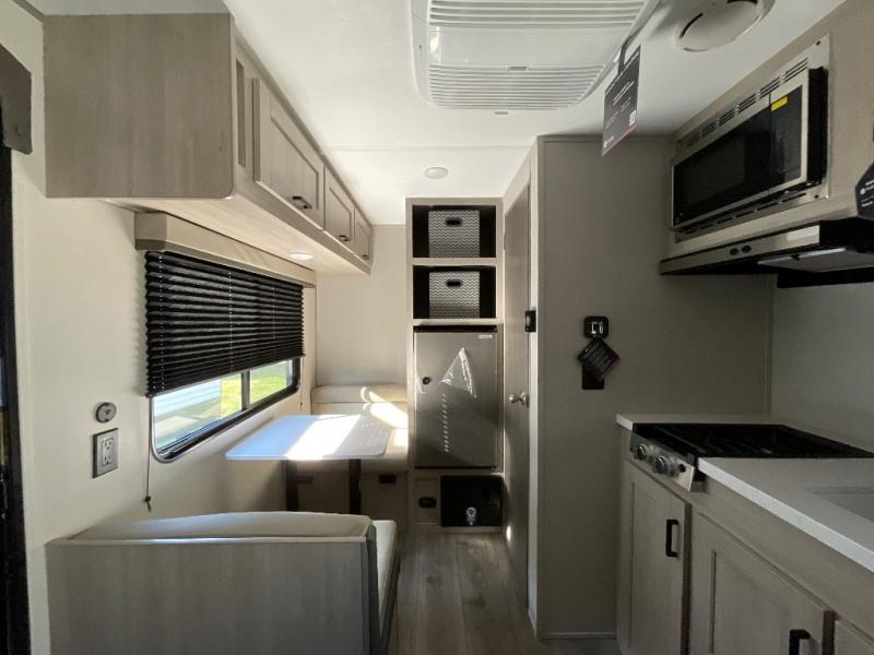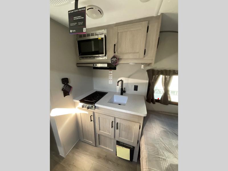 Lightweight camping is easier than you think with this travel trailer in tow! The front 54" x 74" bed will provide a great night's rest each night, while your overnight guest takes the booth dinette. There is a handy shelf above the front bed for your belongings plus additional bedroom storage. A private bath includes a 24" x 32" shower and a toilet with a mirror behind it so you can freshen up each day. You'll also find a two burner cooktop and microwave oven to make meals each day plus a 3.3 cu. ft. 12V refrigerator for food storage!