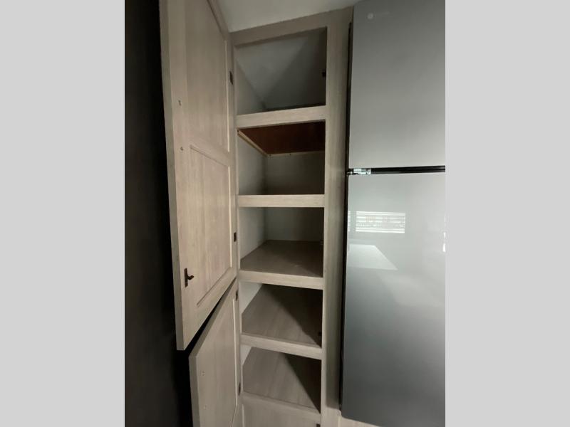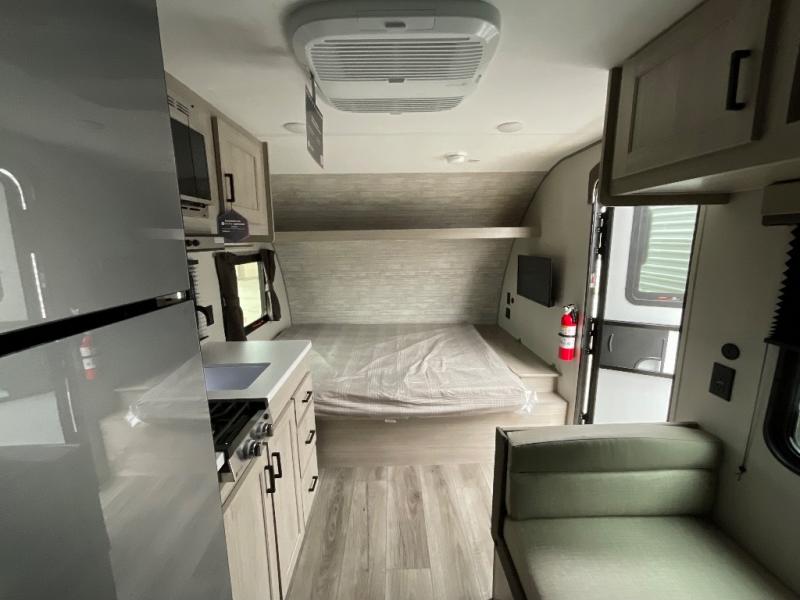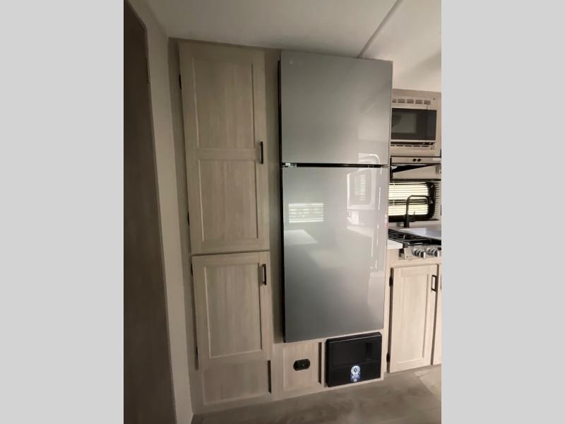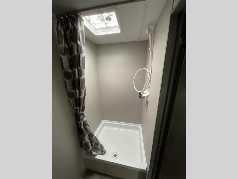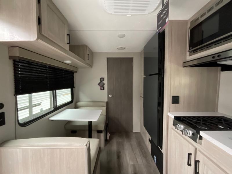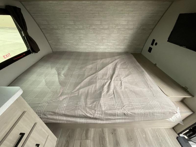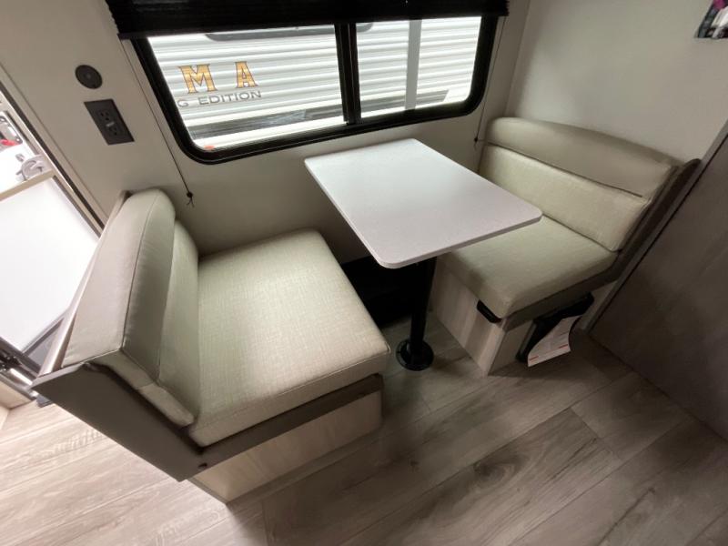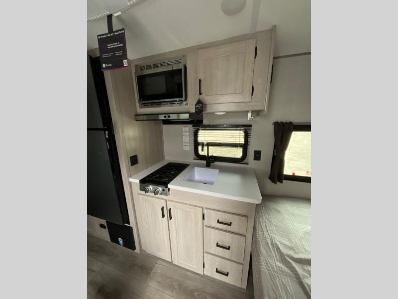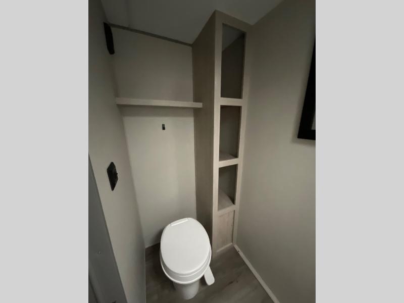 This couple's trailer will be perfect for all your outdoor adventures! There is a queen bed up front with overhead and bedroom storage to keep things tidy. The booth dinette will serve as a great place to enjoy your morning coffee plus there is a pantry and overhead storage in the kitchen for all your goods. A full rear bath includes a 36" x 30" shower, a marine toilet with foot flush, plus a linen closet to keep clean towels close by. This model also includes full kitchen amenities, including a GE two burner cooktop, a GE stainless microwave oven, plus a 3.3 cu. ft. 12V refrigerator to keep food fresh!