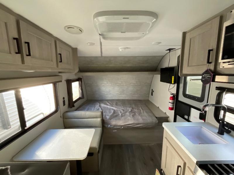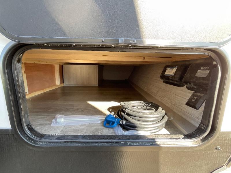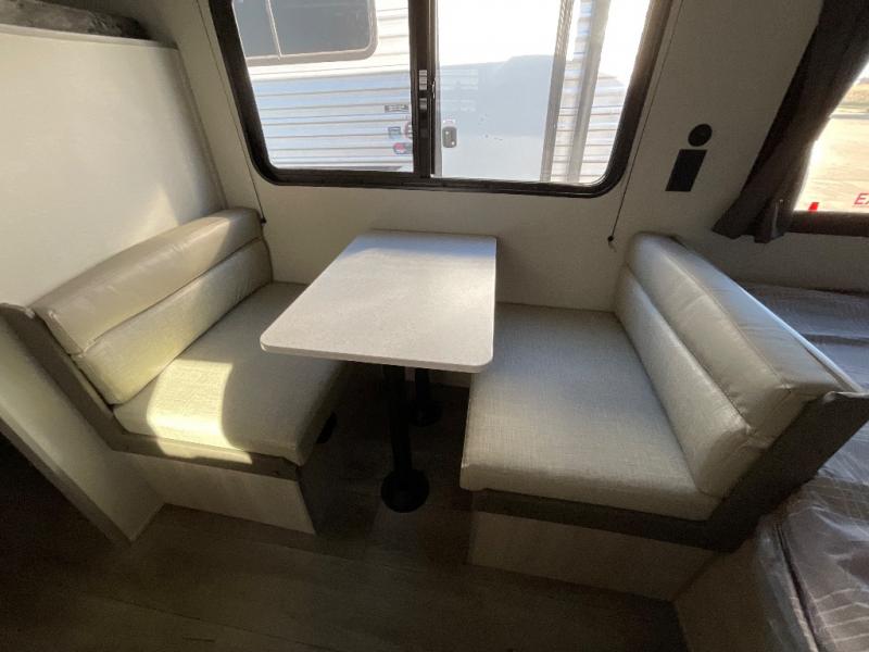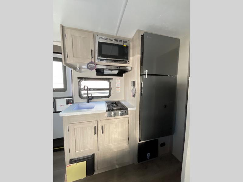 This travel trailers is perfect for a young family or smaller group. You can easily sleep four or more with the rear set of bunk beds and queen bed up front. There is also a booth dinette for inside down-time, as well as complete kitchen and bath amenities so you can cook and stay clean while traveling. The rear corner bath features a toilet and 36" x 30" shower, and it's conveniently located next to the bunk beds which is great for little ones at night. Cooking inside will be easy with a GE stainless two-burner cooktop and single sink, plus there is also a GE microwave oven for snacks and things that you can easily warm up. If you plan to spend most of your time outdoors, you will find plenty of storage space in the front exterior storage compartment, and there is also plenty of storage inside as well.