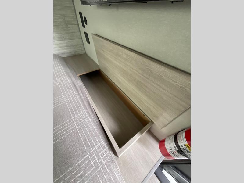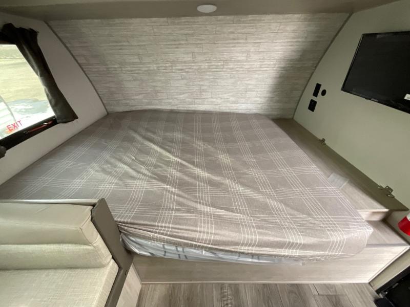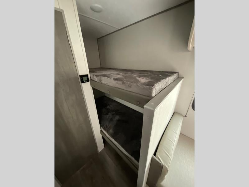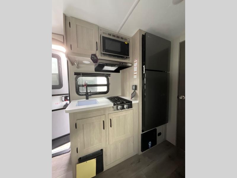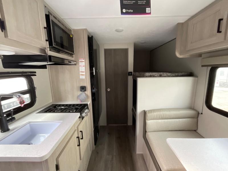 This travel trailers is perfect for a young family or smaller group. You can easily sleep four or more with the rear set of bunk beds and queen bed up front. There is also a booth dinette for inside down-time, as well as complete kitchen and bath amenities so you can cook and stay clean while traveling. The rear corner bath features a toilet and 36" x 30" shower, and it's conveniently located next to the bunk beds which is great for little ones at night. Cooking inside will be easy with a GE stainless two-burner cooktop and single sink, plus there is also a GE microwave oven for snacks and things that you can easily warm up. If you plan to spend most of your time outdoors, you will find plenty of storage space in the front exterior storage compartment, and there is also plenty of storage inside as well.