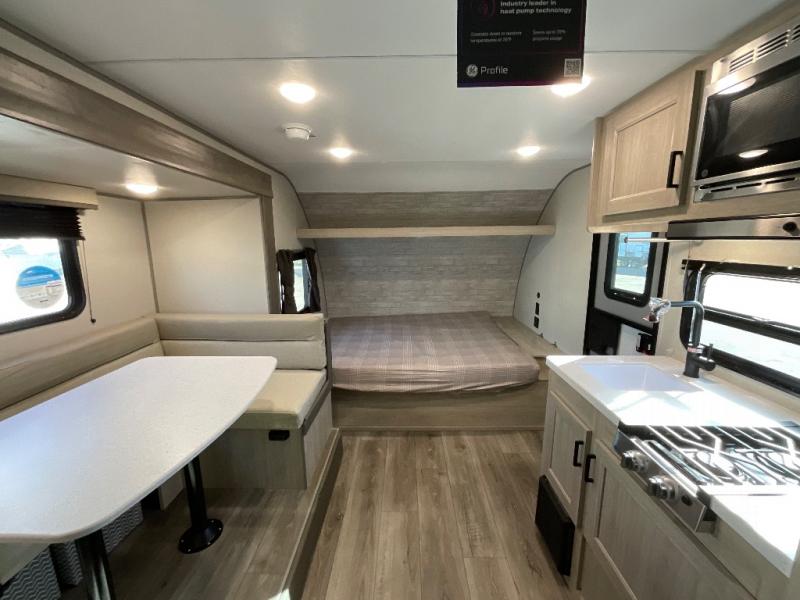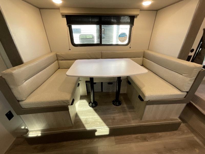 This spacious travel trailer can sleep eight campers each night thanks to the double-size bunks in the back, the U-shaped dinette within the slide out, and the queen bed up front! You can easily make meals for your crew with the two burner cooktop and microwave oven, and leftovers can go in the 10.7 cu. ft. 12V refrigerator! After you've cleaned up in the full bath, head outdoors to relax under the 15' power awning with multicolor LED lights and a remote!