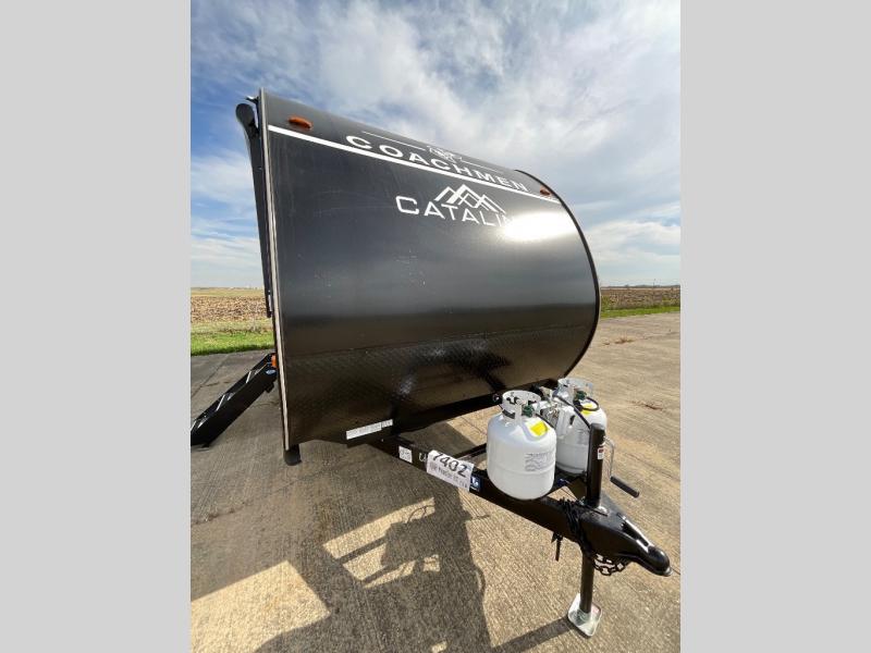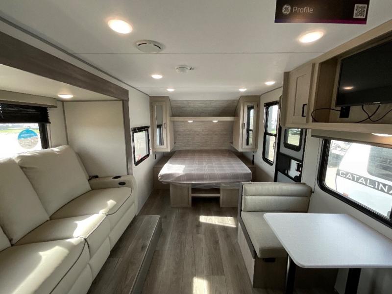 With any Catalina Summit Series 7' by Coachmen RV, you can create an easier adventure with the versatility and simplicity of the shorter lengths and lighter weights! Each includes a premium exterior graphics package, a smooth HD aluminum radius front, and Dexter EZ lube axles with leaf spring suspension. The exterior offers a heavy duty standard tongue jack, a diamond plate rock guard to protect against road debris, exterior RG-6 coax cabling and satellite prep, rear view camera prep, and flush mount baggage doors with radius corners for your outdoor gear. Inside, you will enjoy premium JBL interior speakers, USB charging ports, seamless Thermofoil countertops throughout, a deep basin farm style sink for easy cleanup, and GE kitchen appliances. It's time to choose an affordable and maneuverable single axle trailer today!