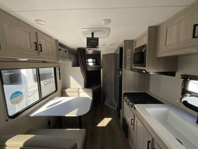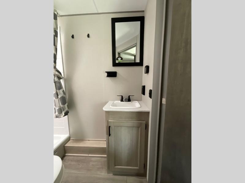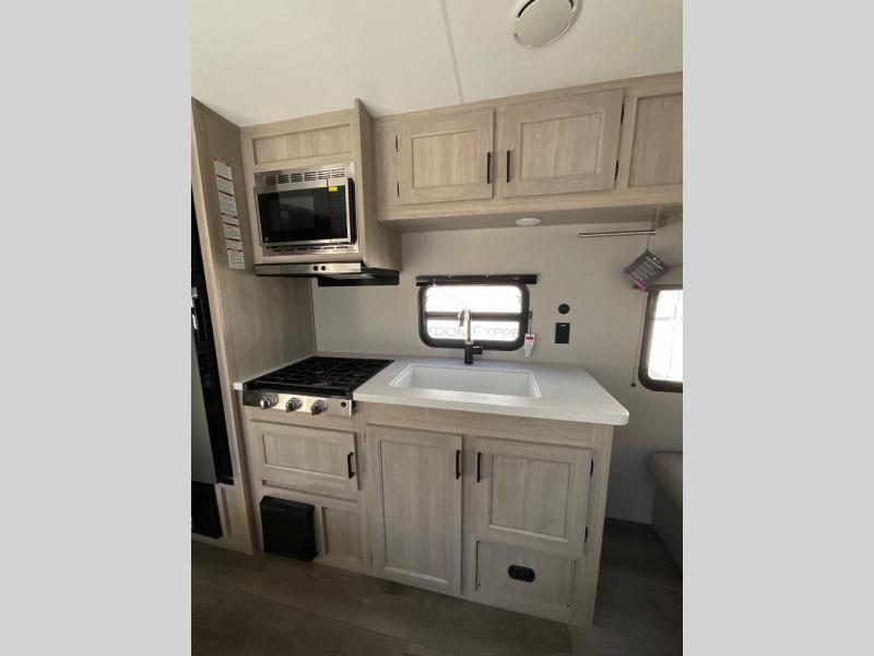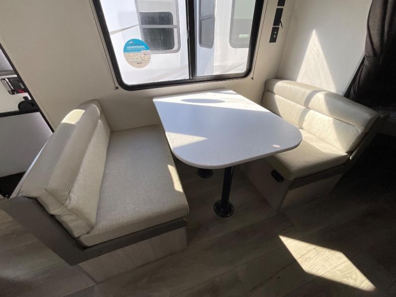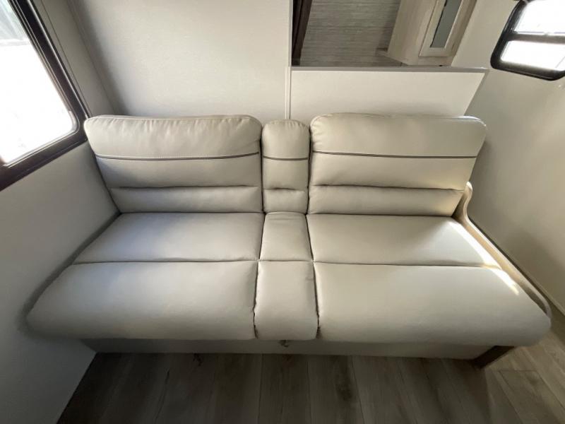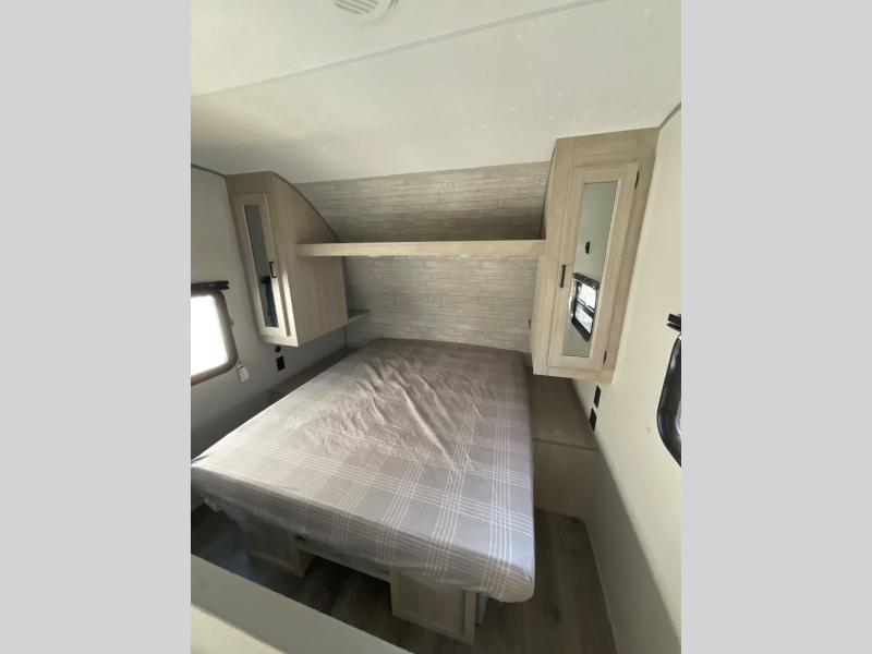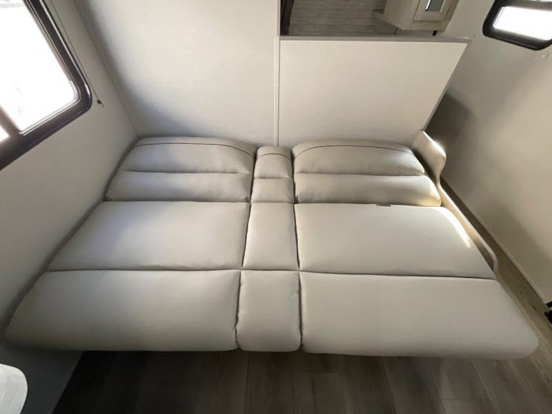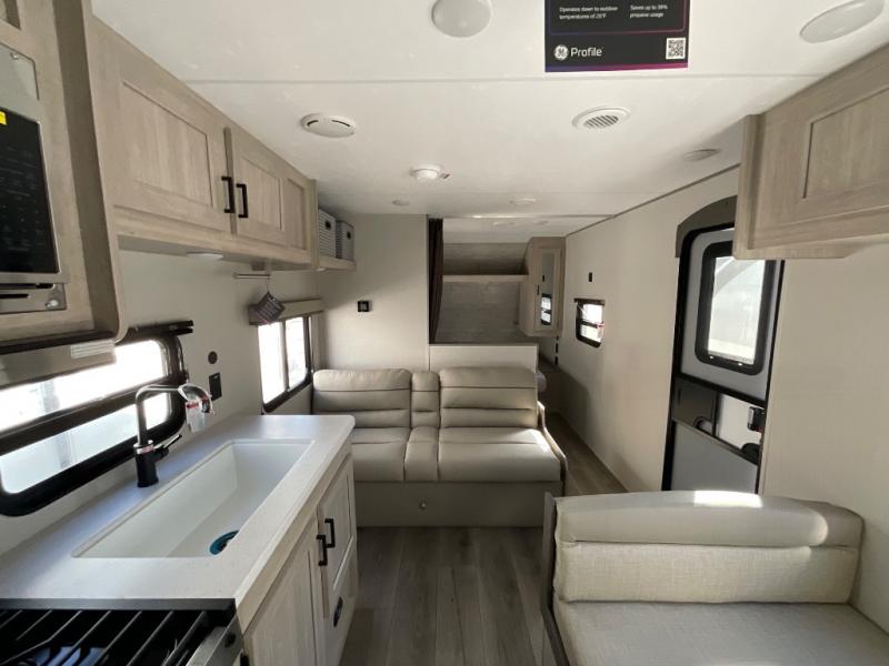 You get to choose to sit at the sofa or at the booth dinette when you are relaxing inside. There is a shelf with storage totes above the sofa for your belongings, and an additional overhead cabinet above the dinette for games. Maybe you want to rest on your own queen bed in the front semi-private bedroom before you make a meal in the kitchen or take a hike through the trails around the lake. The 15' electric awning with multi-color LED lights and a remote offers an outdoor living area where you can visit with other RVers. The kids will love their own double-size bunks that they can share with a friend or two, and the full bathroom is nearby as an added convenience.