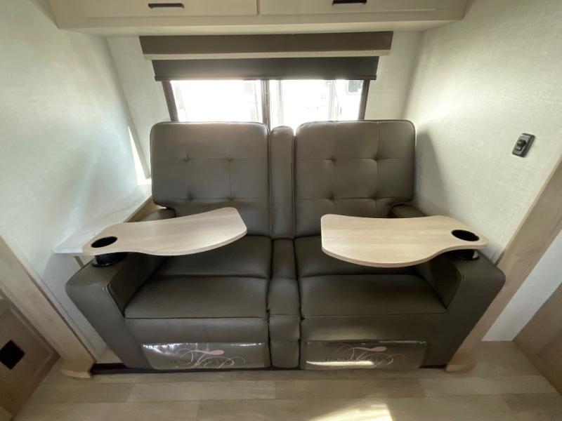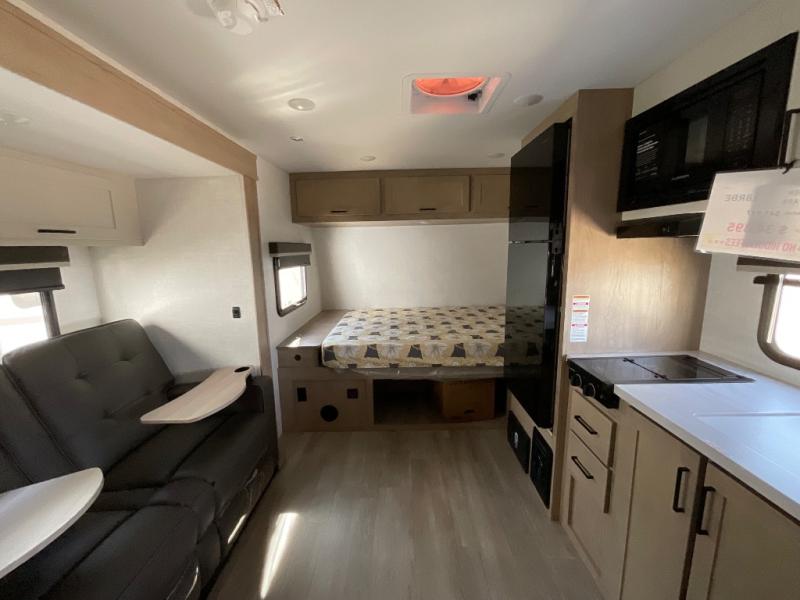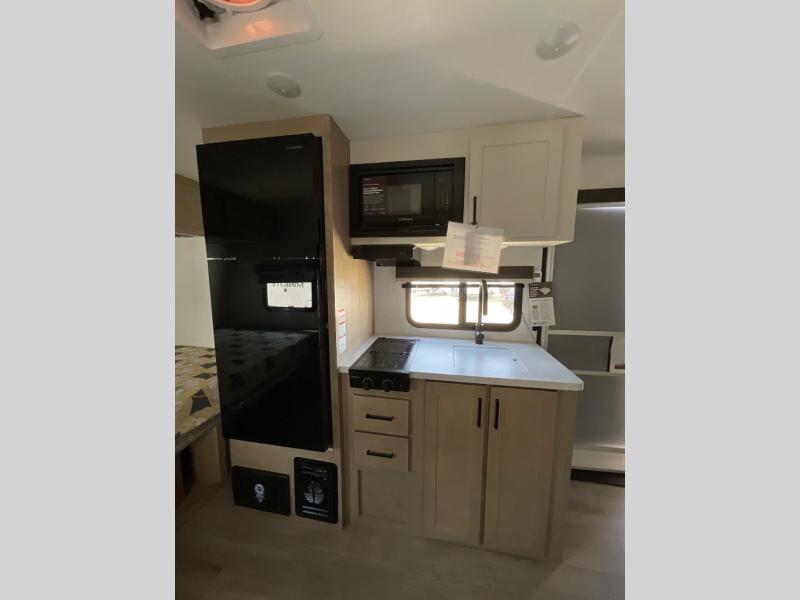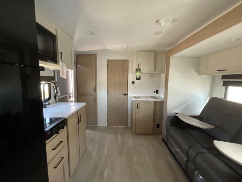 Time at the campground in this travel trailer will be time well spent. Once you arrive at your destination, you can put out the 14' electric awning, unpack the pass-through storage, then head inside for lunch. There is an air fryer convection microwave plus a dual burner cooktop to make meals each day, and the 10 cu. ft. 12V refrigerator will keep your food fresh. A legless dinette slide provides a place to dine together and even let a guest sleep over. If you're not needing the extra sleeping space, just choose the optional theater seating! You'll find the front queen bed will give you a great night's rest, and there is a full rear bath on board that will allow you to freshen up each morning.
