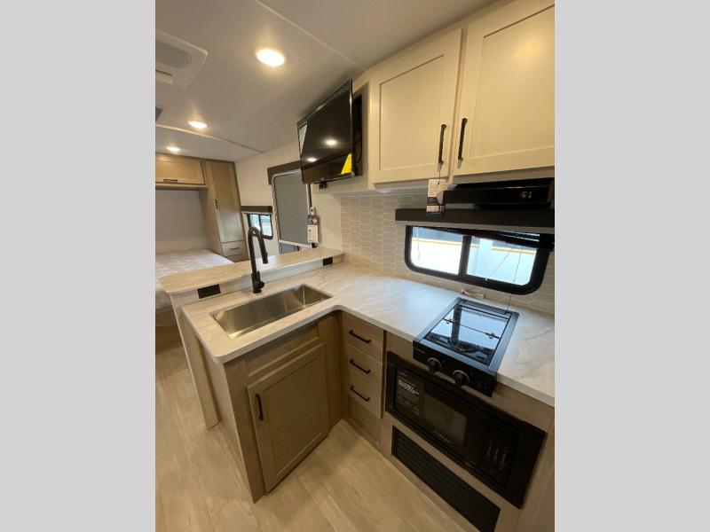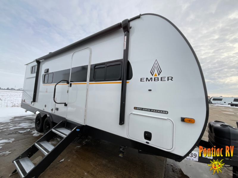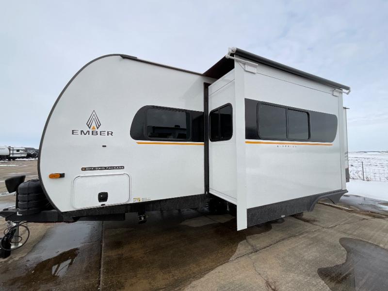 With any E-Series travel trailer by Ember RV you will enjoy a lightweight RV with all the "Essentials" needed for memorable trips in the great outdoors! Each model is constructed with durable laminated Azdel Onboard composite walls, a full walkable roof with a one-piece Tufflex PVC roofing material, and a gel-coated fiberglass exterior. The Dexter axles with E-Z lube hubs and forward self-adjusting electric brakes plus Goodyear Endurance tires will provide a smooth tow from home to campground. You will appreciate the Congoleum DiamondFlor "carpetless" interior that is easy to clean, and the hardwood framed cabinet doors will create a more residential feel. Each model includes a tankless on-demand water heater for endless hot showers and an 18,000 BTU Max Cool "Whisper Quiet" A/C, which is the largest single A/C in its class! If you're looking for off-grid capabilities, you might want to choose the optional Off-Grid Solar Package with 400 total watts of solar panels, a 2,000W Pure Sine wave inverter, and a Victron MPPT solar controller!