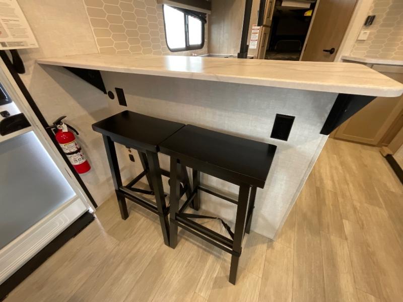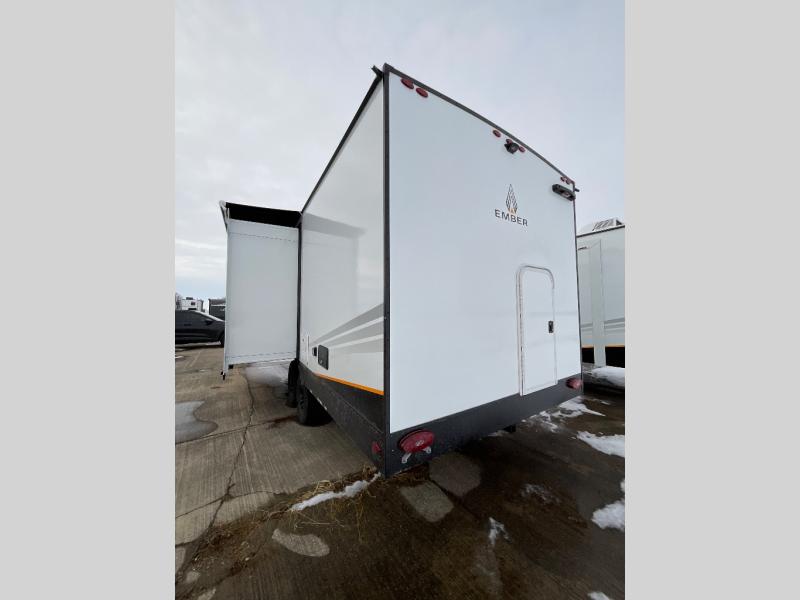 You'll love every minute spent in this spacious travel trailer that can sleep up to six. The patent-pending repositionable EmberTrack E-Track bunk/storage system includes 74" x 45" cargo space, and there are multiple single/double bunk configurations to fit your needs. The front walk-around true residential queen bed includes dual nightstands and dual wardrobes, plus a privacy curtain if you have guests staying over. This E-Series kitchen includes an air fryer convection microwave, a two burner cooktop, plus a breakfast bar with bar stools so you can visit with the chef as they cook meals. A legless dinette or optional theater seating will provide a place to dine, or you can take your plate outdoors to sit under the 14' power awning with a dimmable LED light. You'll also find a pass-through storage outside, along with a docking station and a kayak/bike storage door!