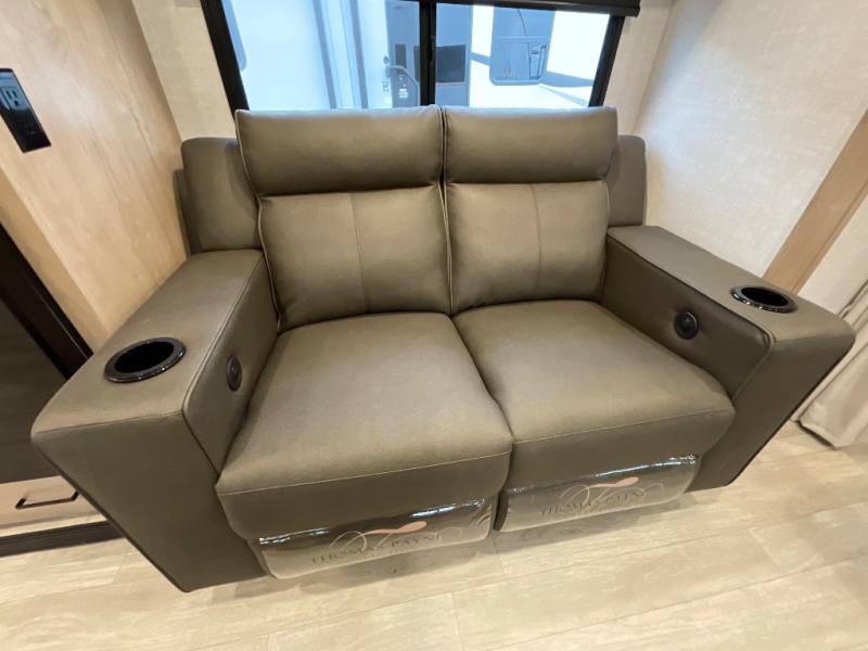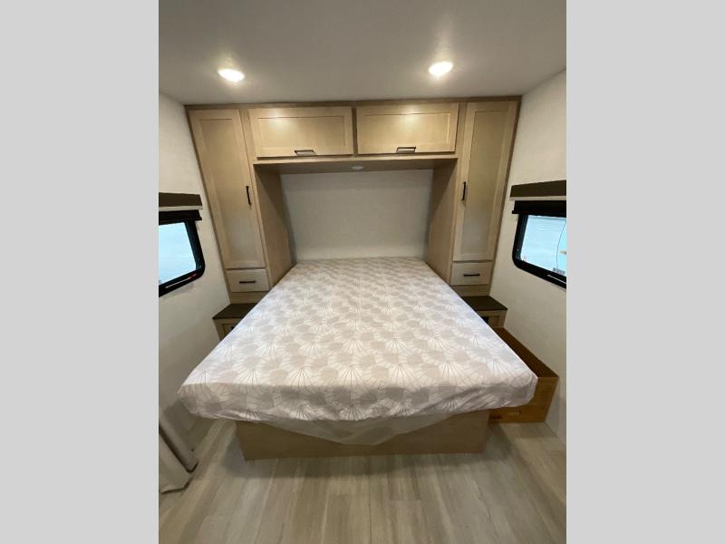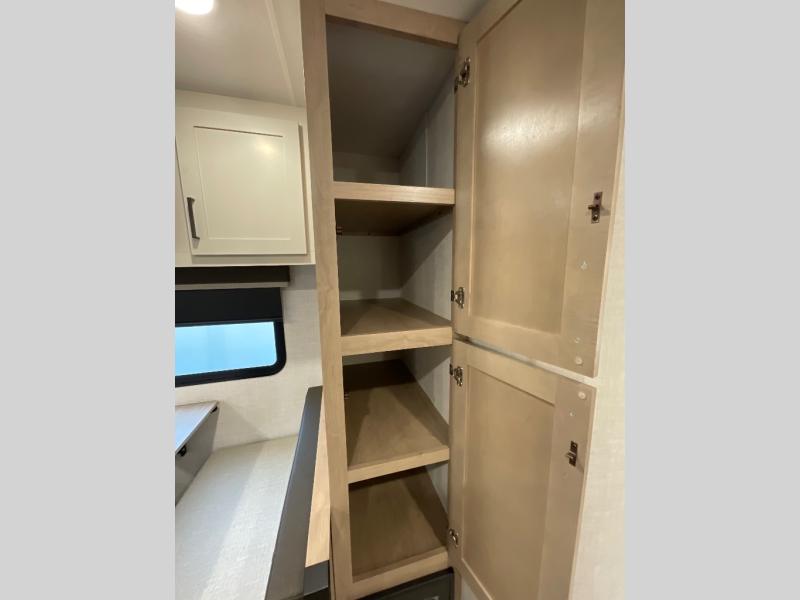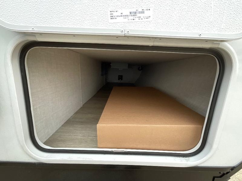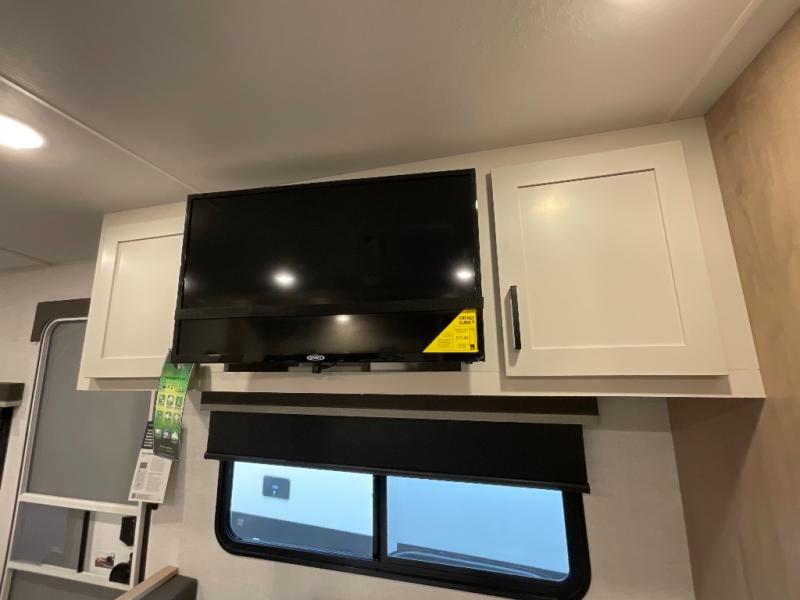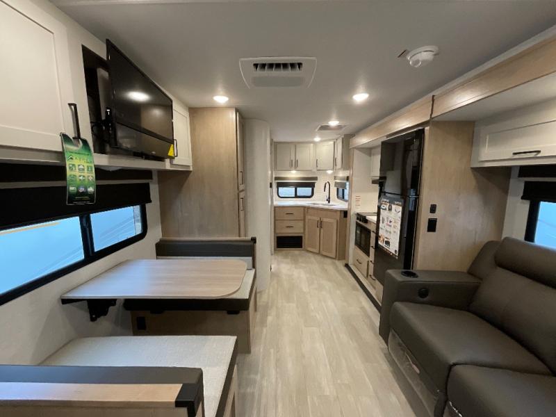 Camping trips just got a whole lot better in this tandem axle, single slide travel trailer! Once you arrive at the campground, you can put out the 18' power awning, grab your camp chairs from the pass-through storage, and relax! When you're getting hungry, head to the rear corner kitchen that includes ample counter space, a two burner cooktop, plus a 10 cu. ft. 12V refrigerator. There is also a pantry to store snacks and paper goods! You can get cozy after dinner on the theater seating that sits directly across from the HDTV for easy viewing, and there is a legless dinette if game night is in order. When you're ready for bed, the queen bed up front will provide a great night's rest, and there is a privacy curtain if you have a guest staying over on the dinette. And don't worry about storage space; this model has you covered with dual bedroom wardrobes, overhead cabinets, and convenient shoe storage!