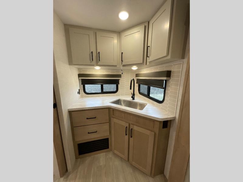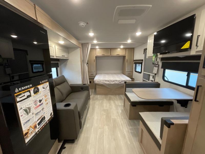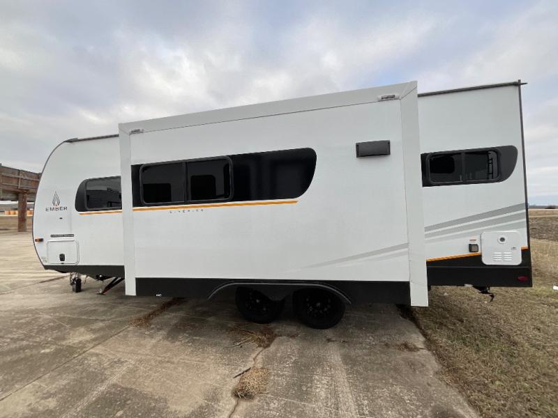 With any E-Series travel trailer by Ember RV you will enjoy a lightweight RV with all the "Essentials" needed for memorable trips in the great outdoors! Each model is constructed with durable laminated Azdel Onboard composite walls, a full walkable roof with a one-piece Tufflex PVC roofing material, and a gel-coated fiberglass exterior. The Dexter axles with E-Z lube hubs and forward self-adjusting electric brakes plus Goodyear Endurance tires will provide a smooth tow from home to campground. You will appreciate the Congoleum DiamondFlor "carpetless" interior that is easy to clean, and the hardwood framed cabinet doors will create a more residential feel. Each model includes a tankless on-demand water heater for endless hot showers and an 18,000 BTU Max Cool "Whisper Quiet" A/C, which is the largest single A/C in its class! An EmberLink Smart RV system will let you easily control features such as lights and slides and you can wash away those rainy day blues by watching the HDTV with a built-in Bluetooth AV system. If you're looking for off-grid capabilities, you might want to choose the optional Off-Grid Solar Package with 400 total watts of solar panels, a 2,000W Pure Sine wave inverter, and a Victron MPPT solar controller!