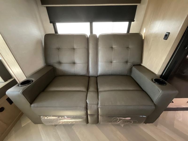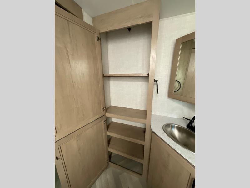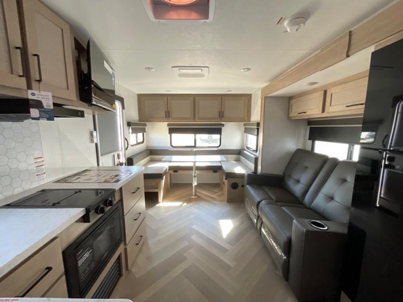 This dual entry travel trailer is sure to bring great camping memories! Once you've unloaded the pass-through storage, you can put out the power awning with dimmable LED lights. The theater seating slide out in the combined kitchen and living room provides a place for you to relax, and the rear U-shaped dinette will be the perfect place to dine together. This space can also double as sleeping space for any guests you may have! The chef of your group can make lunch on the dual burner cooktop or in the air fryer convection microwave. You will love how spacious the walk-through bath is, and the front master bedroom includes a queen bed for a great night's rest. There are also dual nightstands and dual wardrobes, a TV backer if you want to add your own television, and your own exterior entry door so you can sneak out in the morning to fish!