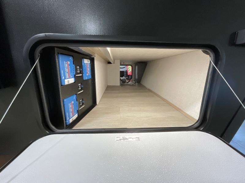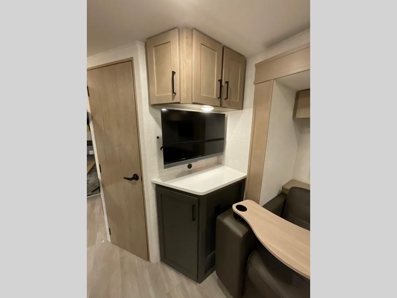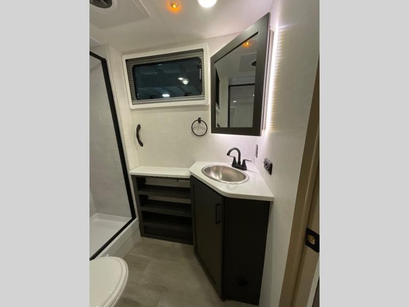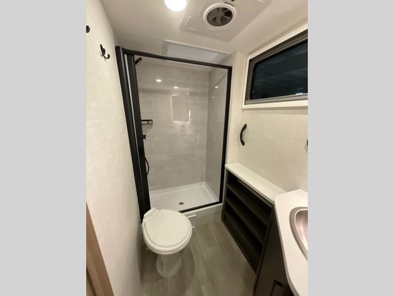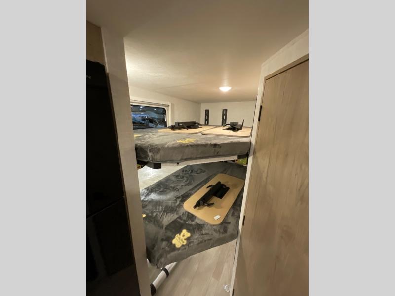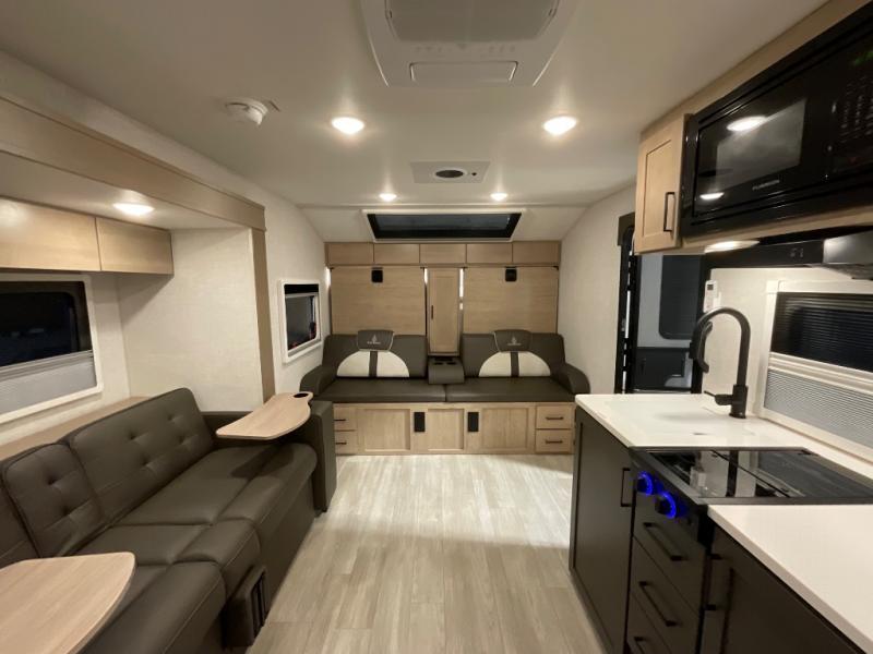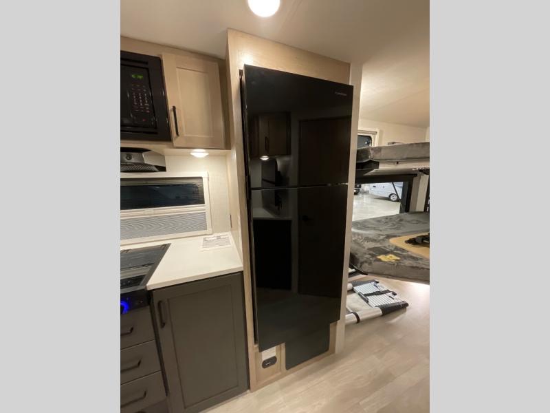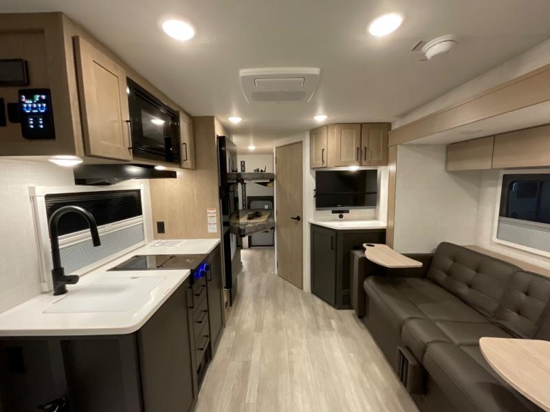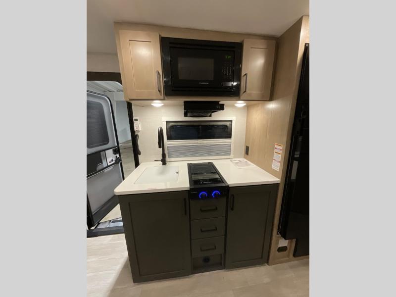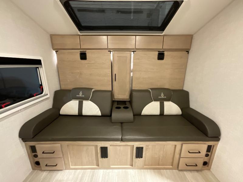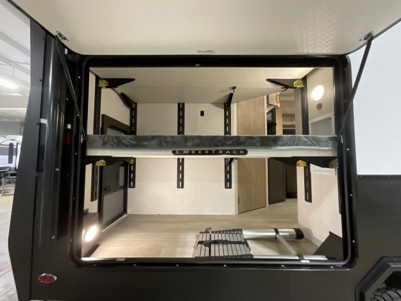 You're going to love everything about this travel trailer that can comfortably sleep three to six people each night, depending on your bunk configurations. There is a spacious storage locker that can be used for hiking gear, plus a kayak/bike storage door for quick and easy packing. The Embertrack system lets you convert the benches to twin bunks, double-size bunks, a desk, or remove them altogether for more storage space. You will enjoy the queen-size Murphy bed up front, along with the "stargazer" skylight for nighttime views, along with dual nightstands and dual wardrobes to keep your clothes tidy. And in the morning you can relax on the jack-knife sofa with a removable table once the bed is put away. This trailer also includes a full kitchen with a 12V refrigerator, an air fryer convection microwave oven, a dual burner cooktop, and a stainless steel sink for easy clean-up.