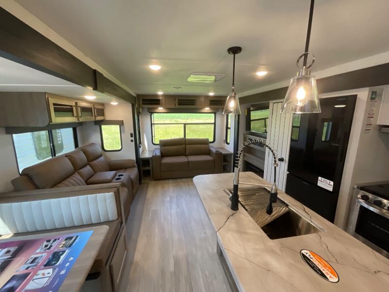 You're going to feel right at home in this travel trailer! The front private bedroom has a queen bed slide for a good night's rest, a dresser and front closet for your clothes, and another closet with washer and dryer prep. Freshen up each morning in the full bathroom with the 32" x 40" shower with a seat and then head to the kitchen to fry up some eggs on the stainless steel oven and range. You will also appreciate having a kitchen island for easier meal prep and a walk-in pantry to easily see your canned goods and snacks. The booth dinette offers a comfortable place to dine, play, and even sleep once converted. What better way to wind down your nights than to relax on either the rear sofa or in one of the two recliners across from the entertainment center with a fireplace!