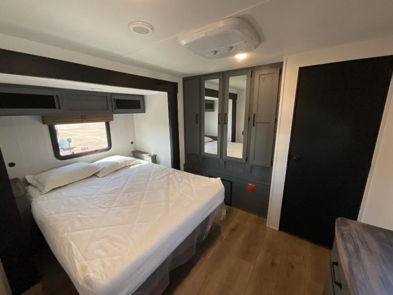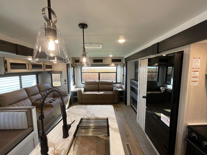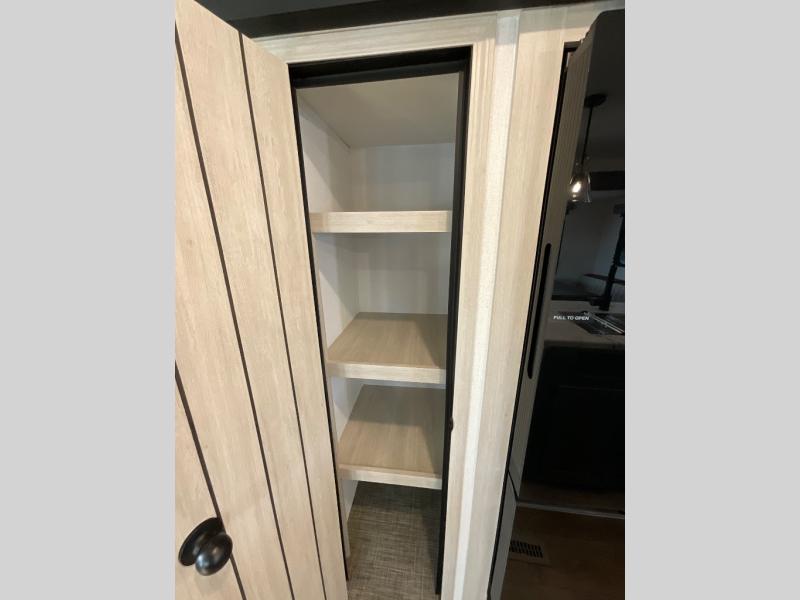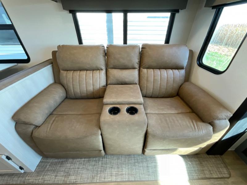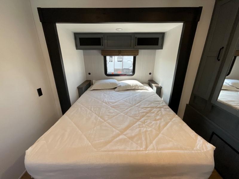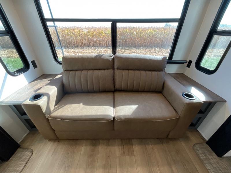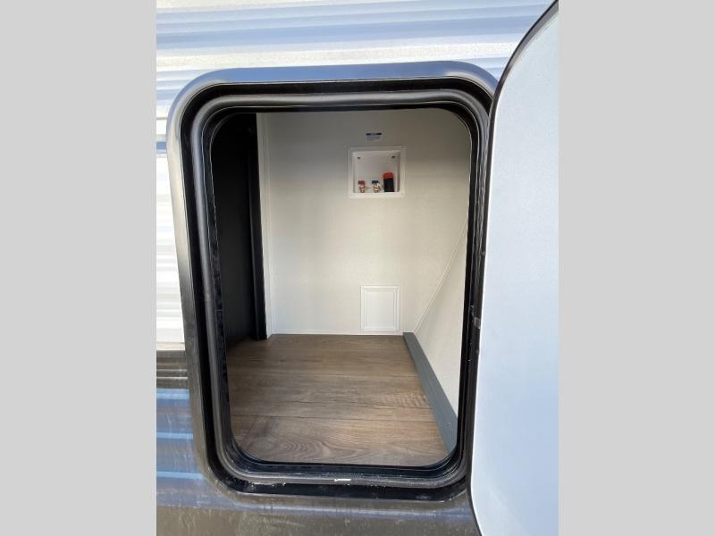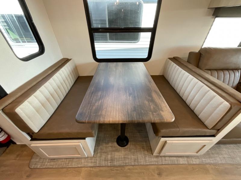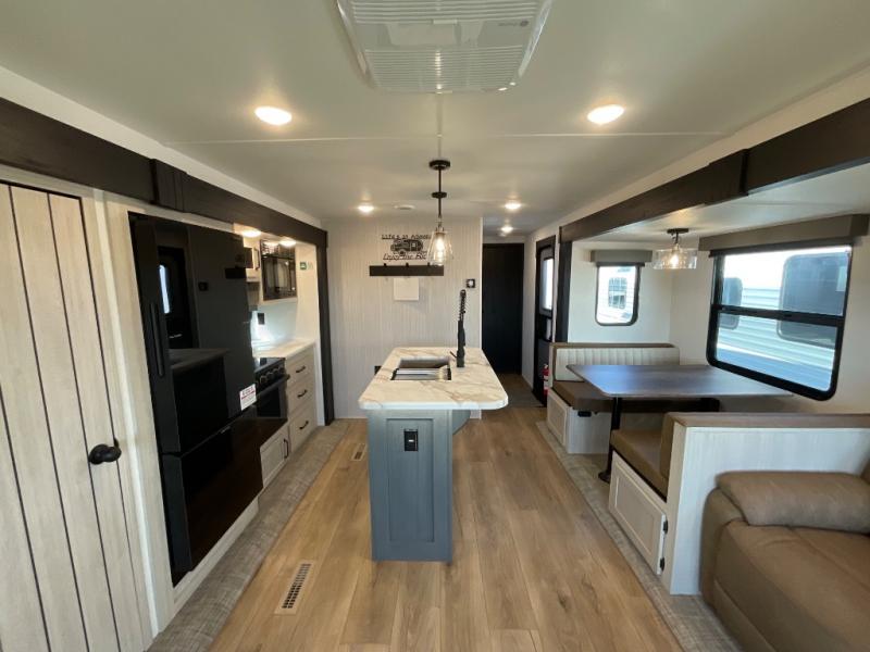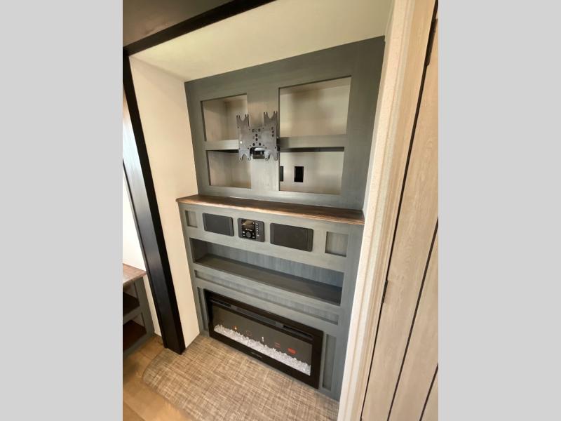 You're going to feel right at home in this travel trailer! The front private bedroom has a queen bed slide for a good night's rest, a dresser and front closet for your clothes, and another closet with washer and dryer prep. Freshen up each morning in the full bathroom with the 32" x 40" shower with a seat and then head to the kitchen to fry up some eggs on the stainless steel oven and range. You will also appreciate having a kitchen island for easier meal prep and a walk-in pantry to easily see your canned goods and snacks. The booth dinette offers a comfortable place to dine, play, and even sleep once converted. What better way to wind down your nights than to relax on either the rear sofa or in one of the two recliners across from the entertainment center with a fireplace!