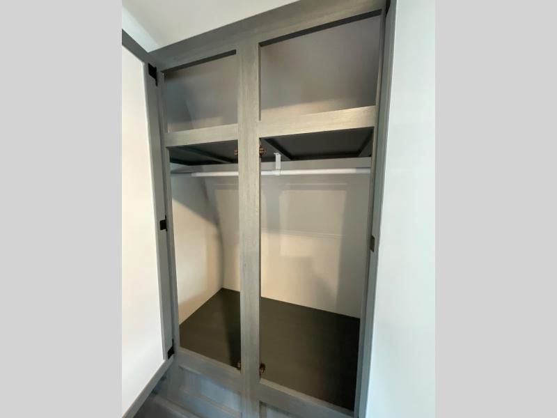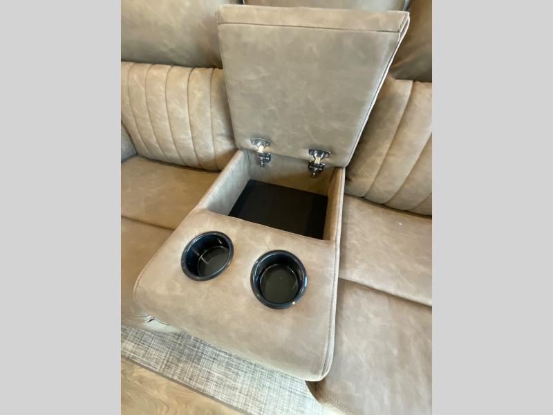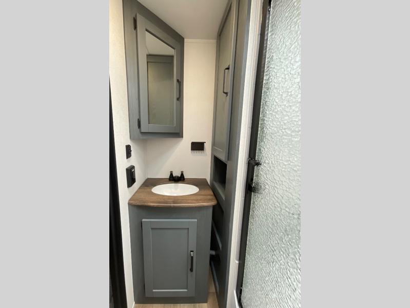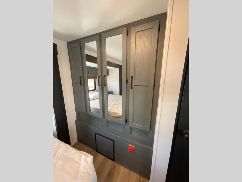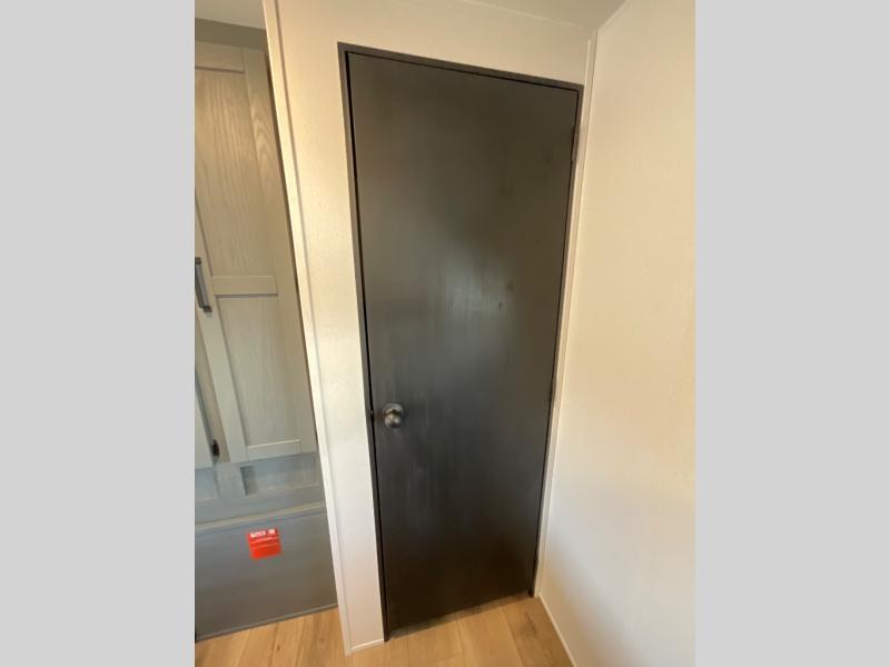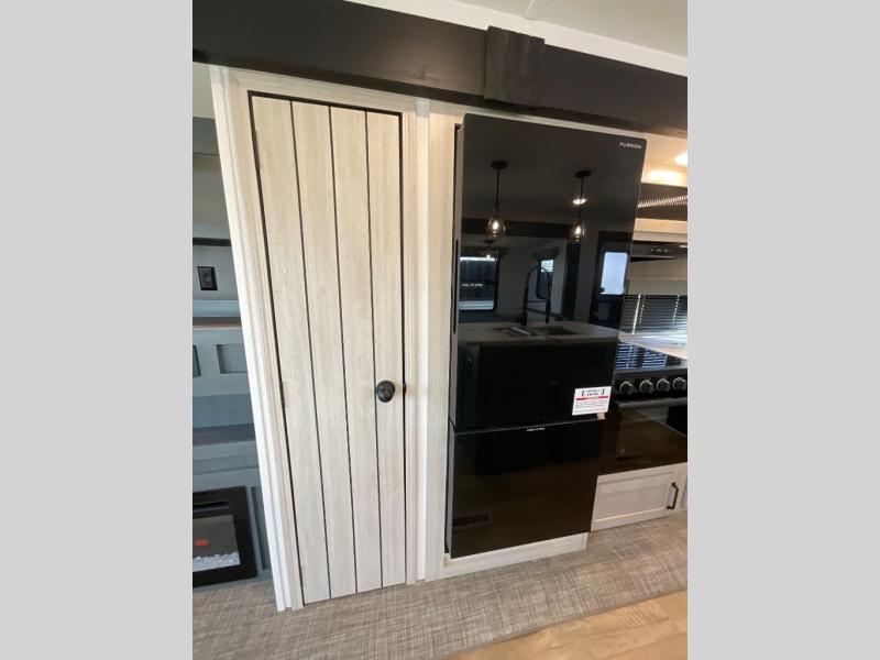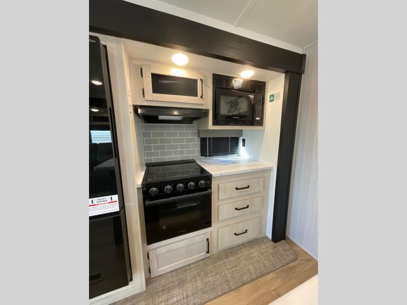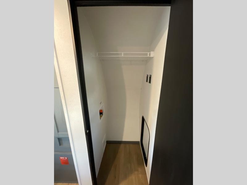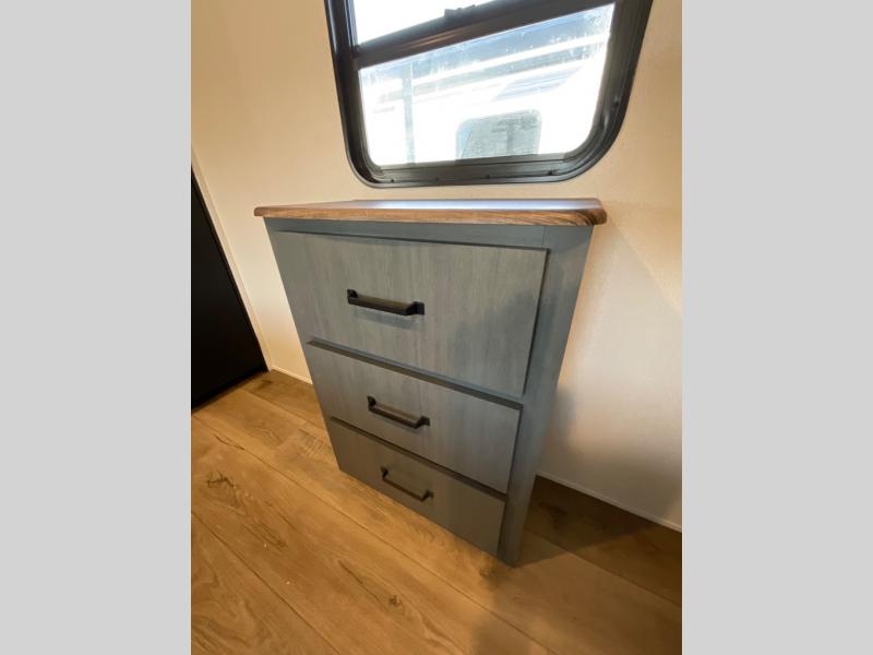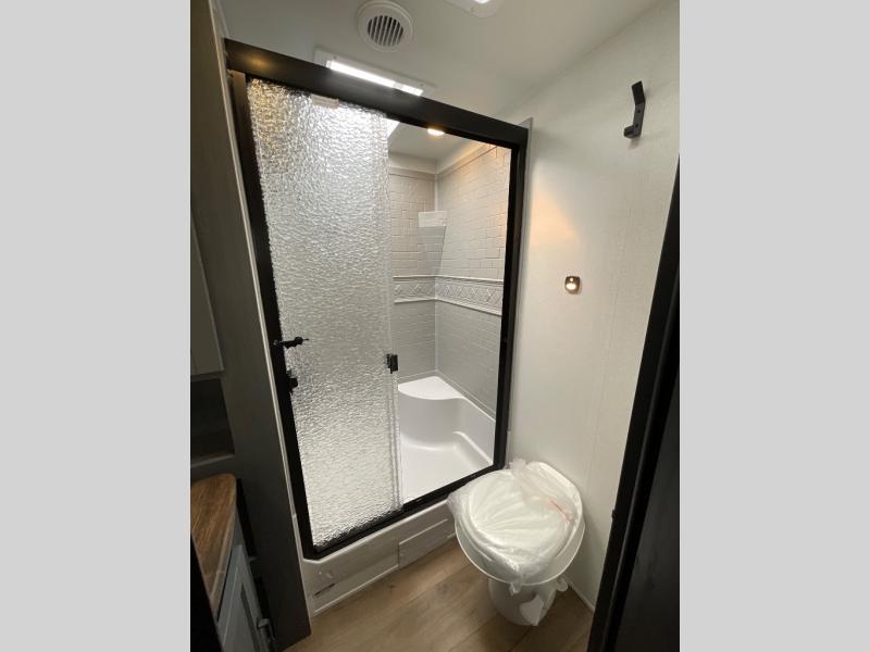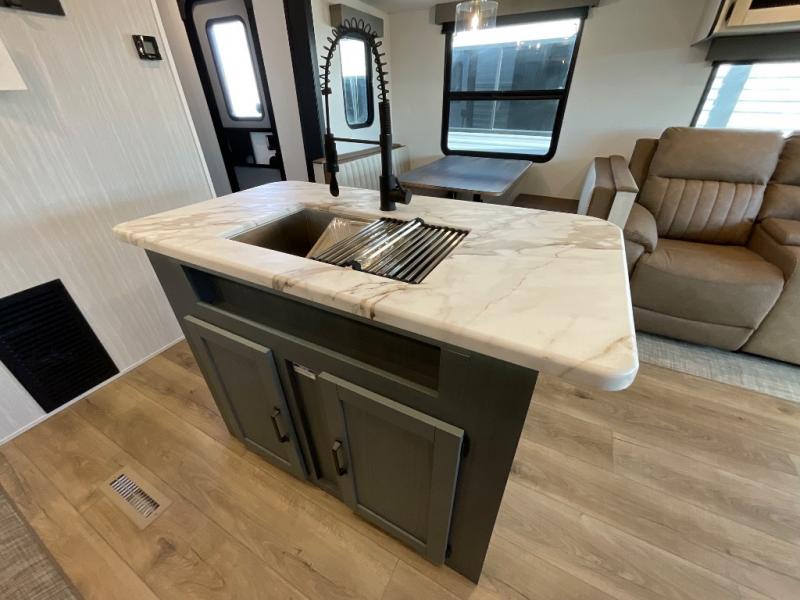 You're going to feel right at home in this travel trailer! The front private bedroom has a queen bed slide for a good night's rest, a dresser and front closet for your clothes, and another closet with washer and dryer prep. Freshen up each morning in the full bathroom with the 32" x 40" shower with a seat and then head to the kitchen to fry up some eggs on the stainless steel oven and range. You will also appreciate having a kitchen island for easier meal prep and a walk-in pantry to easily see your canned goods and snacks. The booth dinette offers a comfortable place to dine, play, and even sleep once converted. What better way to wind down your nights than to relax on either the rear sofa or in one of the two recliners across from the entertainment center with a fireplace!