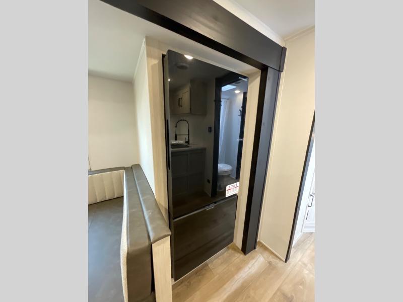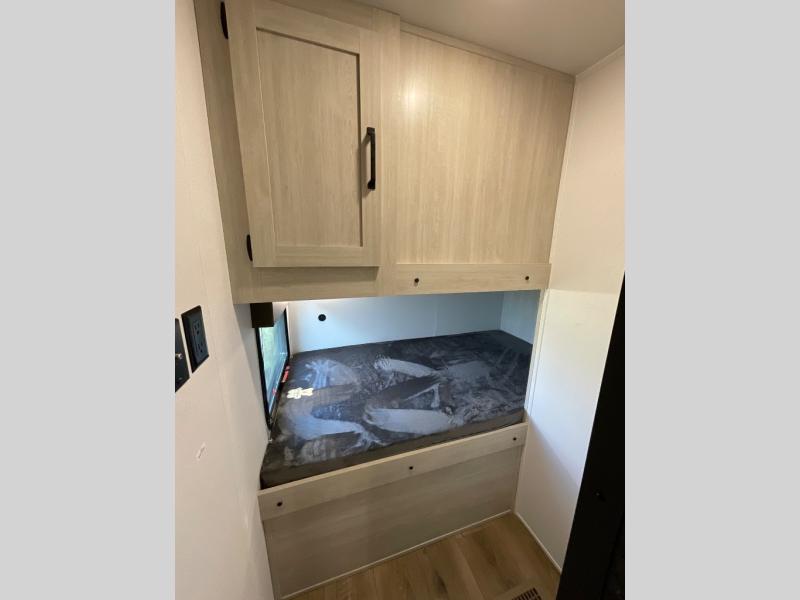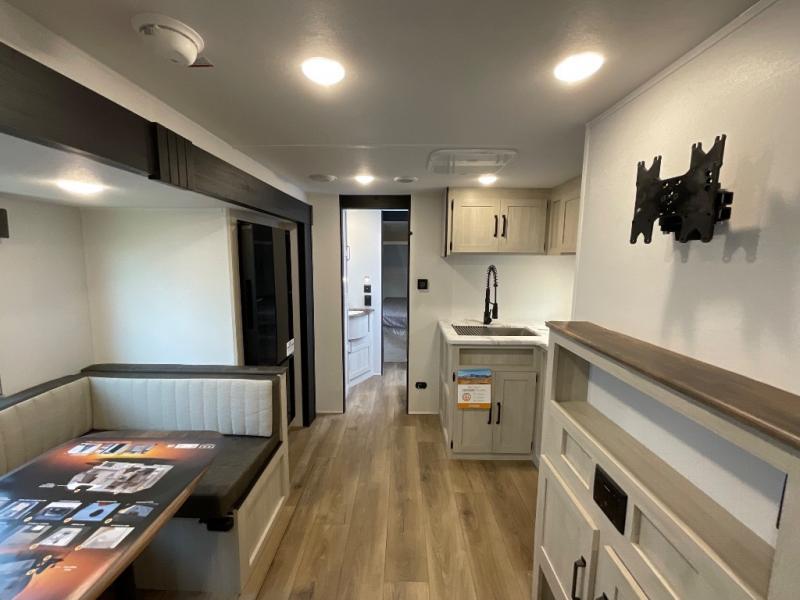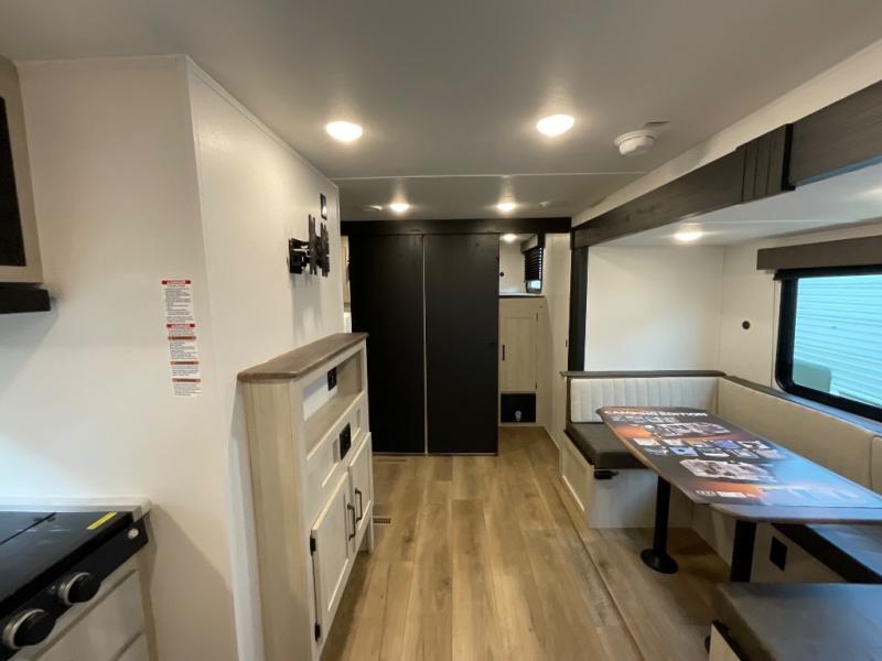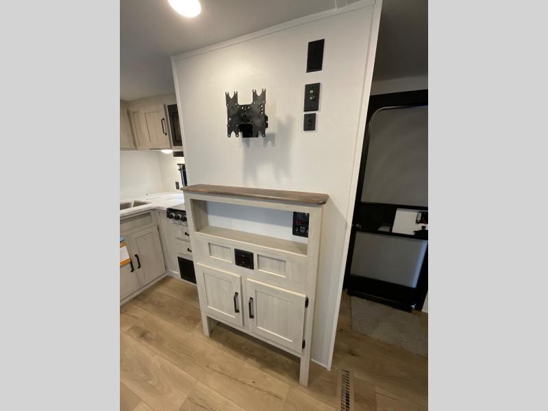 Your whole crew will love camping in this travel trailer since everyone can enjoy their own private space. The rear bunkhouses feature a private lower bunk room plus a private upper bunk room, each with their own door and a linen closet for storage space. The front master bedroom includes an RV queen bed, dual shirt closets, and easy access into the walk-thru bath. Head to the combined kitchen and living area to make dinner in the full kitchen, dine around the U-shaped dinette slide, and enjoy the fireplace! Outside, an optional mini kitchen with a griddle can be added if you choose, and you'll find outside storage compartments to keep all your gear secure!