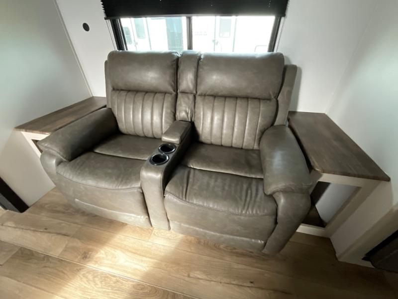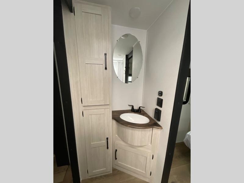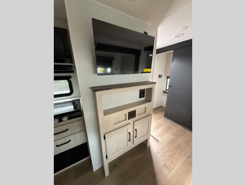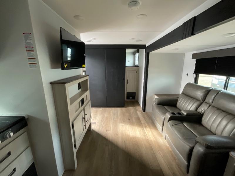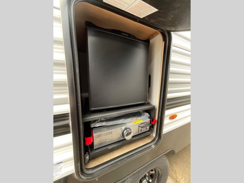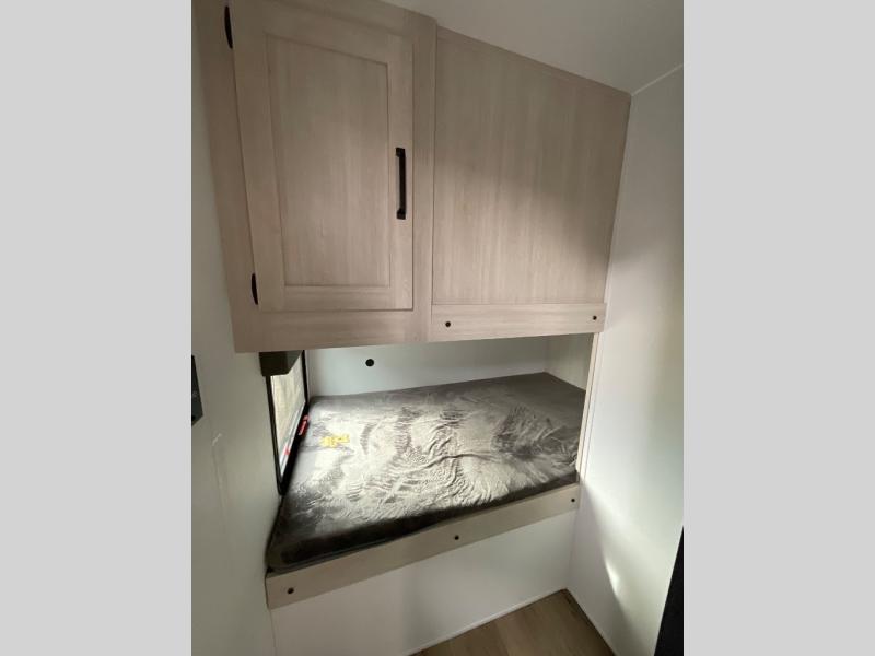 Your whole crew will love camping in this travel trailer since everyone can enjoy their own private space. The rear bunkhouses feature a private lower bunk room plus a private upper bunk room, each with their own door and a linen closet for storage space. The front master bedroom includes an RV queen bed, dual shirt closets, and easy access into the walk-thru bath. Head to the combined kitchen and living area to make dinner in the full kitchen, dine around the U-shaped dinette slide, and enjoy the fireplace! Outside, an optional micro kitchen with a grill can be added if you choose, and you'll find outside storage compartments to keep all your gear secure!