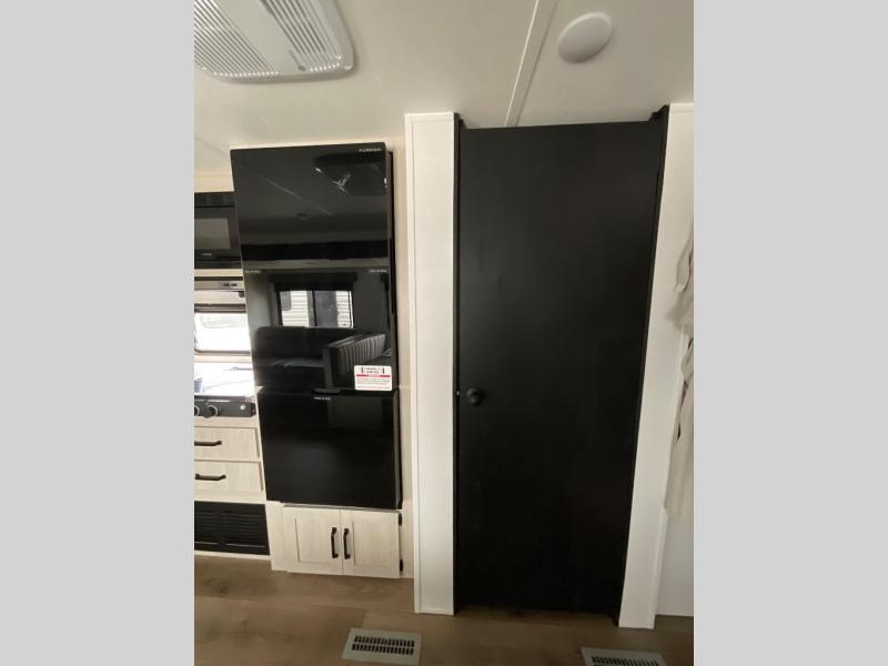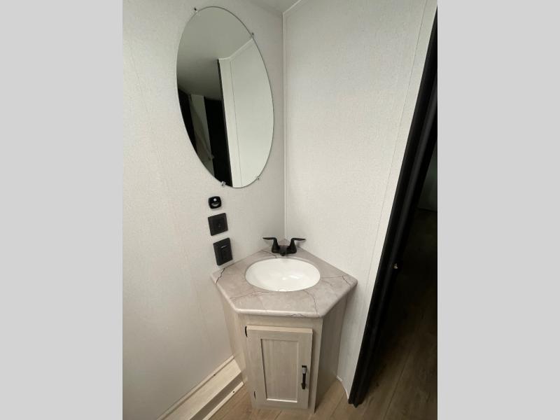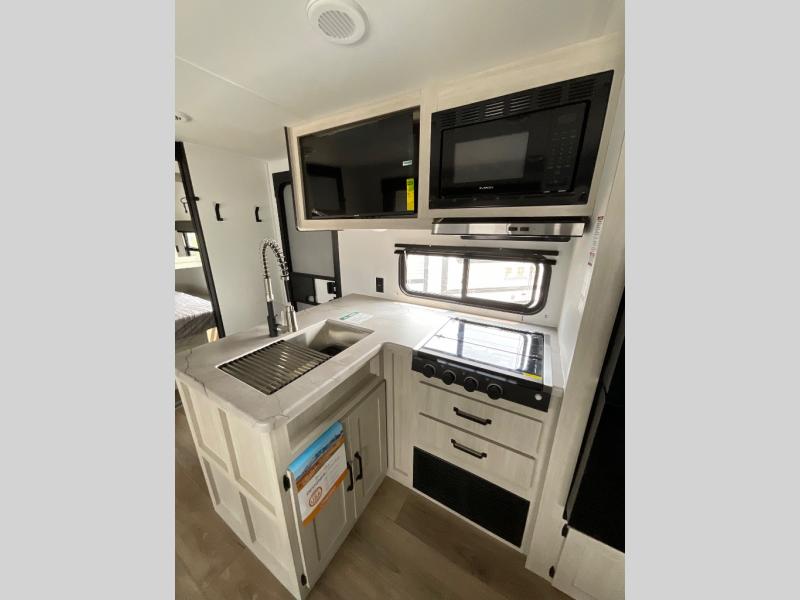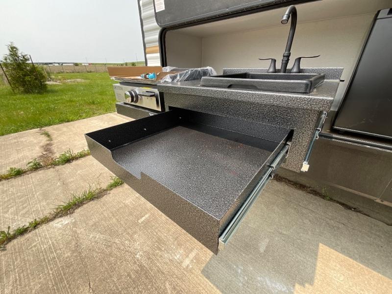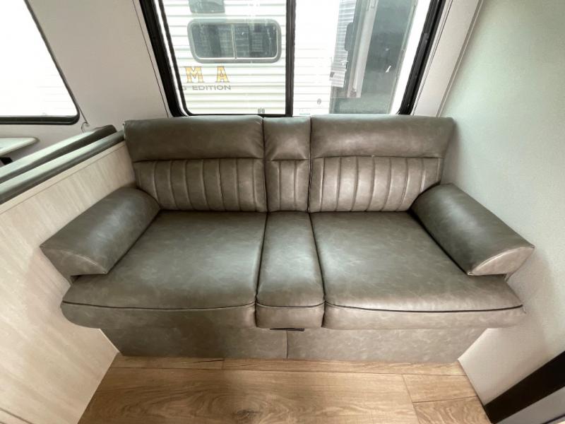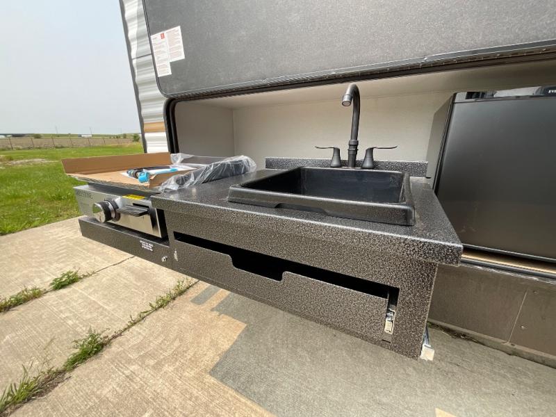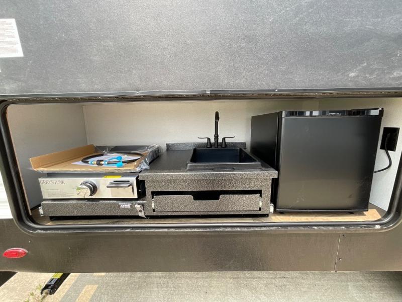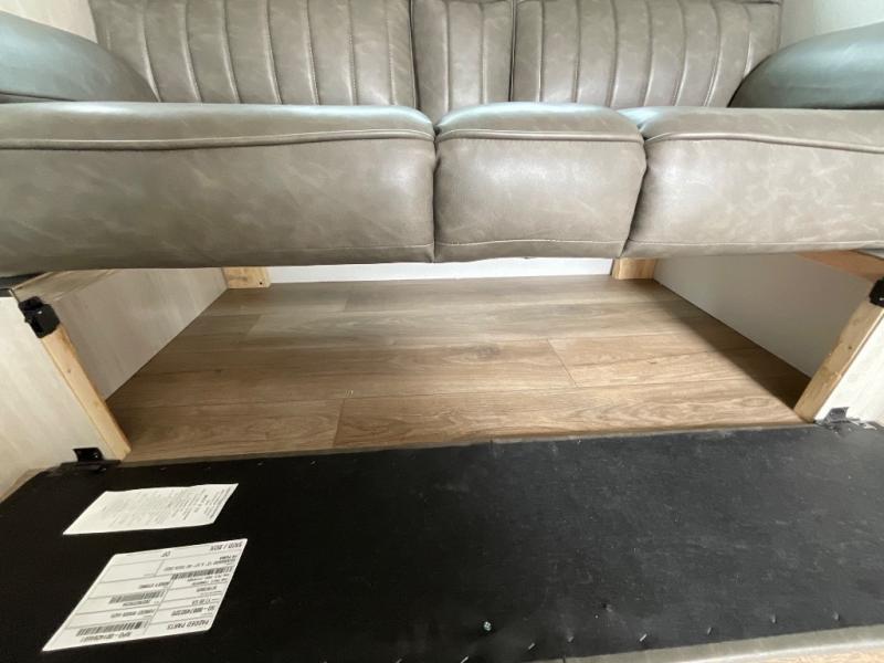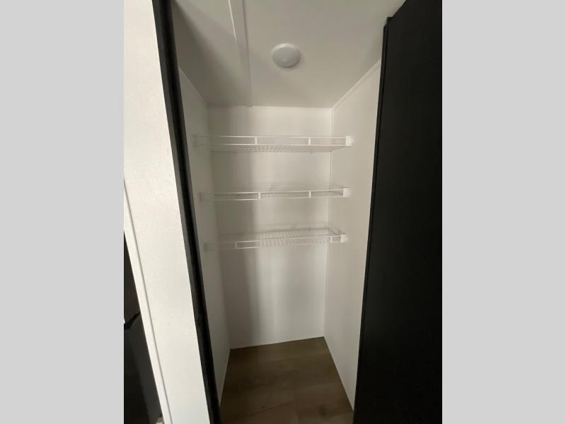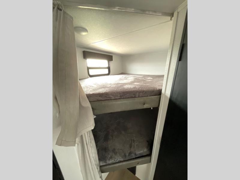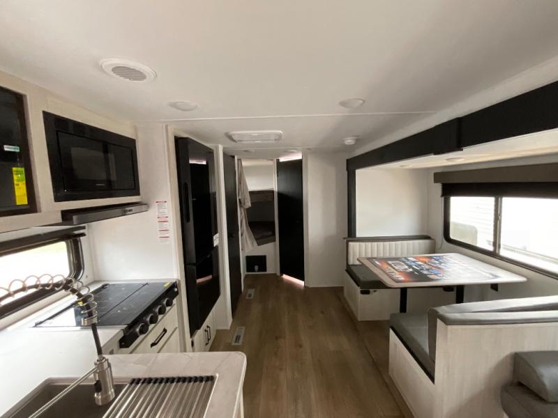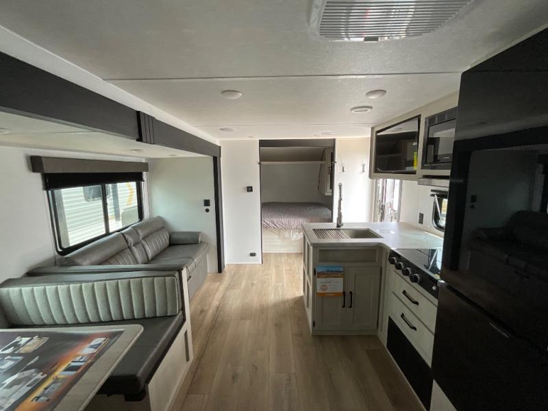 If you're looking for more space, this double axle unit features a large slide so you can walk about freely. Here, you'll find the booth dinette and sofa, which sit across from the optional TV if you want to enjoy movie nights. The full kitchen includes a stainless microwave and three burner cooktop to make meals, plus a pantry and 12V refrigerator for food storage. And an optional outside kitchen with a griddle can be added if you enjoy cooking outdoors! The kids or your guests will love the double-size bunks, and the full bath right beside the bunks includes a shower a seat for added comfort.