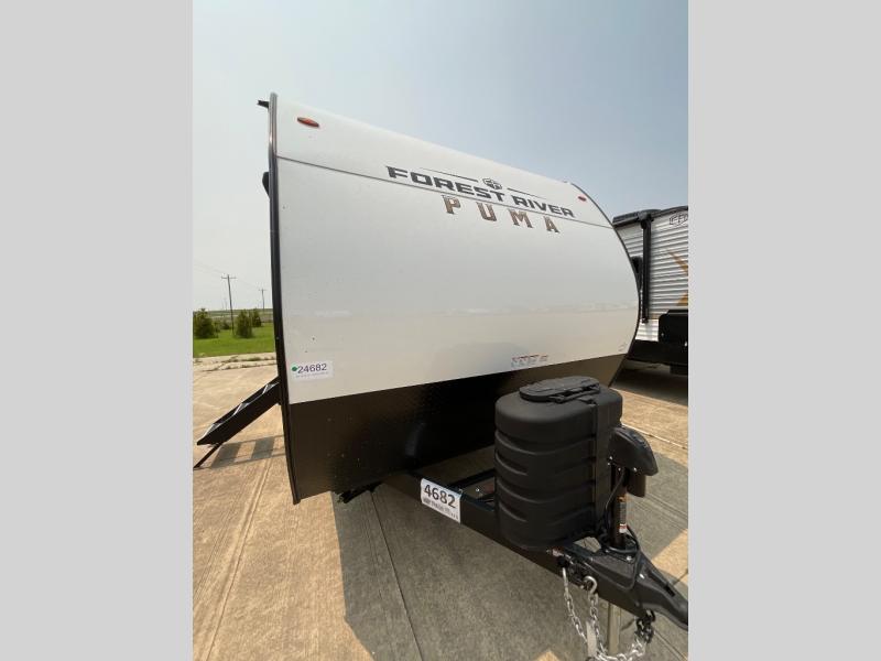 The Puma Camping Edition by Palomino offer an affordable travel trailer for rookie campers or seasoned RVers! They are built with 5/8" tongue and groove plywood flooring and a front diamond plate for added protection. There are also exterior clamp style door latches, back up camera prep, and 20 lb. LP bottles. Head inside to find Thermofoil countertops with a smooth drop edge, bedroom USB ports and outlets, and a GE appliance and kitchen package.