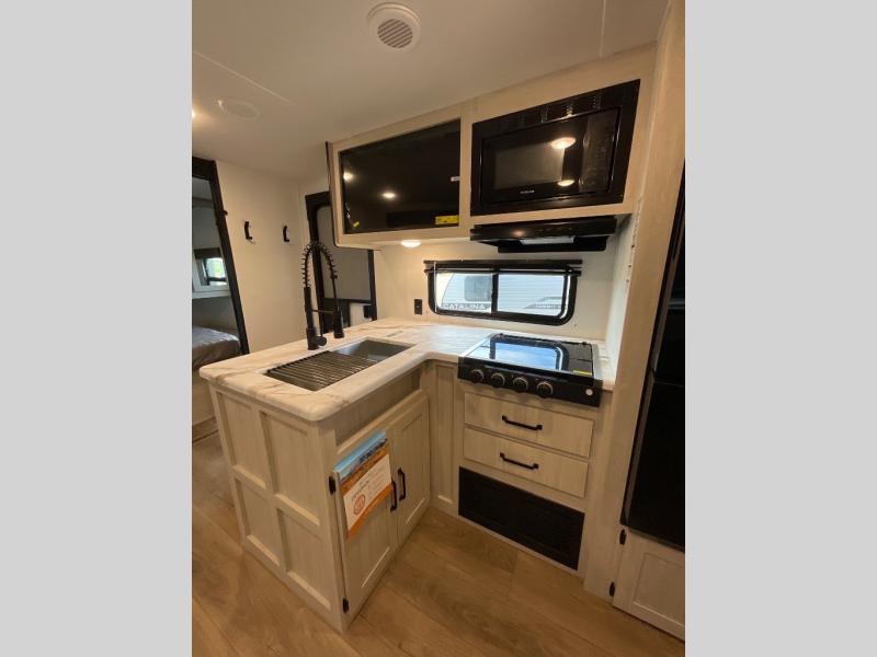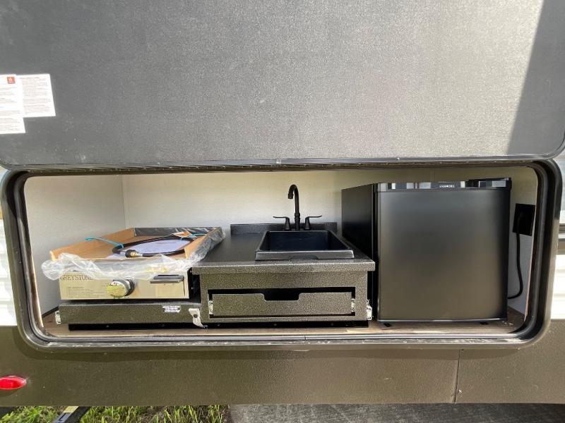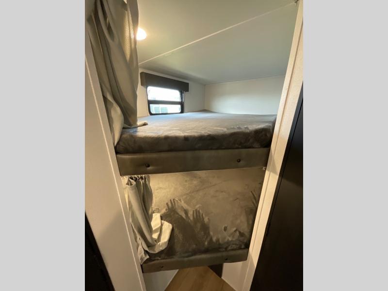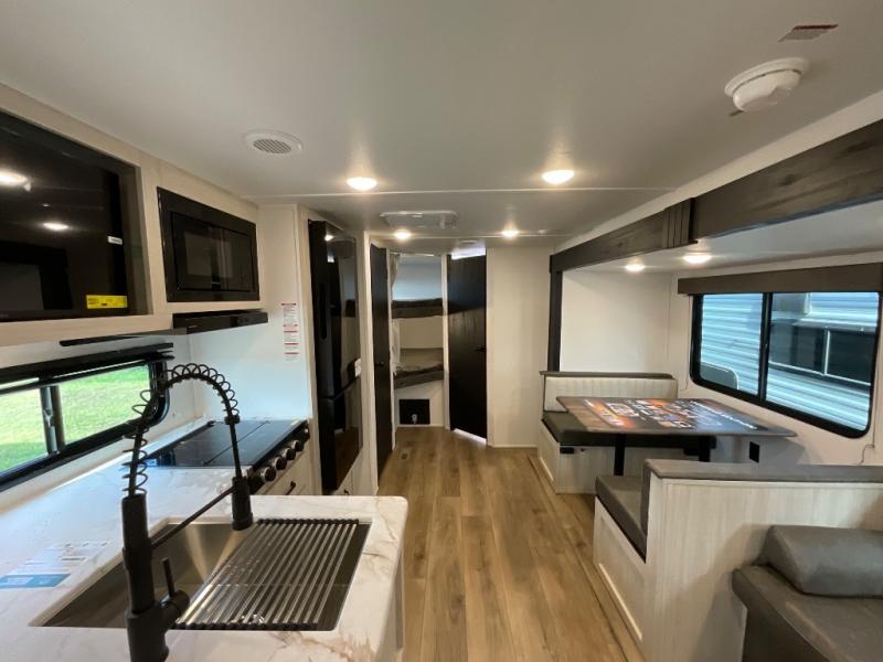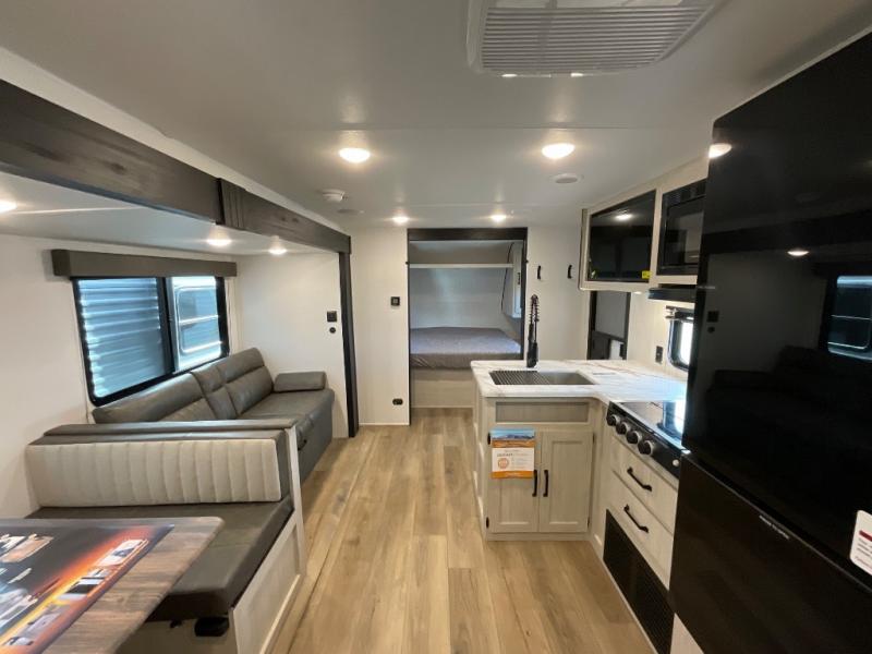 If you're looking for more space, this double axle unit features a large slide so you can walk about freely. Here, you'll find the booth dinette and sofa, which sit across from the optional TV if you want to enjoy movie nights. The full kitchen includes a stainless microwave and three burner cooktop to make meals, plus a pantry and 12V refrigerator for food storage. And an optional outside kitchen with a griddle can be added if you enjoy cooking outdoors! The kids or your guests will love the double-size bunks, and the full bath right beside the bunks includes a shower a seat for added comfort.